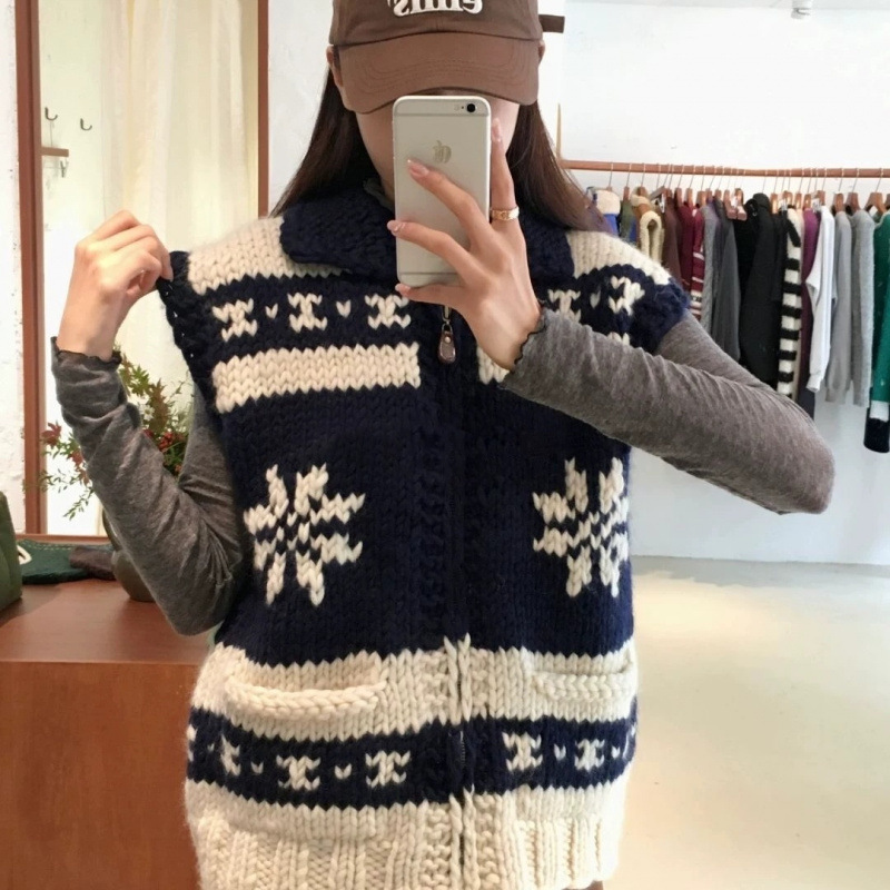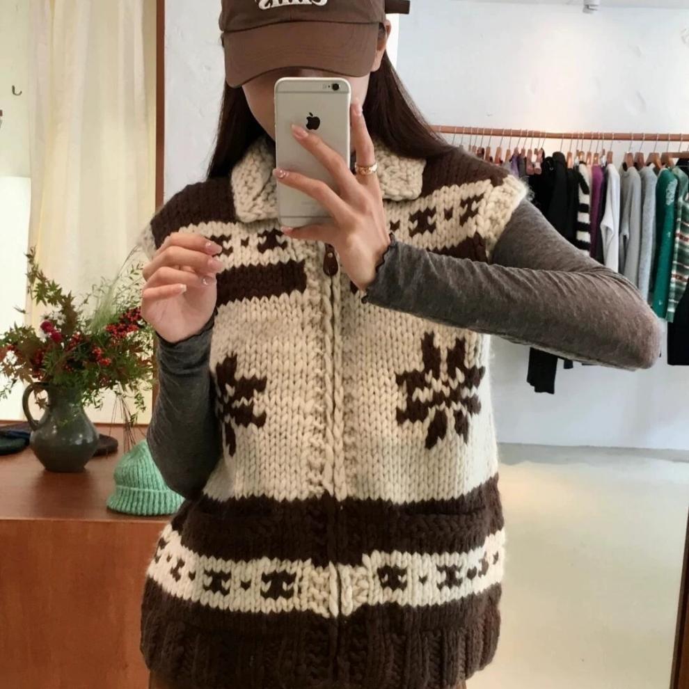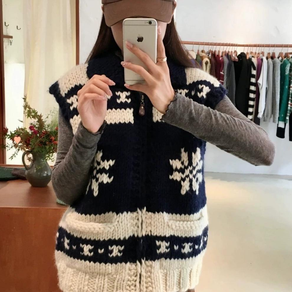 첫 번째 라인 빈티지 페어 아일랜드 자카드 라펠 니트 조끼 여성 가을과 겨울 게으른 느슨한 쌓인 스웨터 조끼