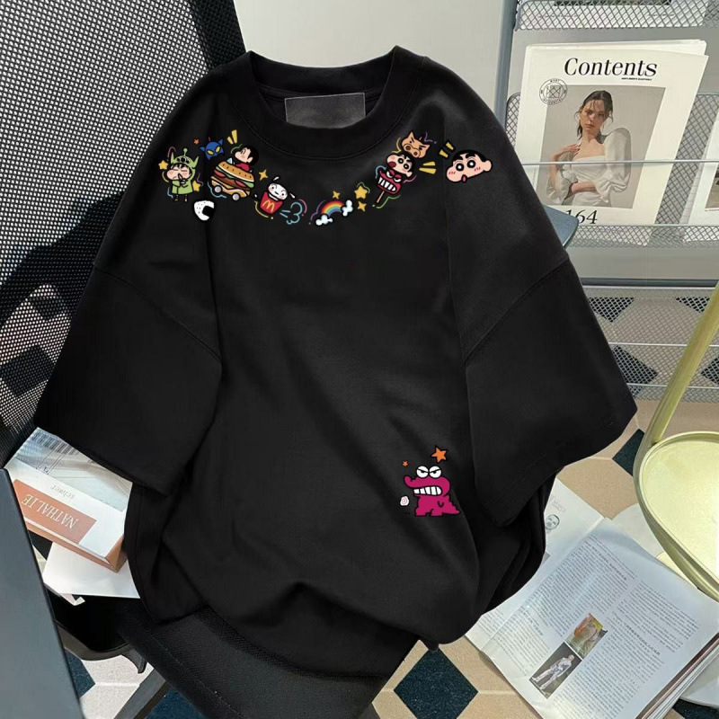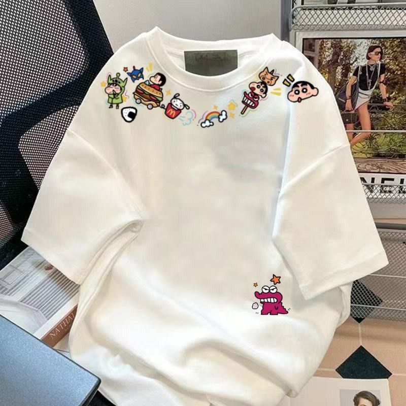 일본 창작 크레용 작은 새 만화 무거운 여름 새 인쇄 느슨한 5 점 반팔 미국 복고풍 셔츠 2