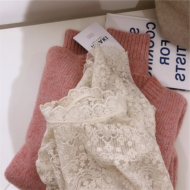 레이스 셔츠 여자 2025 년 초가을 새 반쪽 터틀넥 할로우 긴팔 슬림핏 한국 동대문베이스 셔츠탑