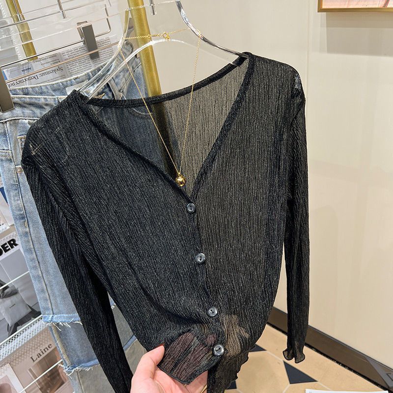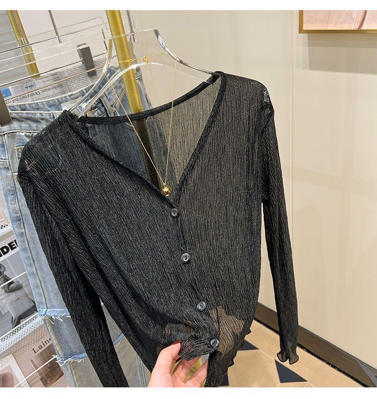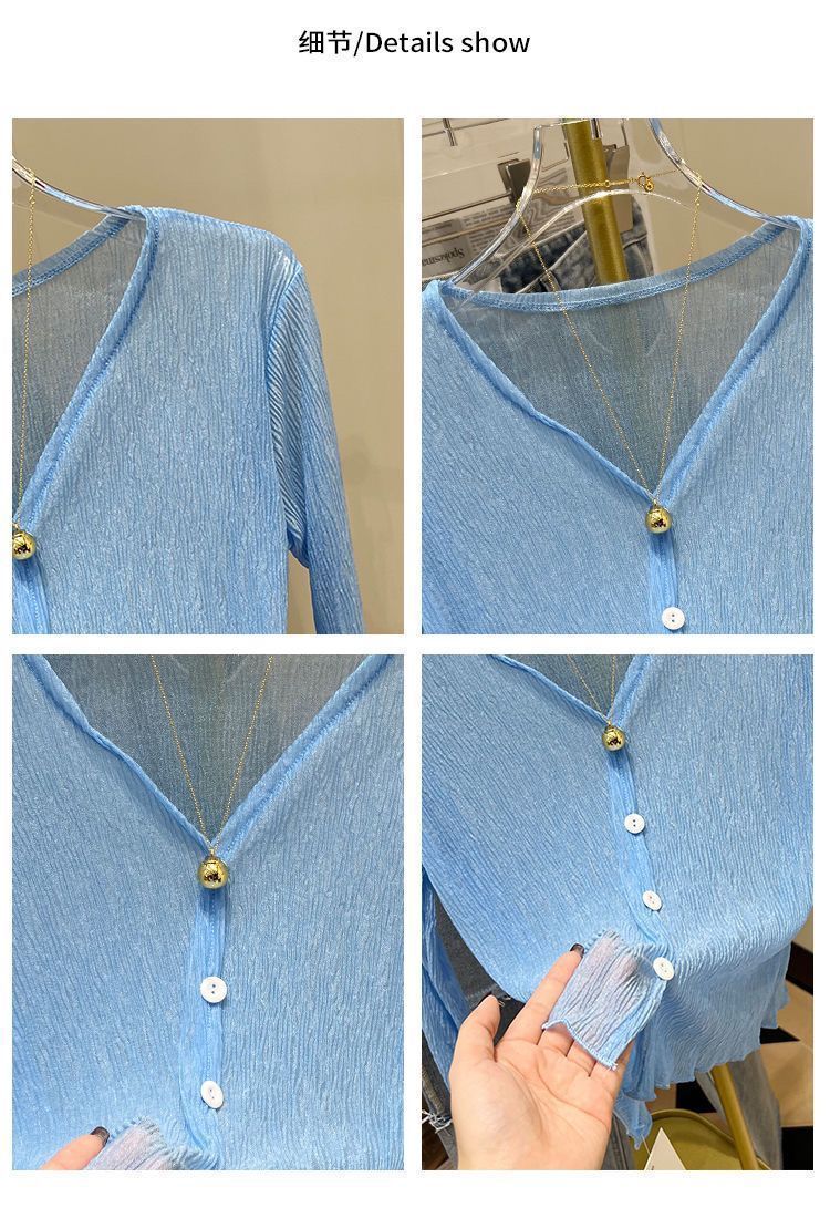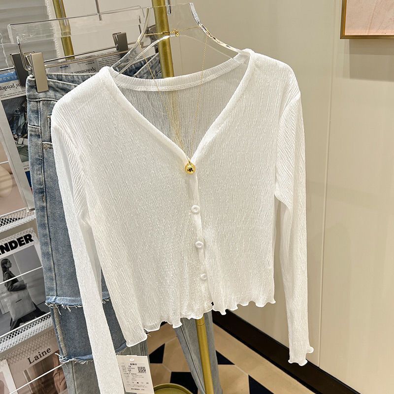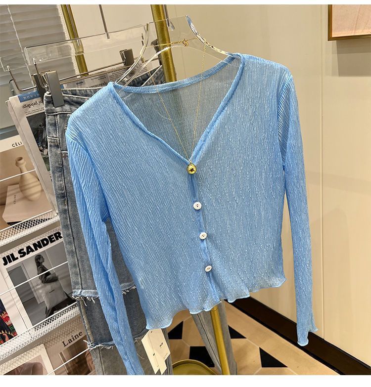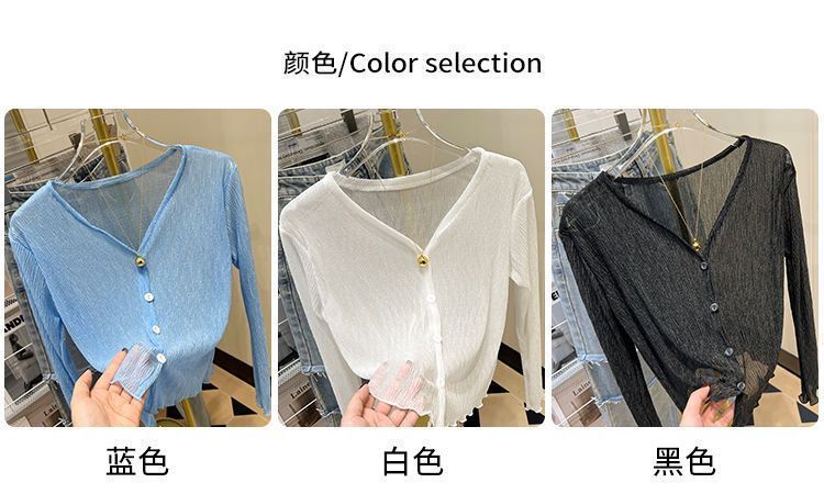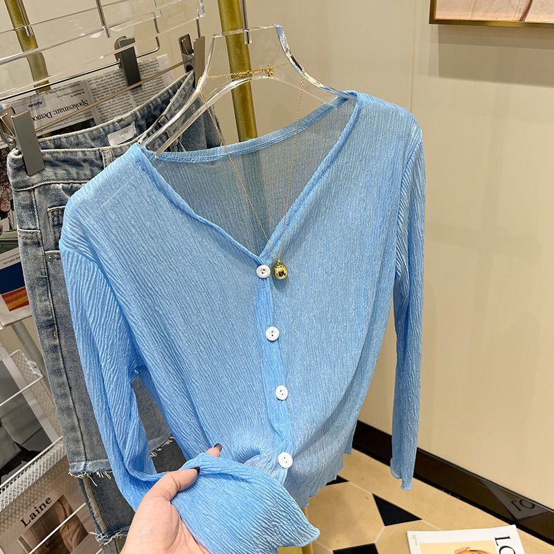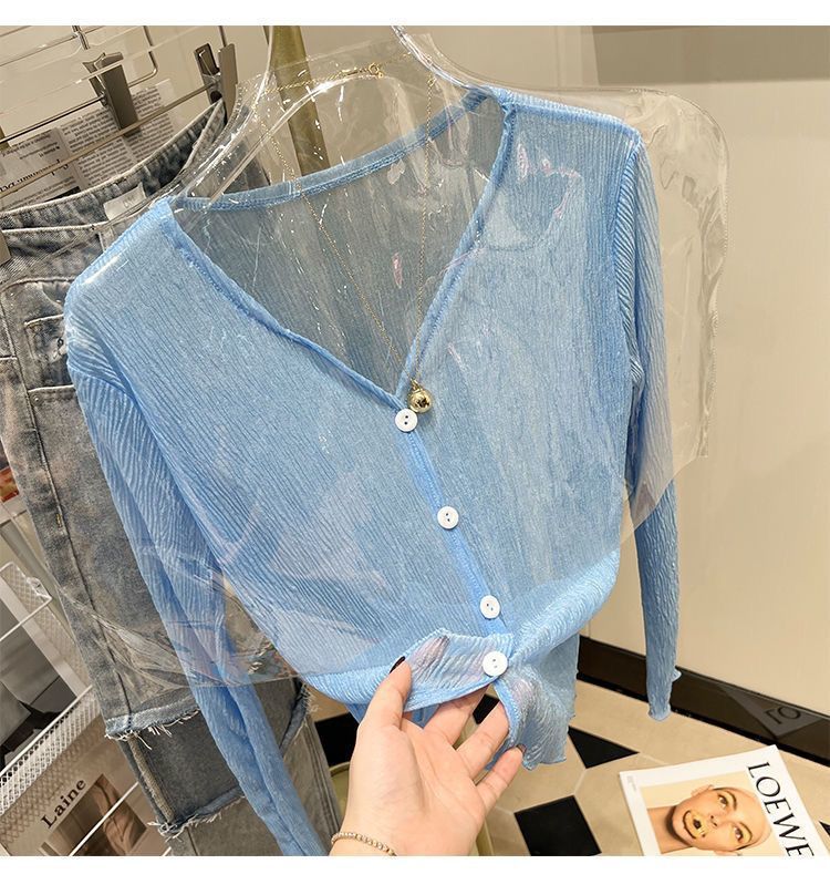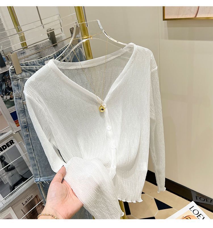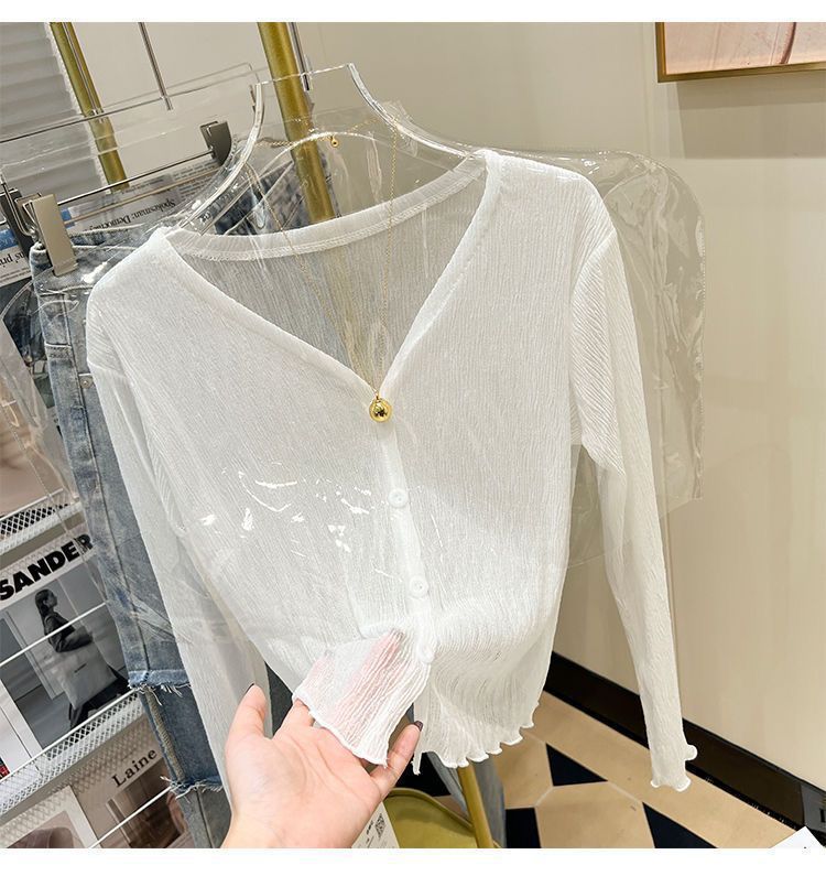 선스크린 코트 V-Neck 최고 여성 여름 얇은 목도리 아이스 실크 카디건 긴 소매 화이트 외부 짧은 에어컨 셔츠