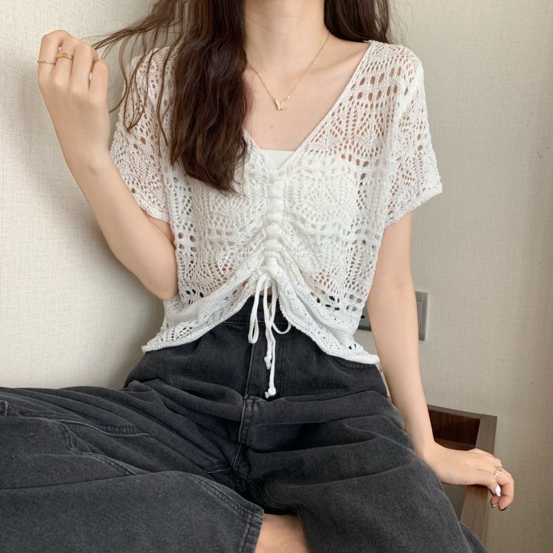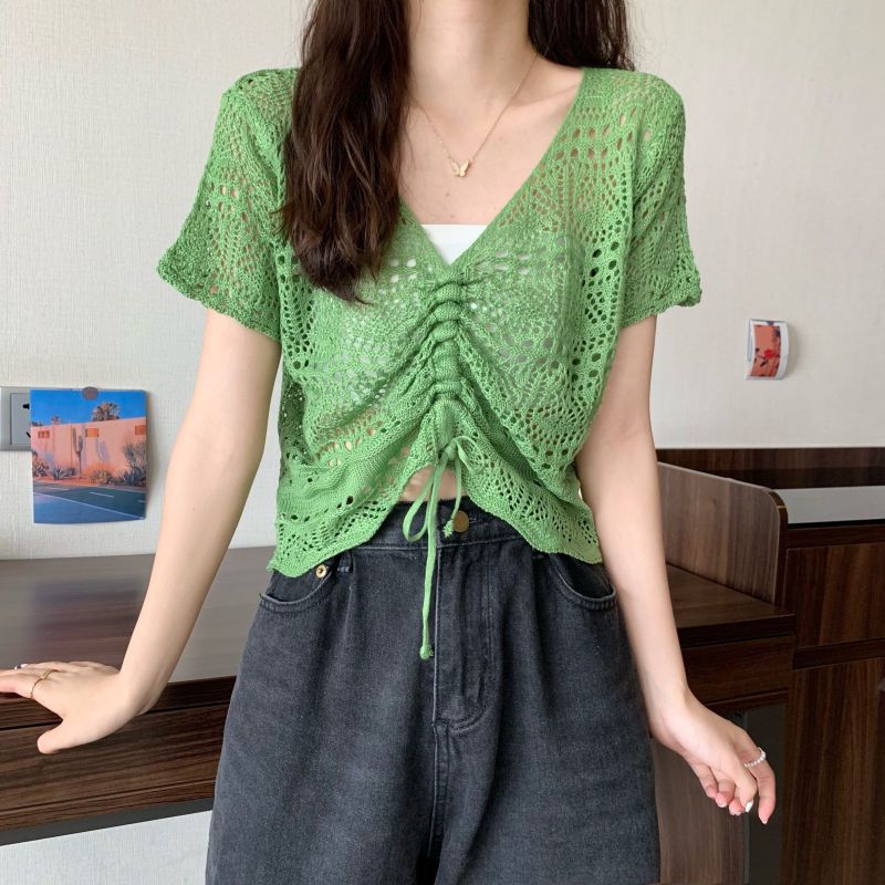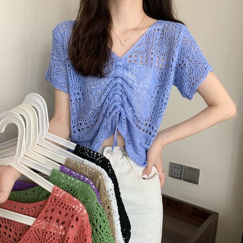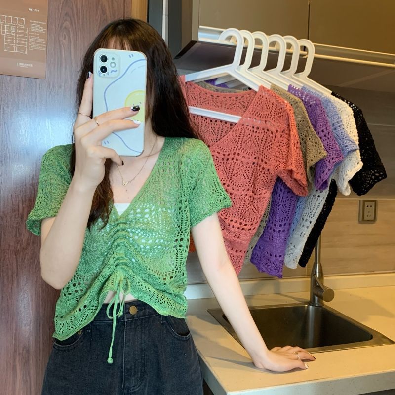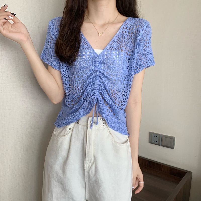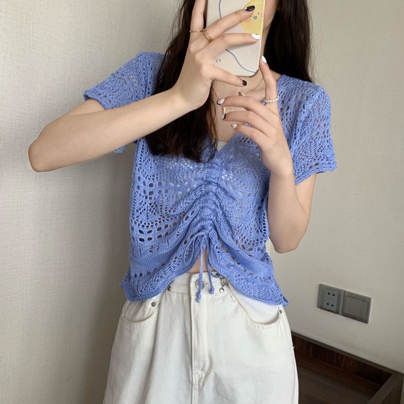 할로우 아웃 얇은 반팔 선 스크린 니트 블라우스 여성용 한국식 느슨한 V 넥 드로우 스트링 높은 허리 쇼트 탑스토어 가기