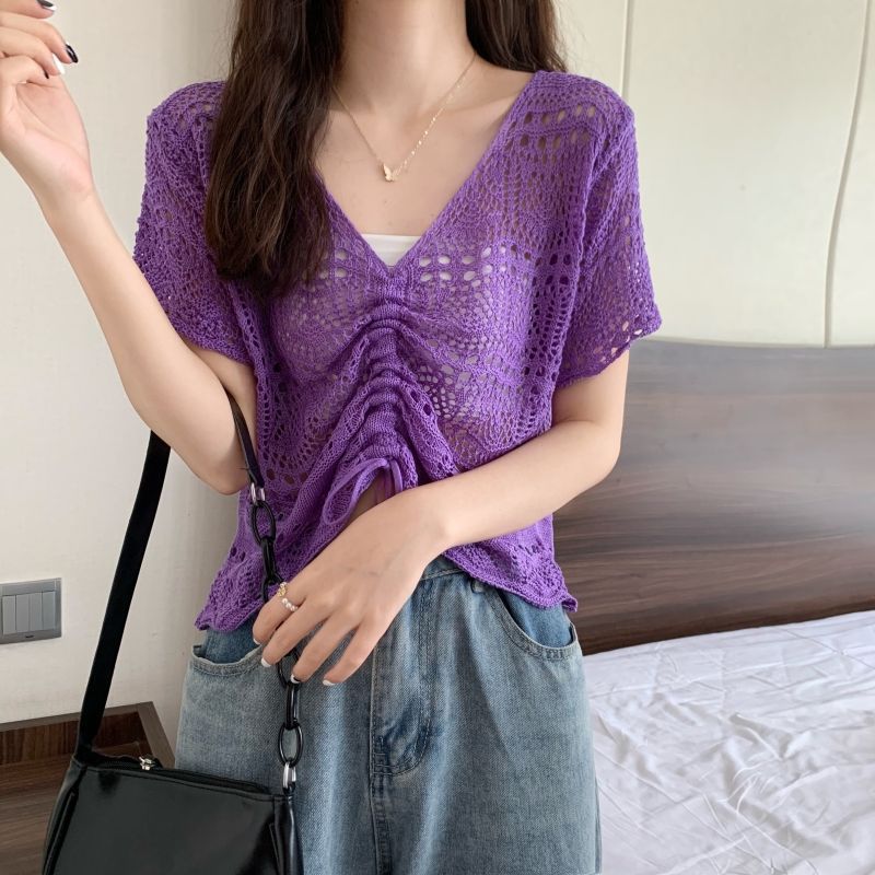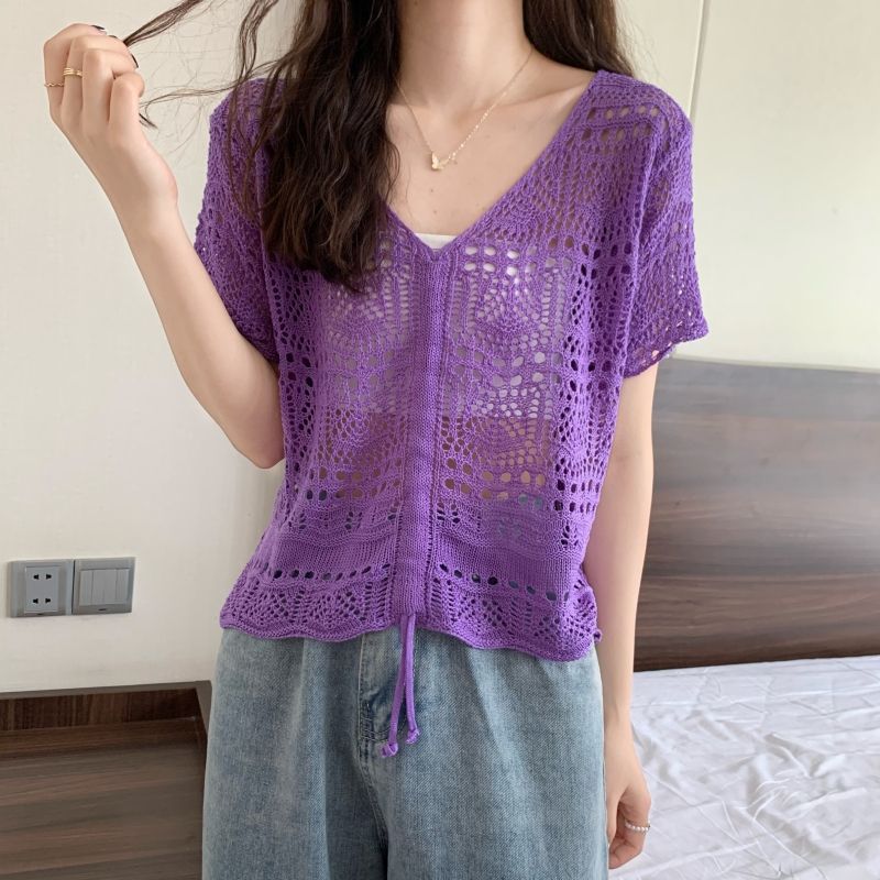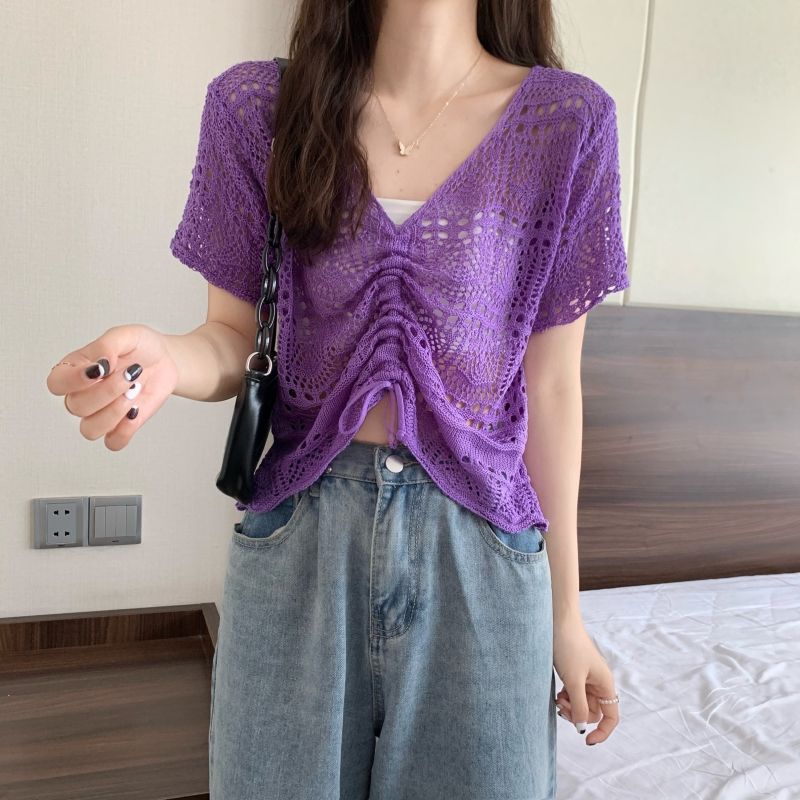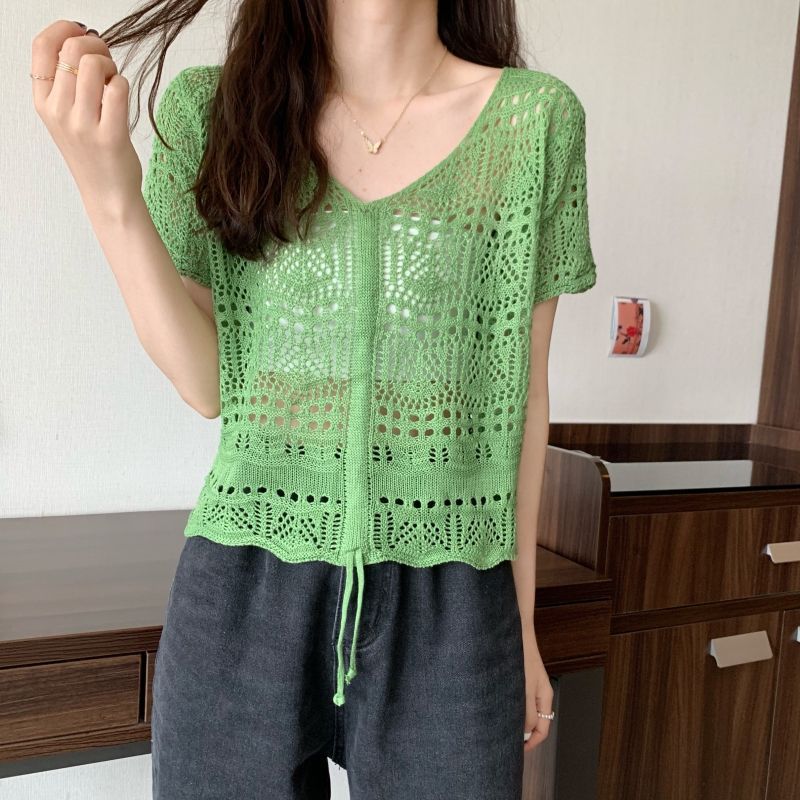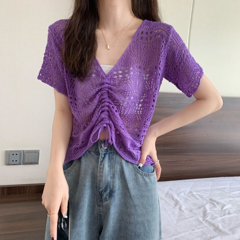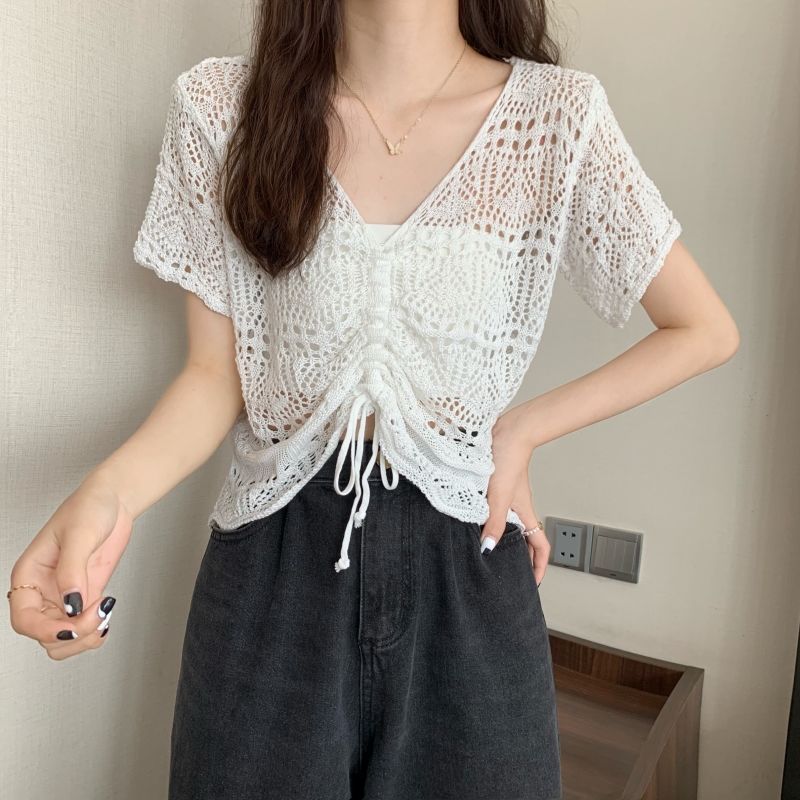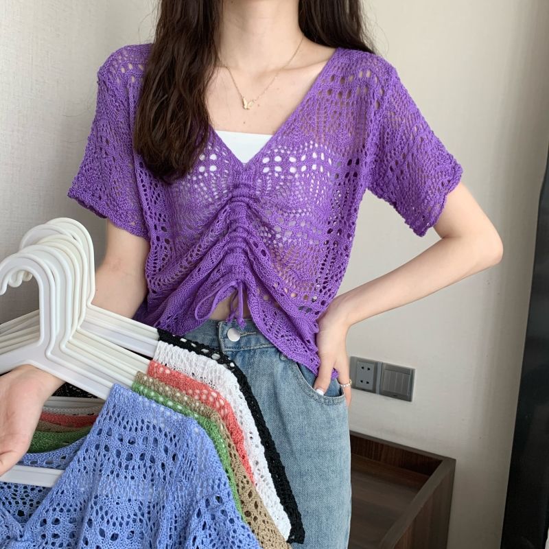할로우 아웃 얇은 반팔 선 스크린 니트 블라우스 여성용 한국식 느슨한 V 넥 드로우 스트링 높은 허리 쇼트 탑스토어 가기