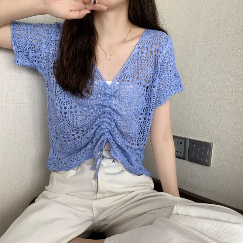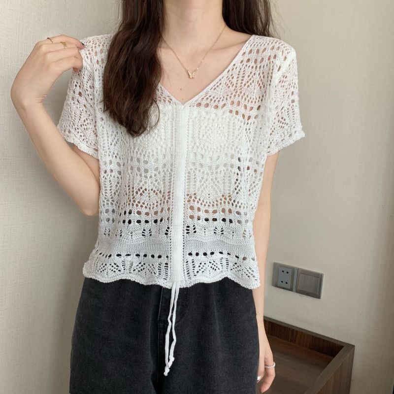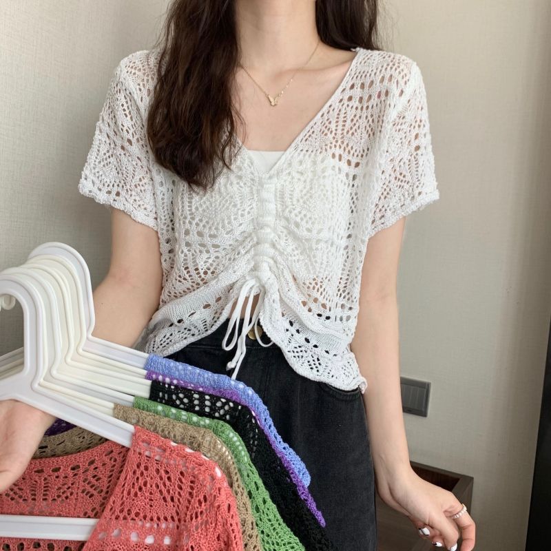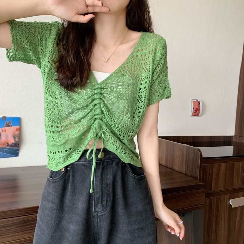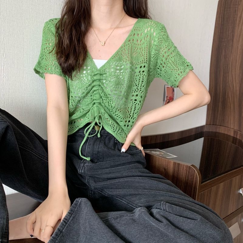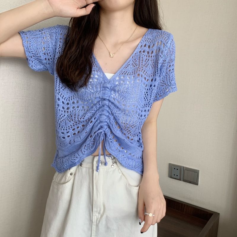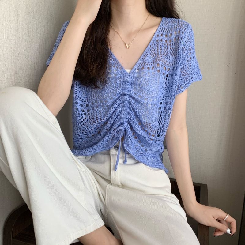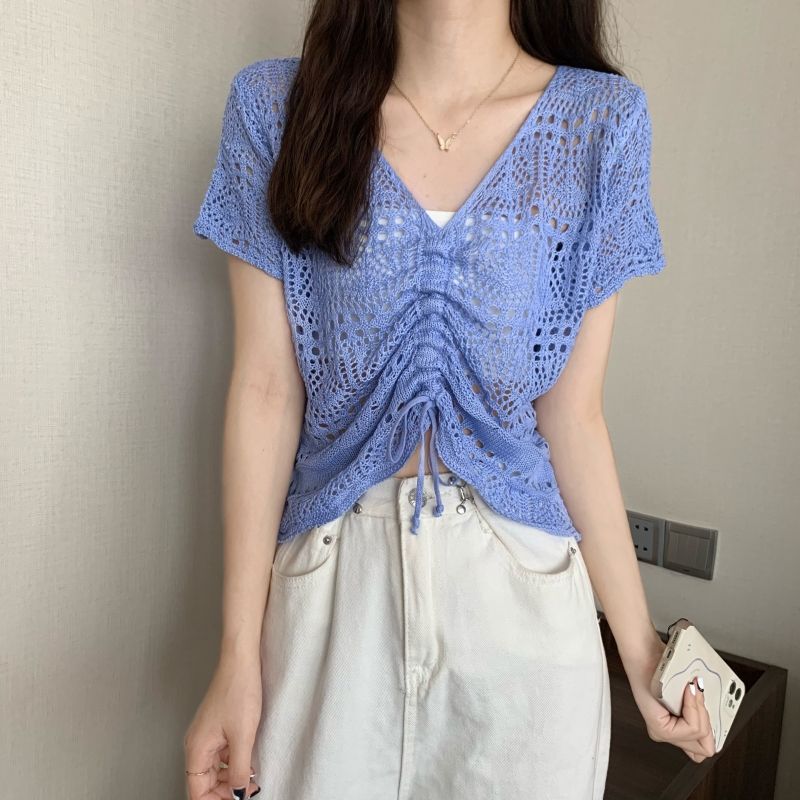 할로우 아웃 얇은 반팔 선 스크린 니트 블라우스 여성용 한국식 느슨한 V 넥 드로우 스트링 높은 허리 쇼트 탑