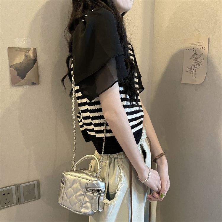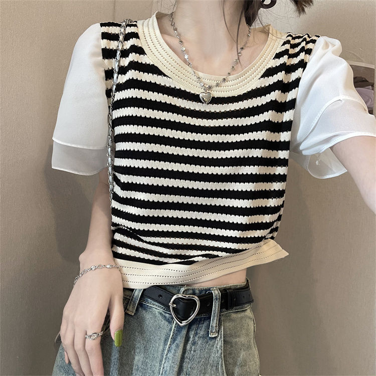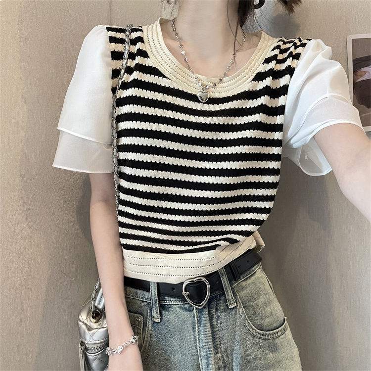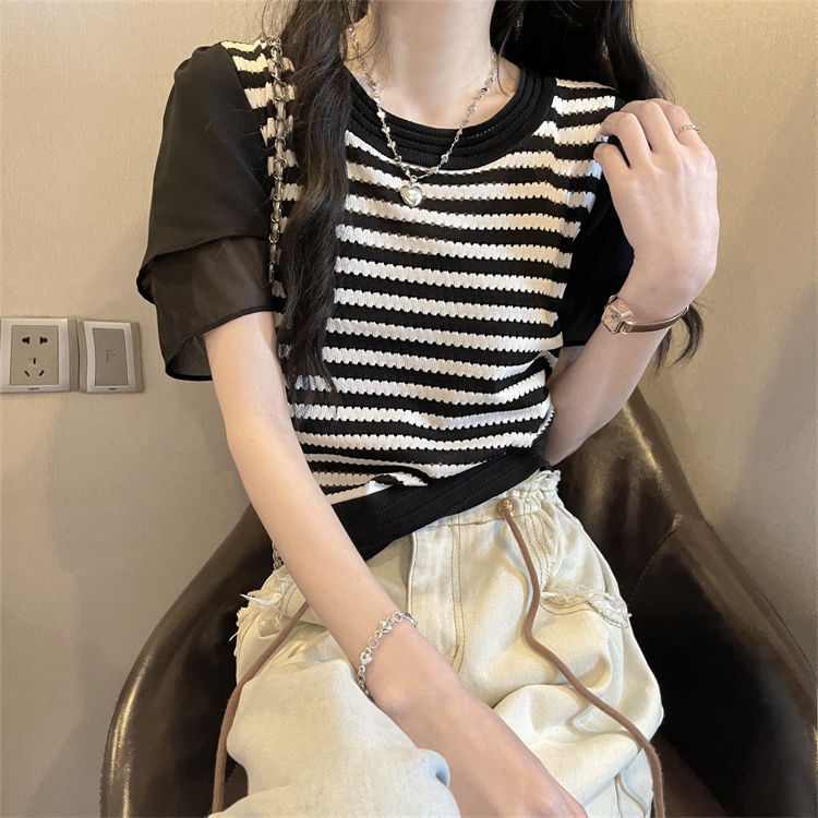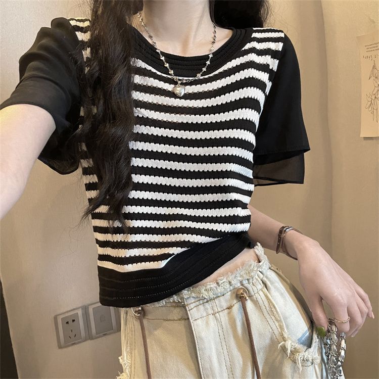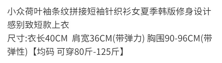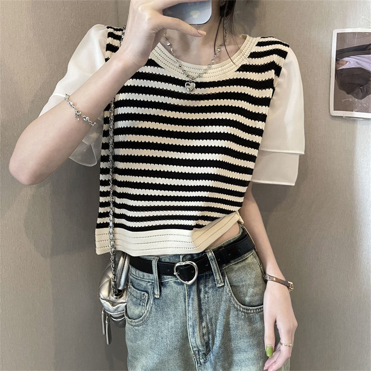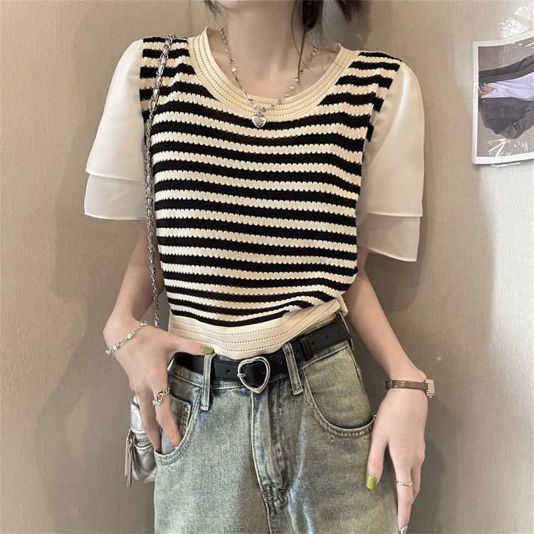 니치 로터스 슬리브 스트라이프 바느질 반팔 스웨터 여성 여름 한국식 슬림 핏 디자인 세련된 쇼트 탑스토어 가기