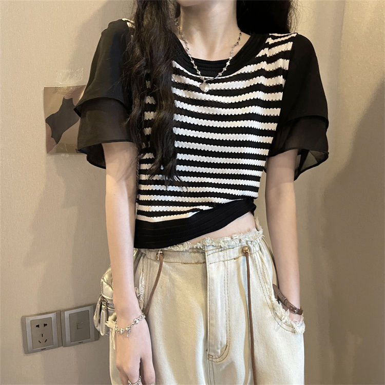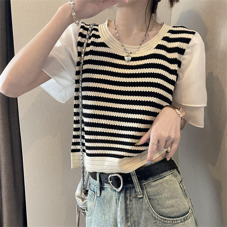 니치 로터스 슬리브 스트라이프 바느질 반팔 스웨터 여성 여름 한국식 슬림 핏 디자인 세련된 쇼트 탑