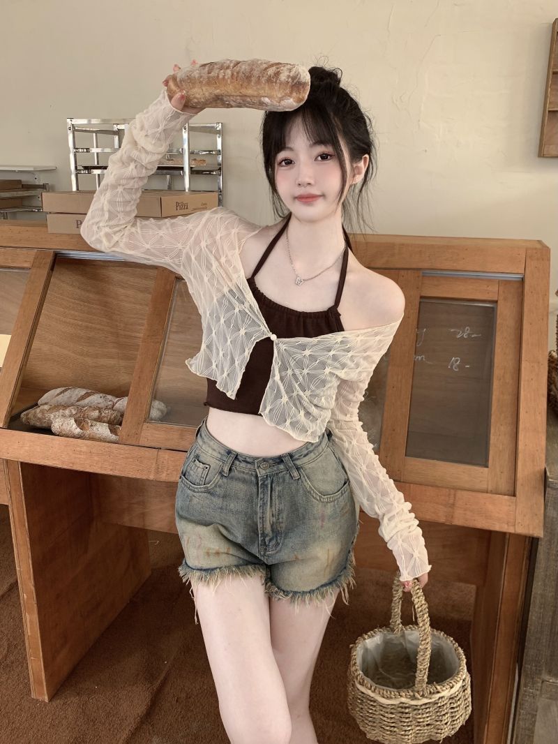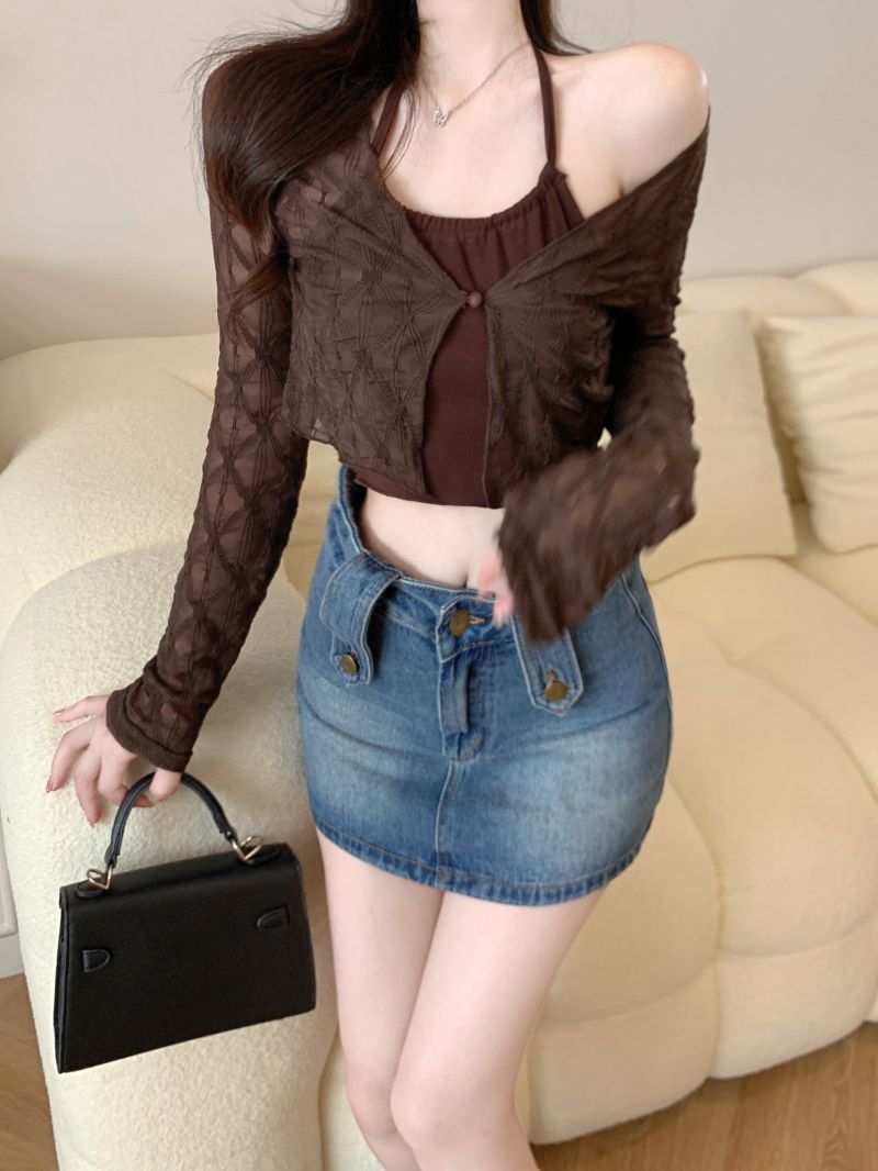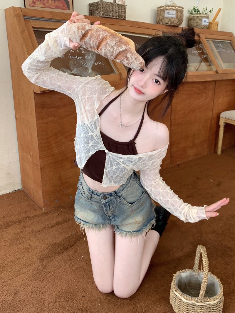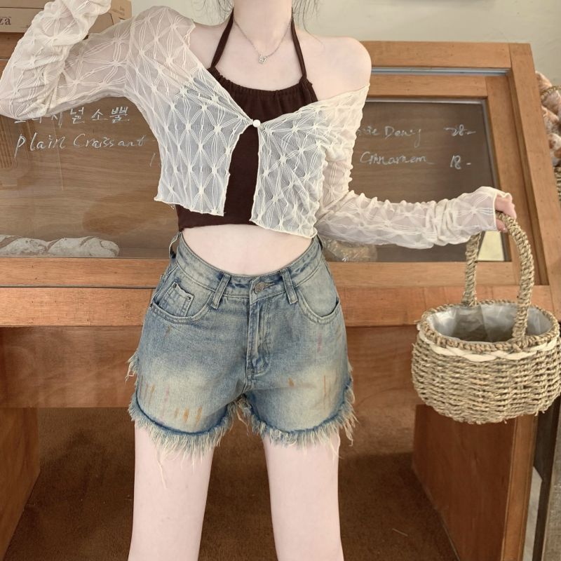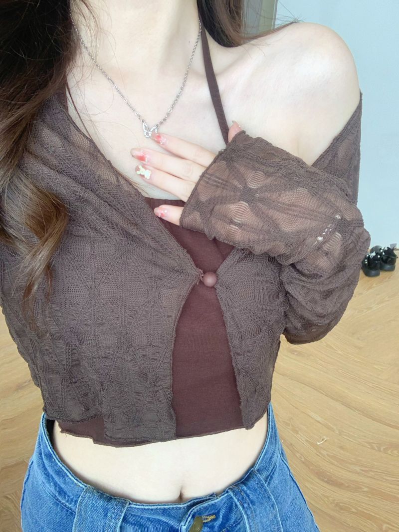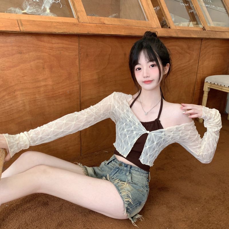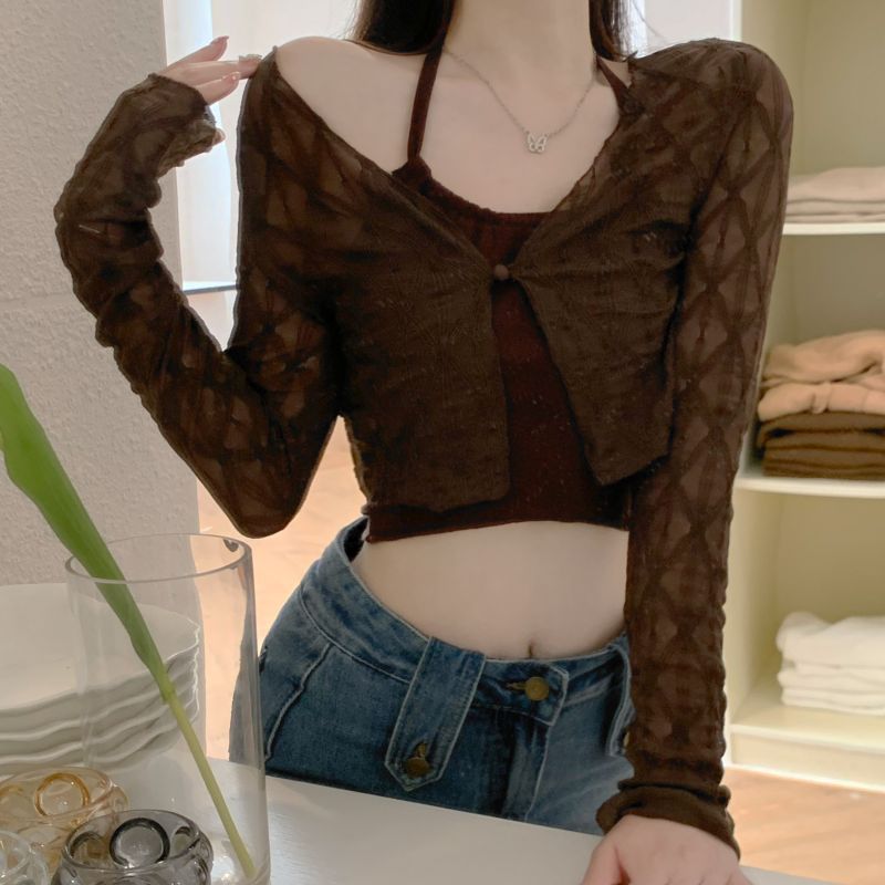 달콤하고 매운 스타일 Halter Camisole 여성의 여름 하이 엔드 짧은 슬리밍 긴팔 선 스크린 카디건 세트 투피스 세트