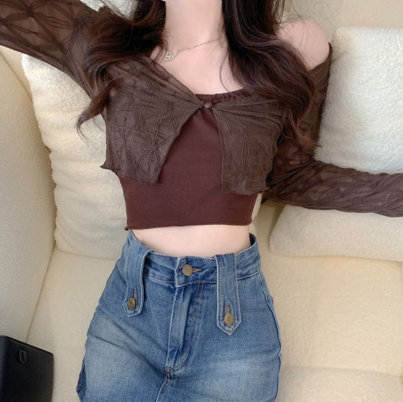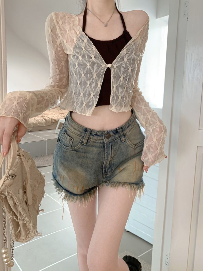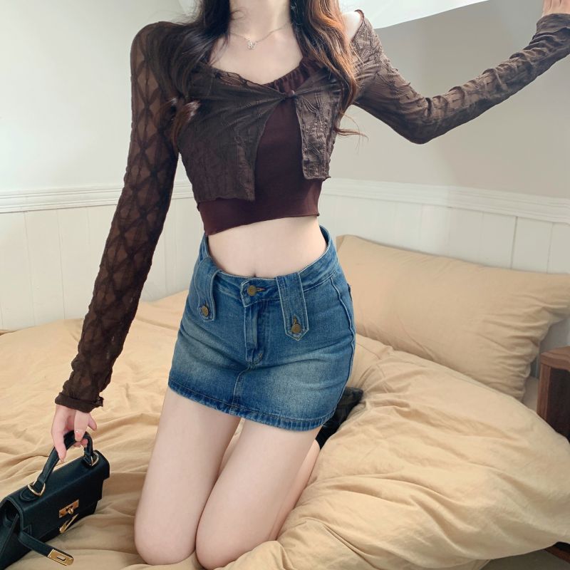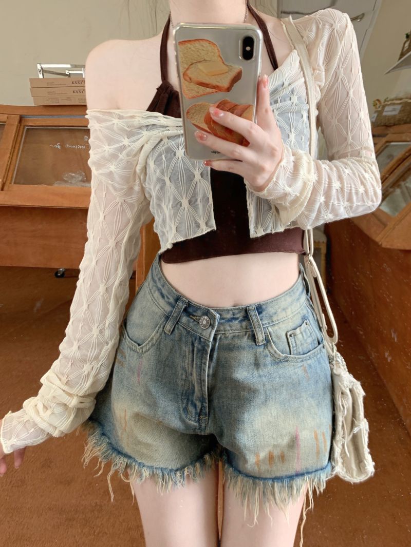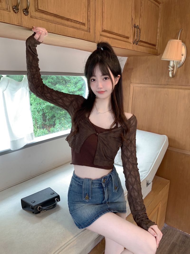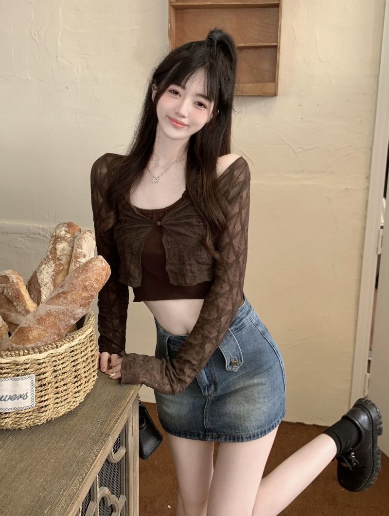 달콤하고 매운 스타일 Halter Camisole 여성의 여름 하이 엔드 짧은 슬리밍 긴팔 선 스크린 카디건 세트 투피스 세트