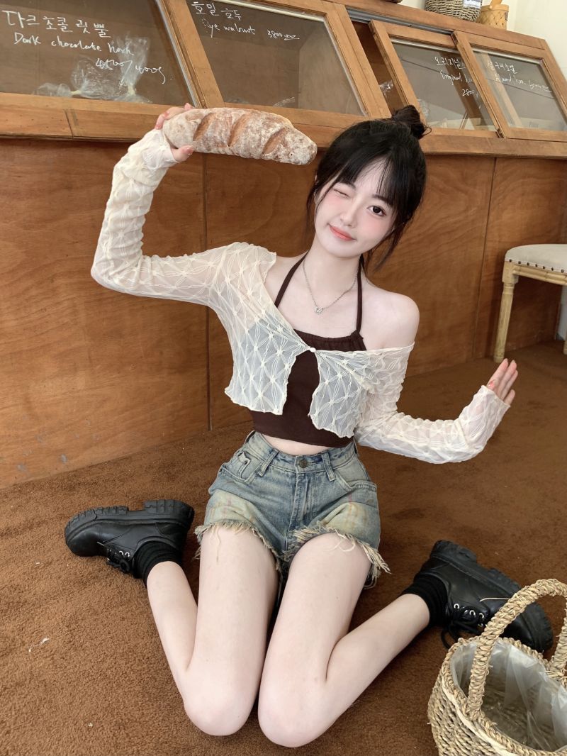 달콤하고 매운 스타일 Halter Camisole 여성의 여름 하이 엔드 짧은 슬리밍 긴팔 선 스크린 카디건 세트 투피스 세트스토어 가기