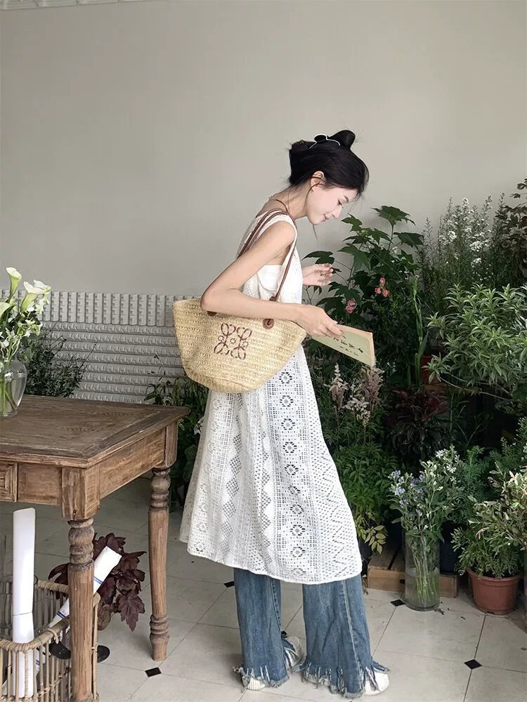 하이 엔드 레이스 할로우 아웃 니트 민소매 베스 원피스 여성 줄무늬 카디건 원피스 외부 레이오버 롱 블라우스