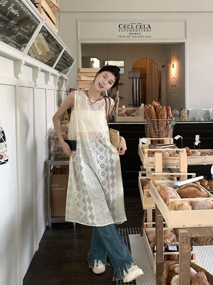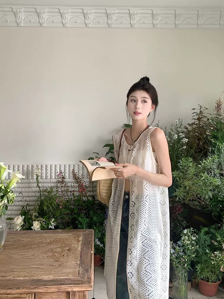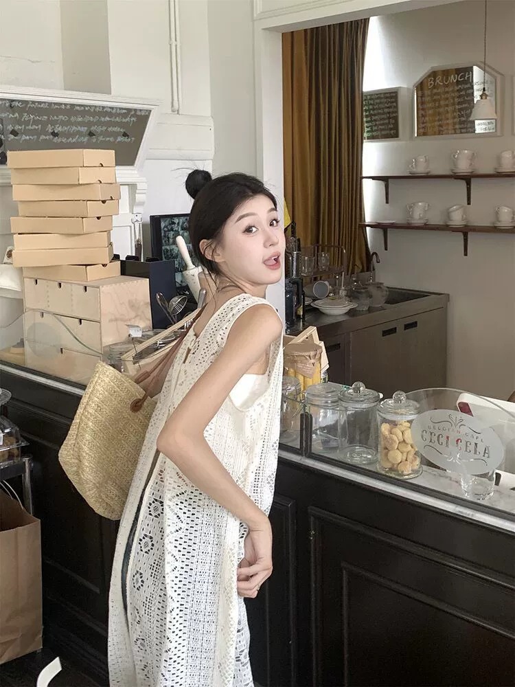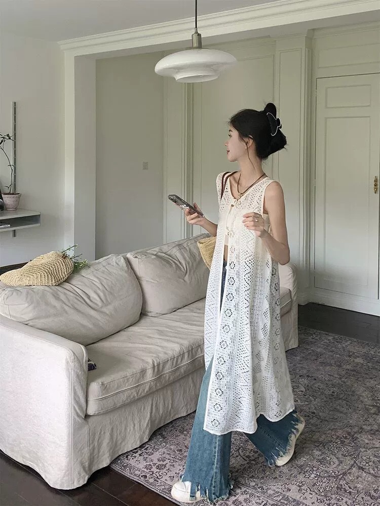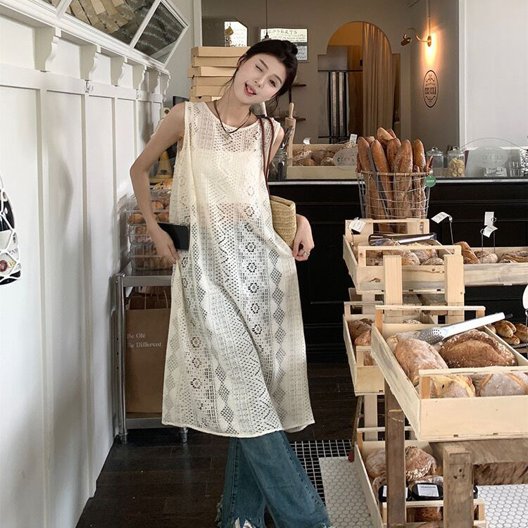 하이 엔드 레이스 할로우 아웃 니트 민소매 베스 원피스 여성 줄무늬 카디건 원피스 외부 레이오버 롱 블라우스스토어 가기