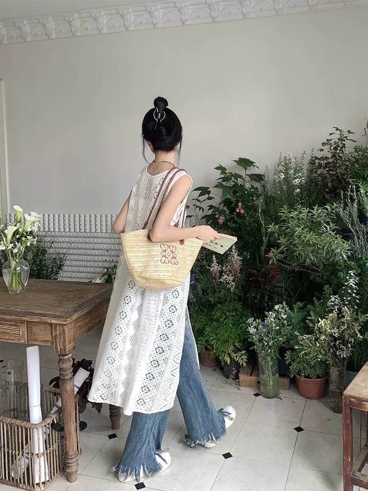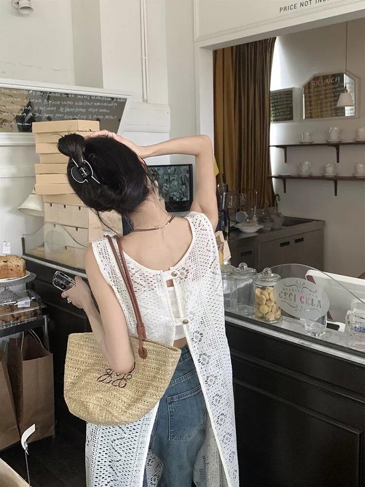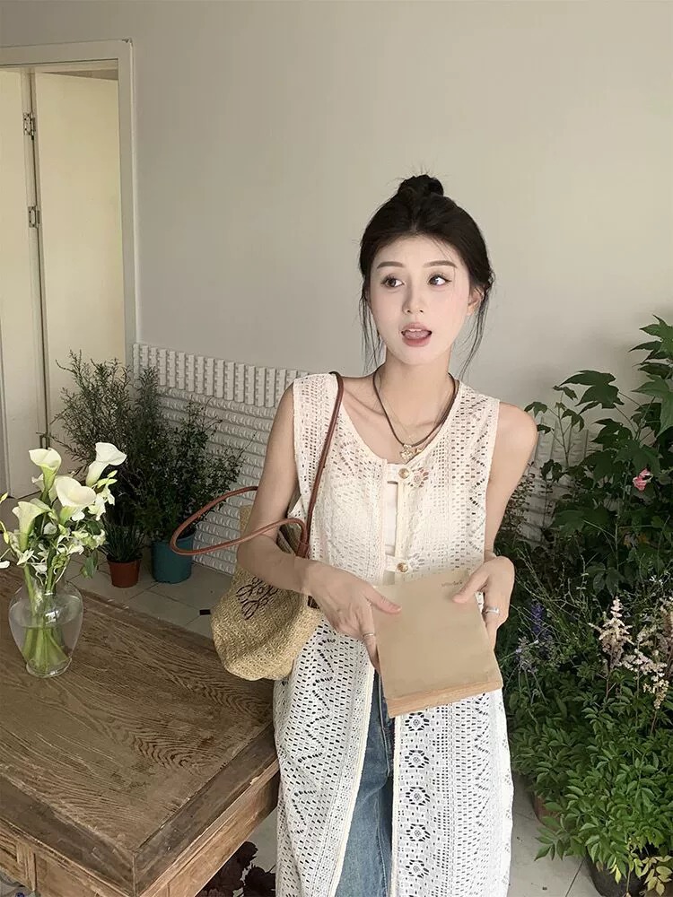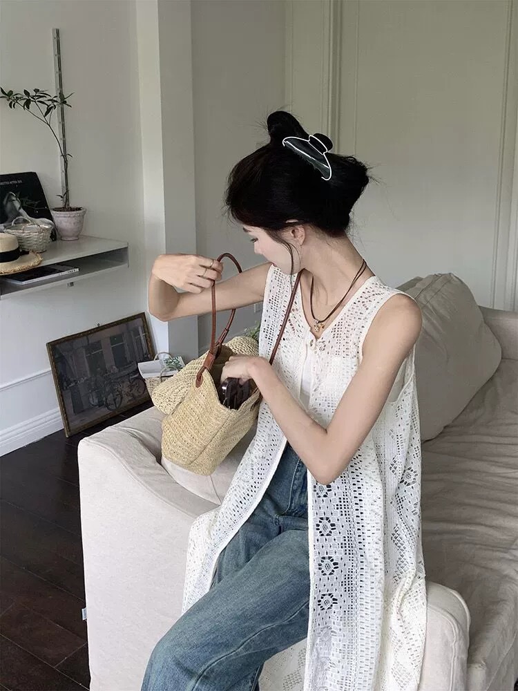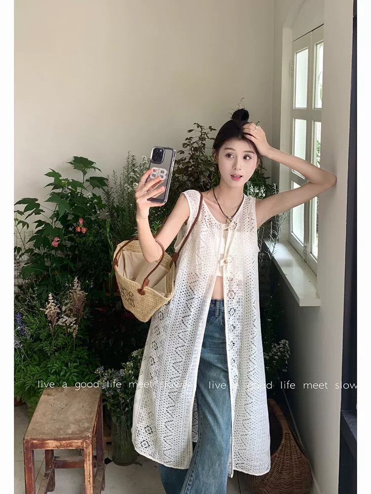 하이 엔드 레이스 할로우 아웃 니트 민소매 베스 원피스 여성 줄무늬 카디건 원피스 외부 레이오버 롱 블라우스스토어 가기