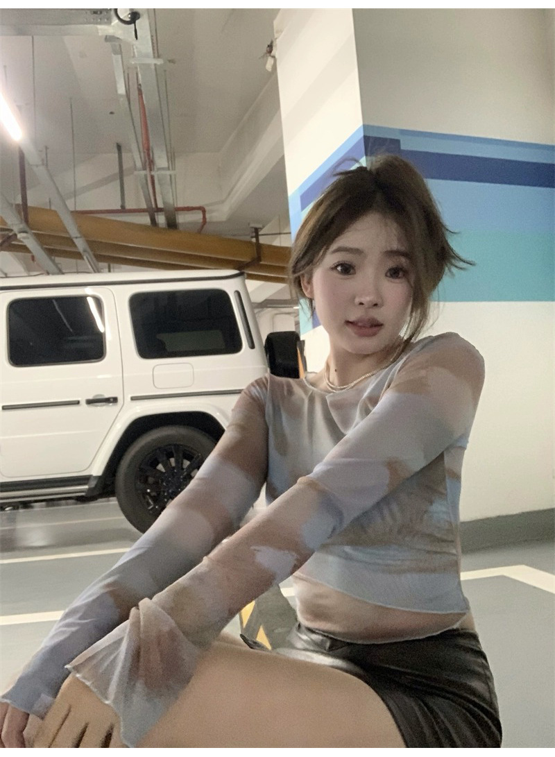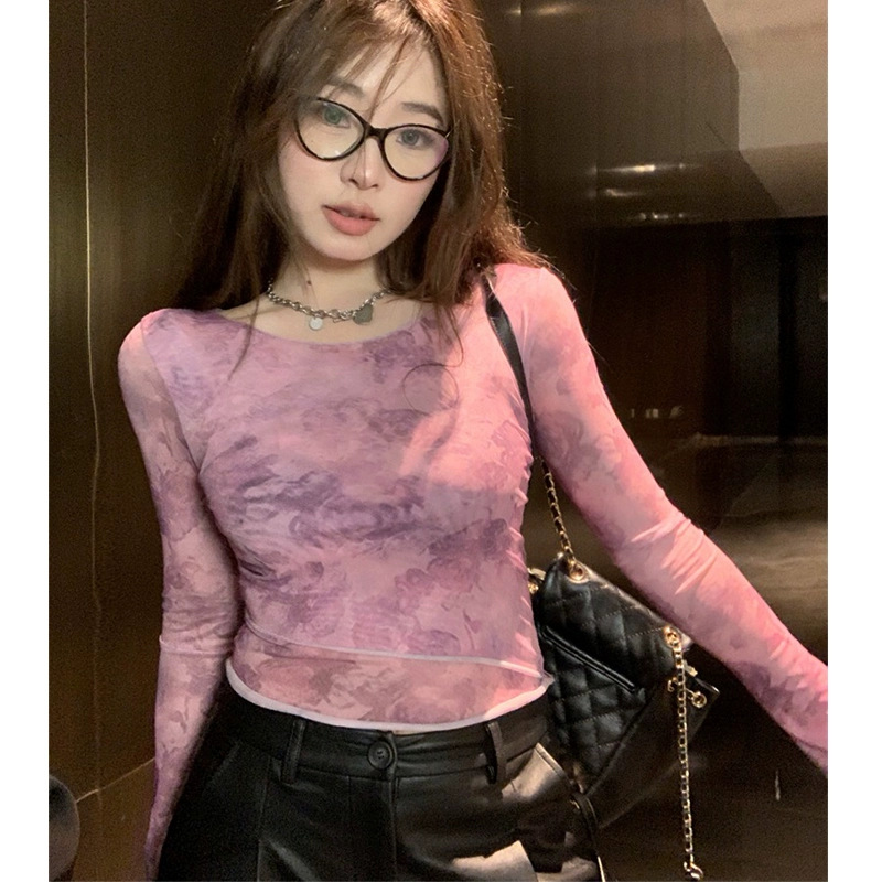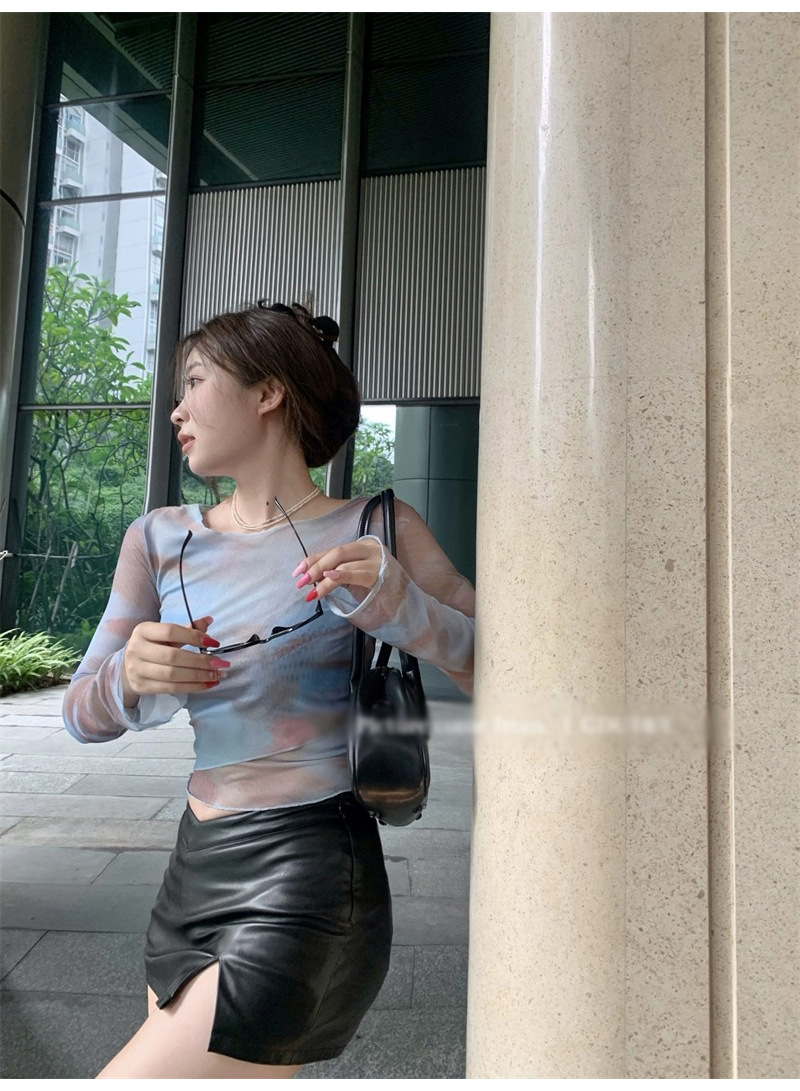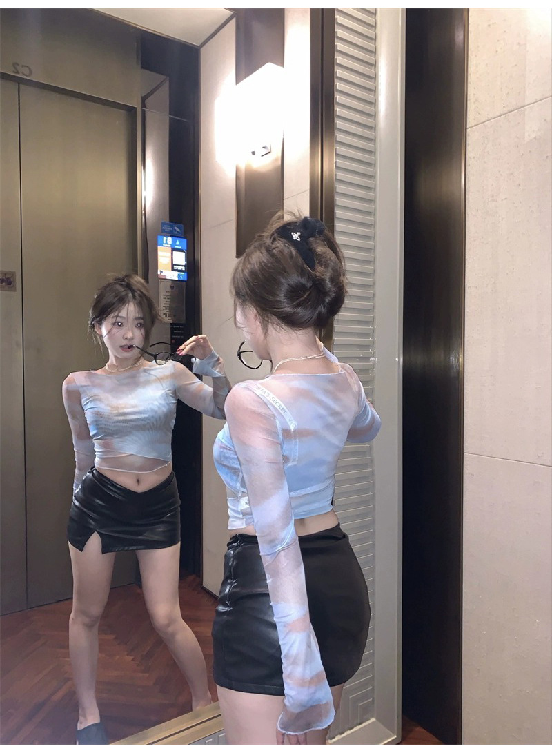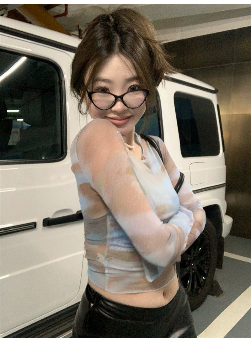 상체는 정말 아름답습니다 ~ 블루 미국의 뜨거운 소녀 선 스크린 긴 소매 티셔츠 여성 넥타이 염료 기질 틈새 슬림 탑