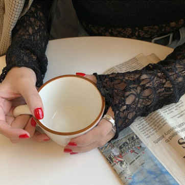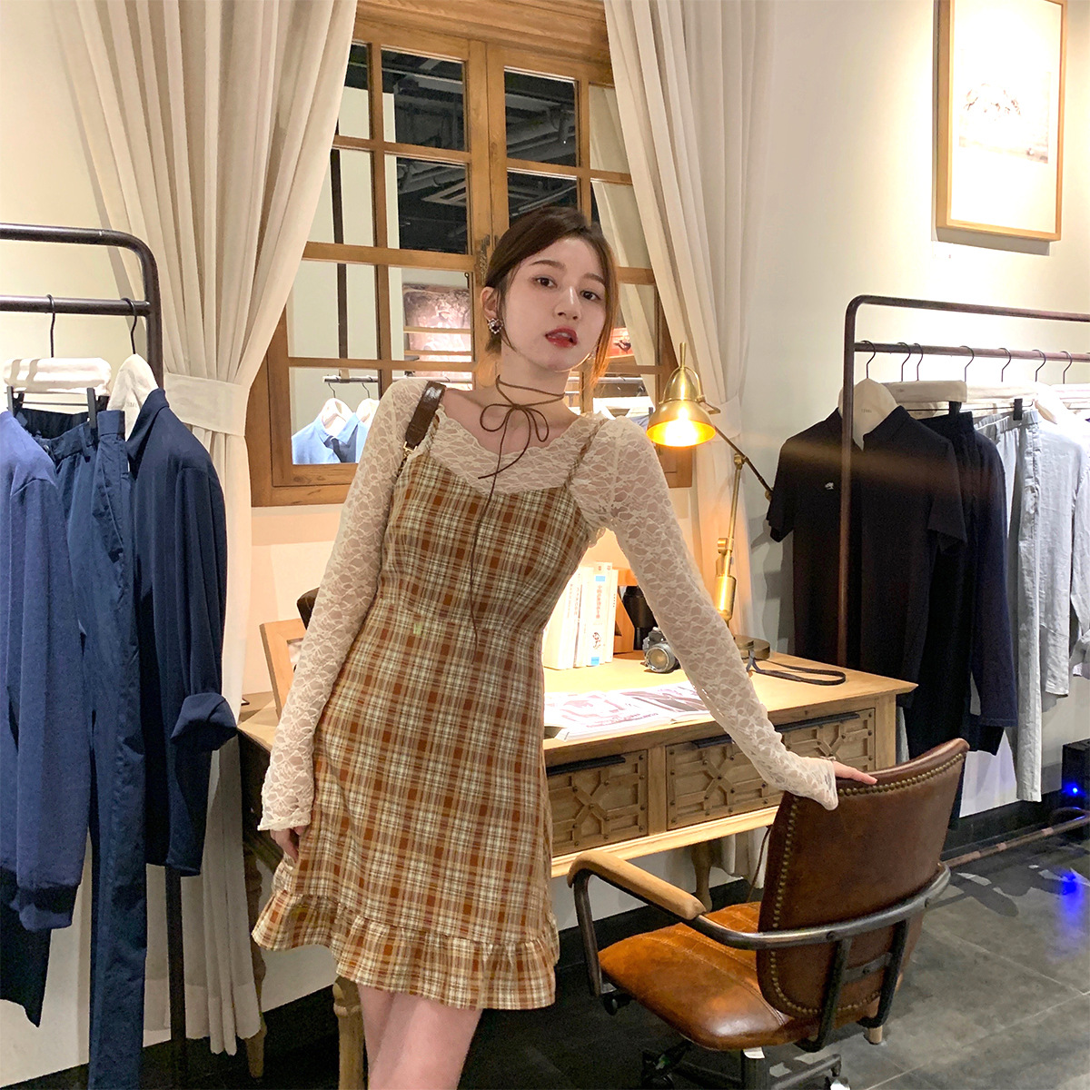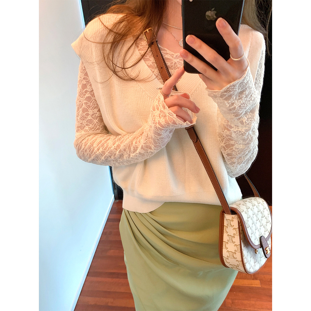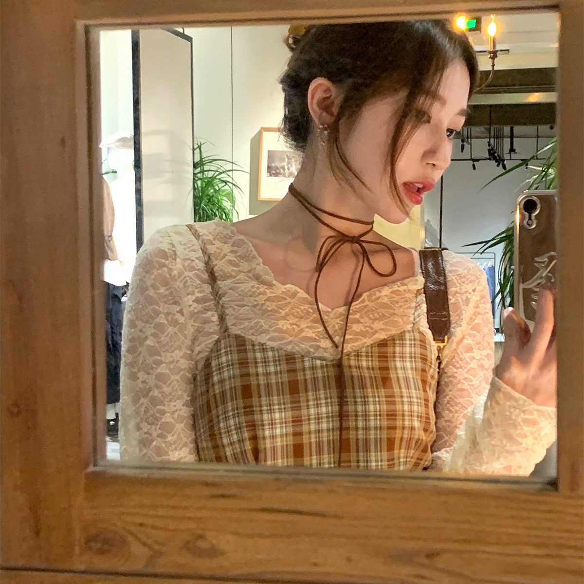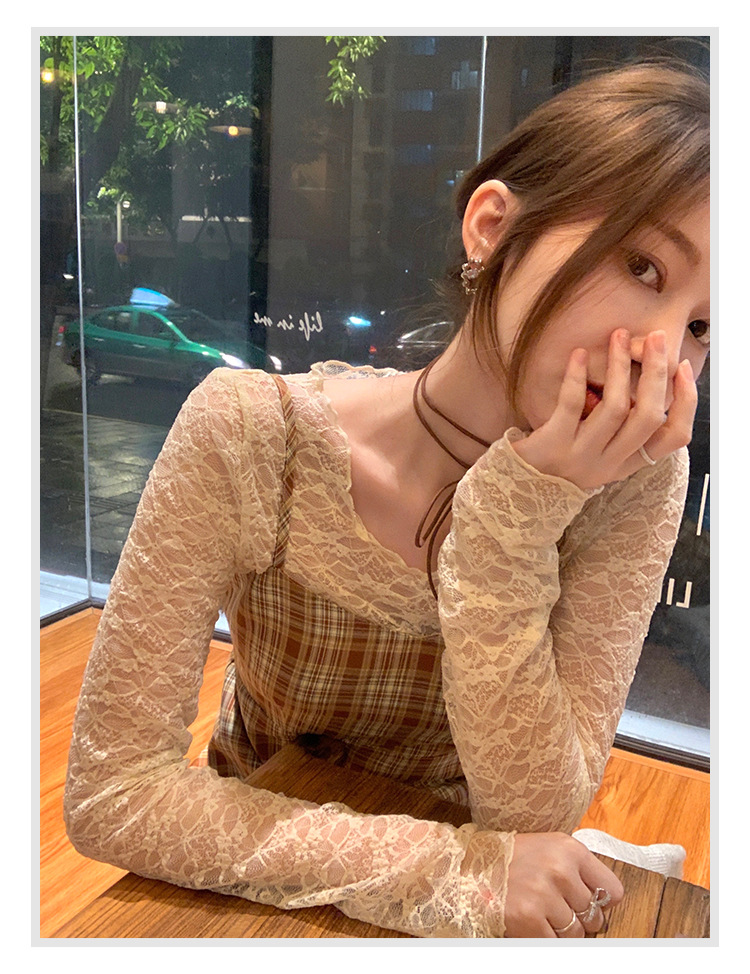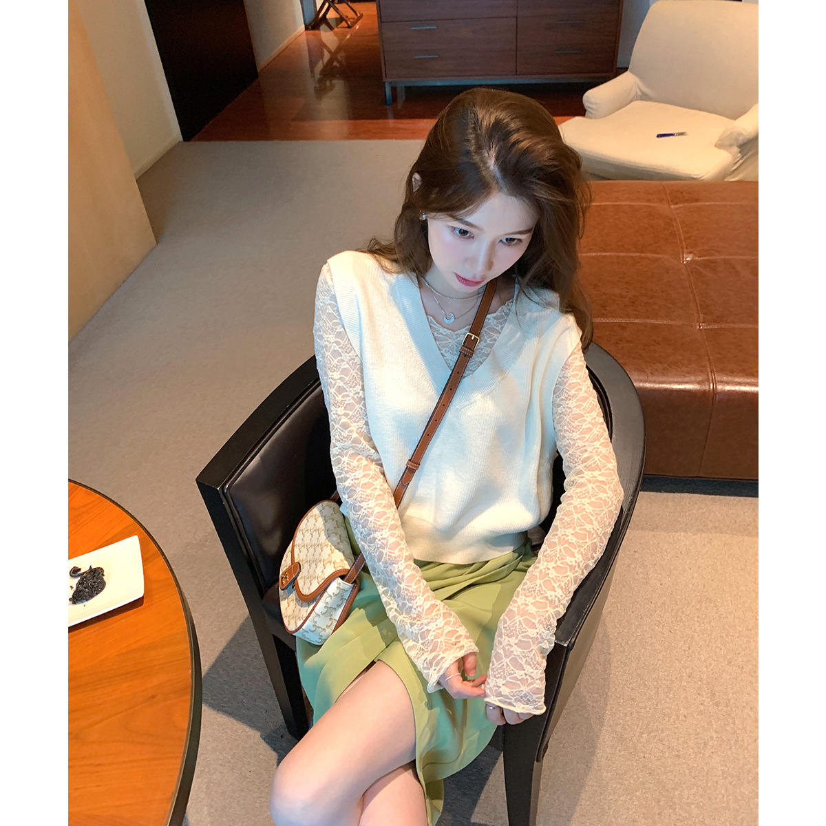 화이트 메쉬베이스 셔츠 여성용 내부 긴 소매 봄과 가을 얇은 나이-아름다운 서양식 셔츠 짧은 레이스 탑 감소