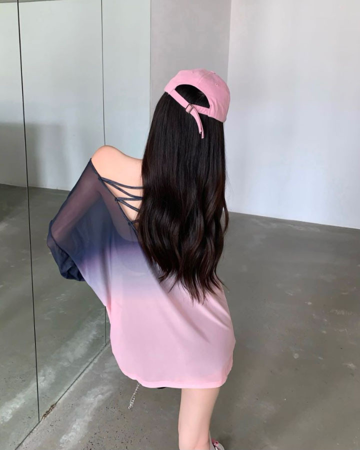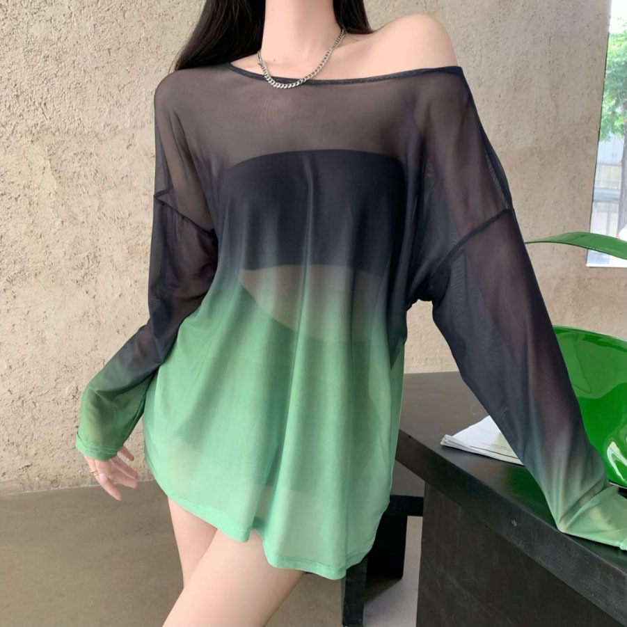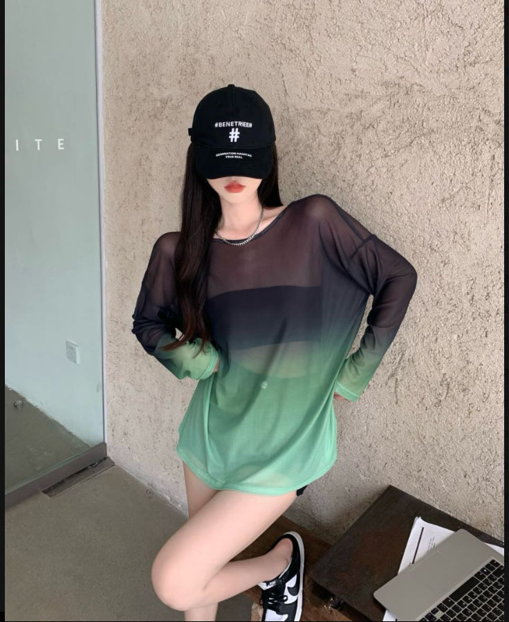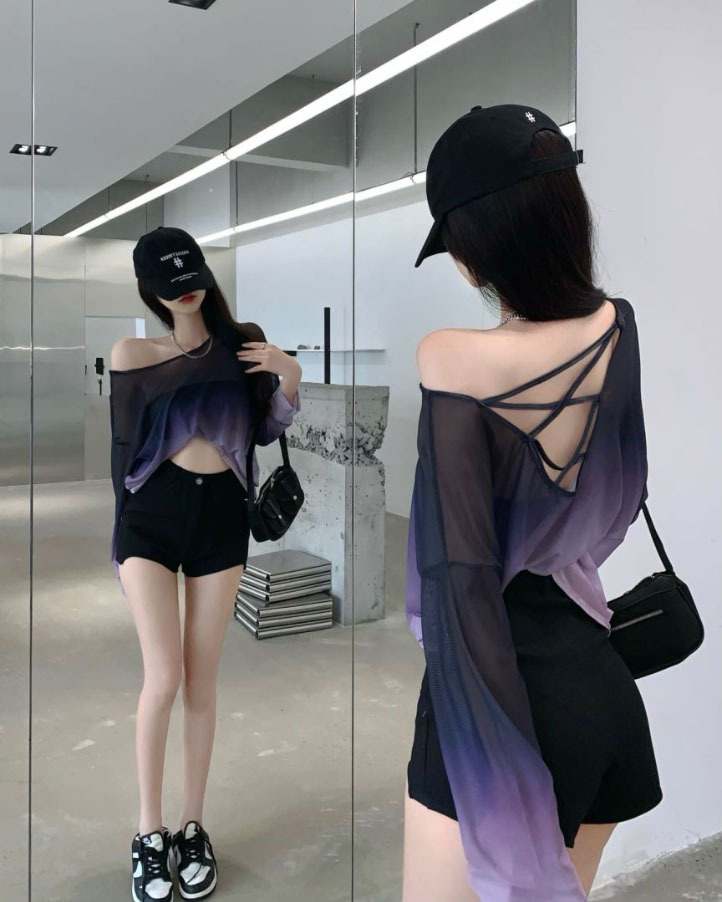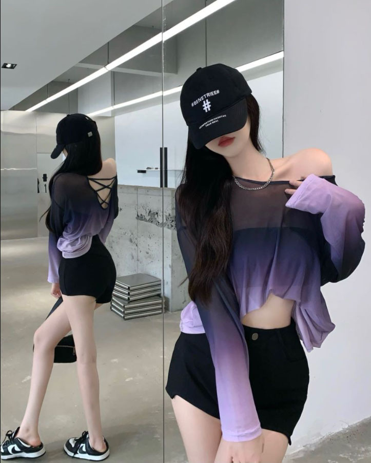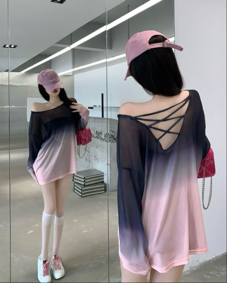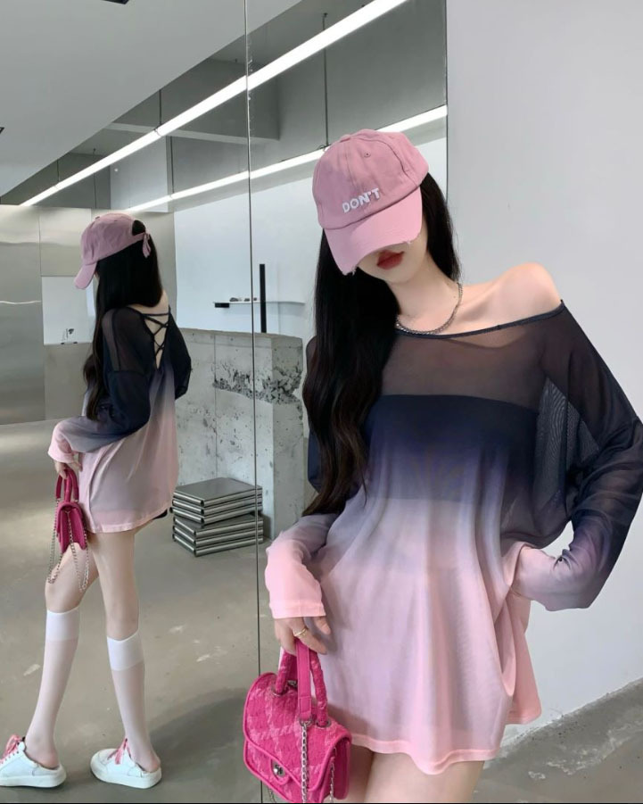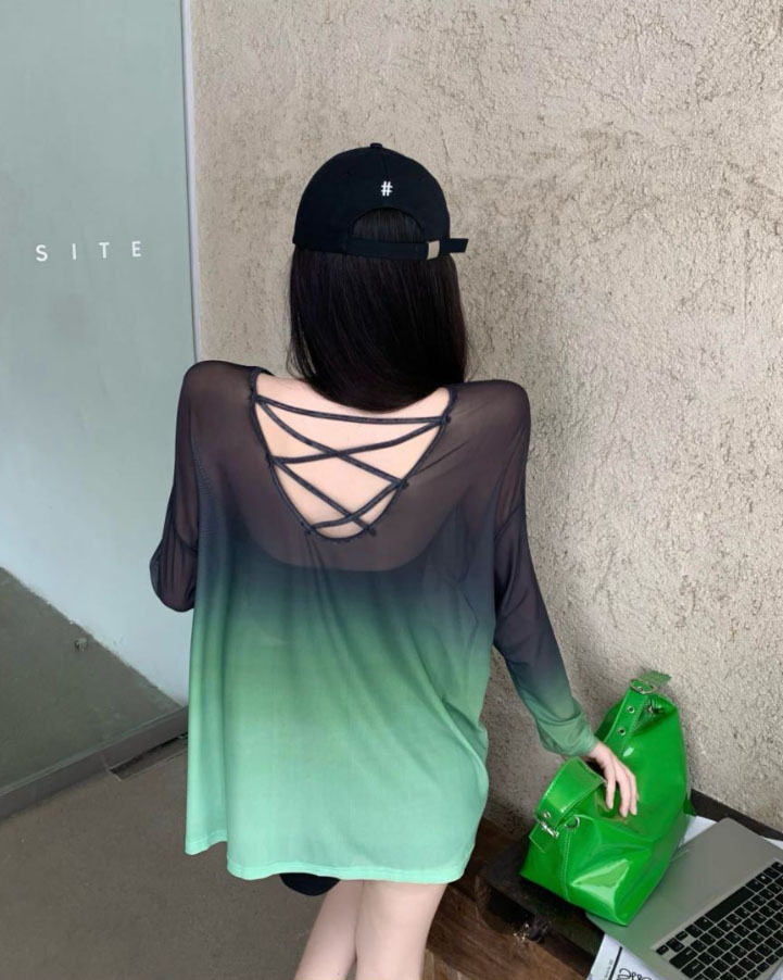 디자인-센스 백 크로스 그라디언트 긴팔 아이스 실크 선스크린 셔츠 여성의 2025 년 여름 한국 스타일 느슨한 유행 올 매치 티셔츠스토어 가기