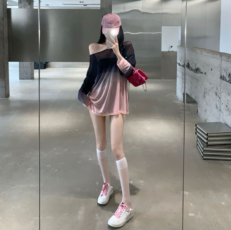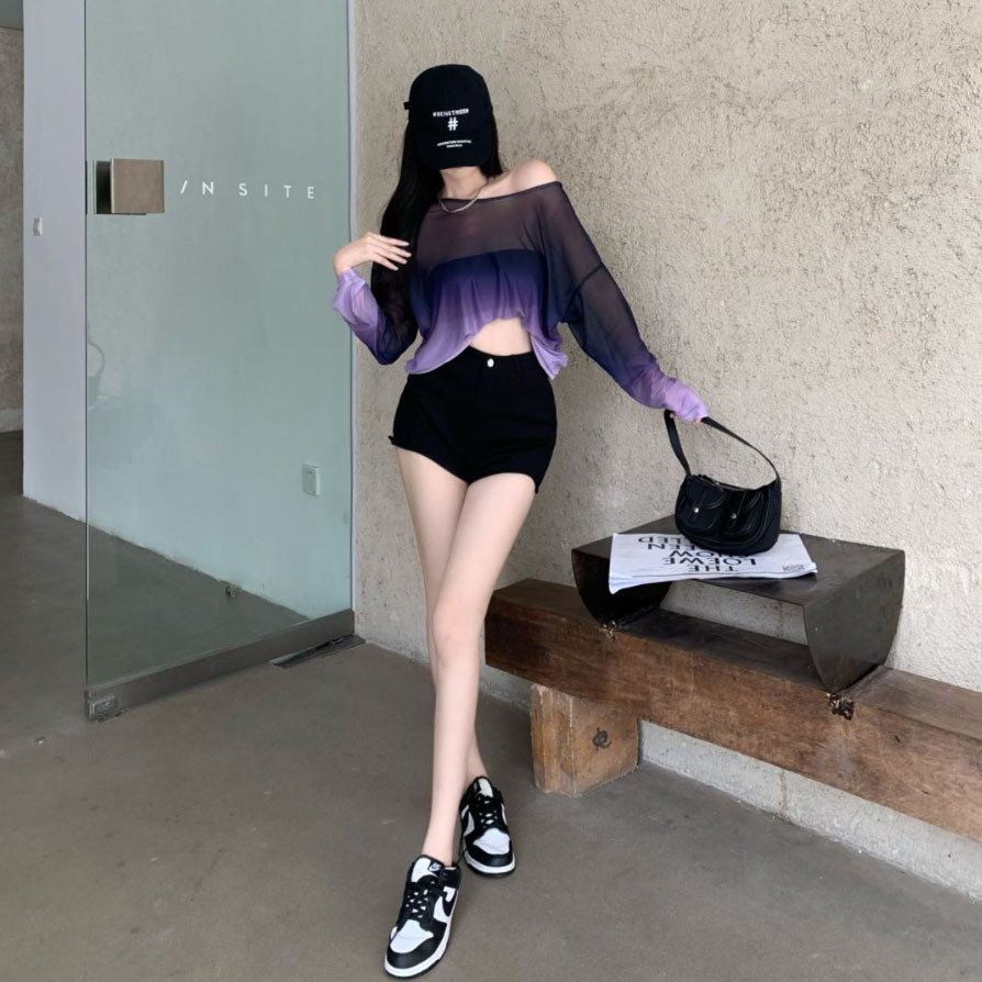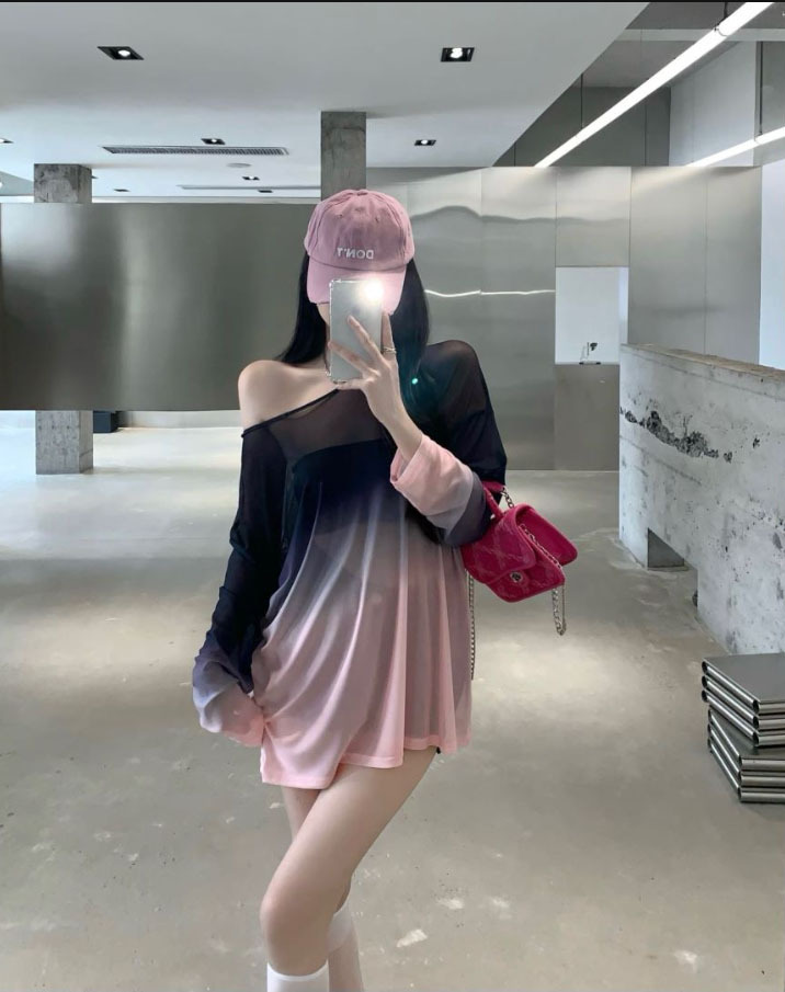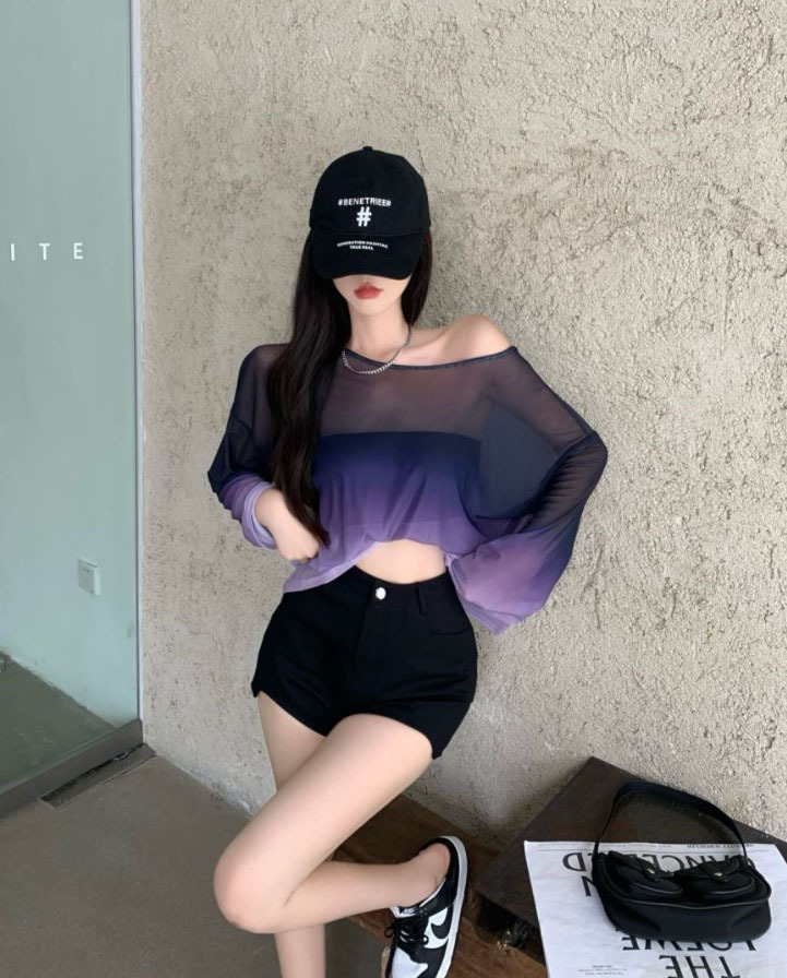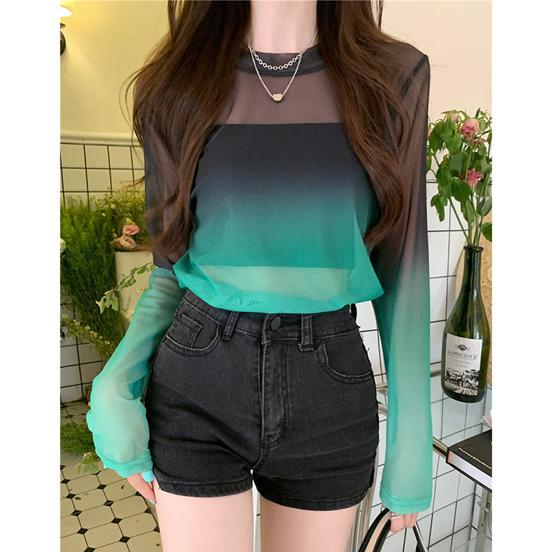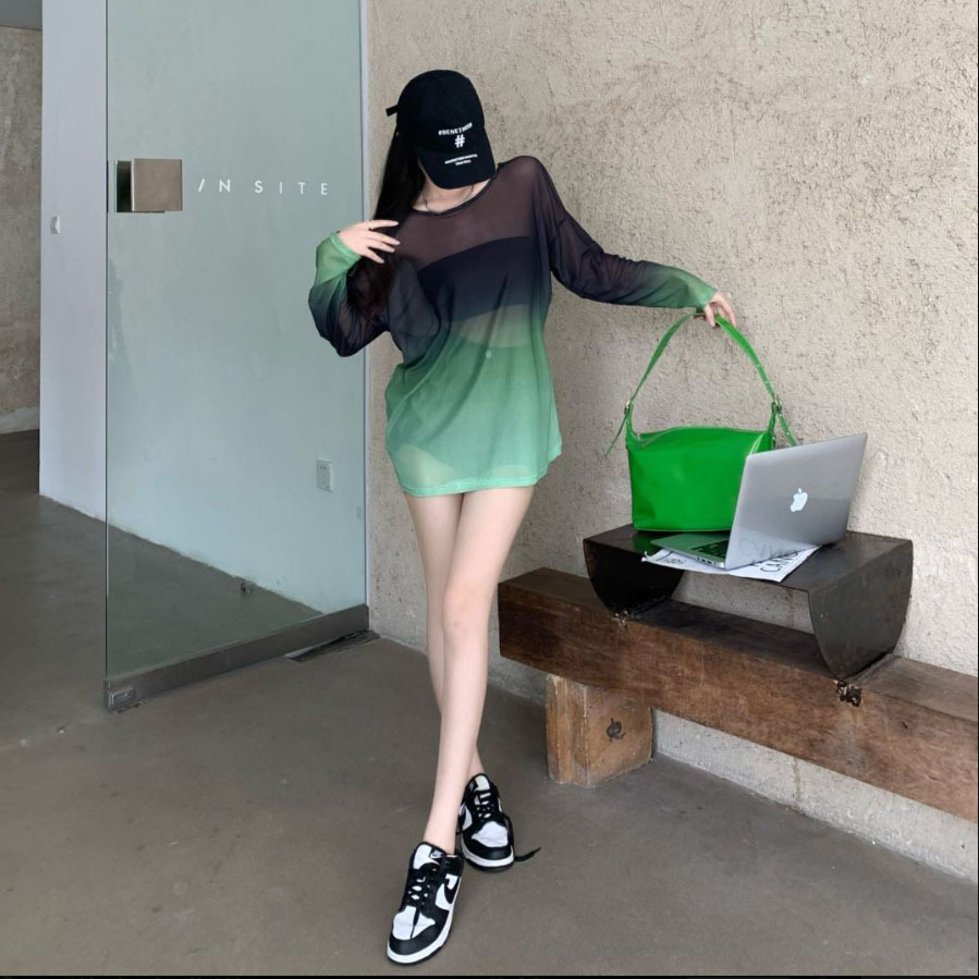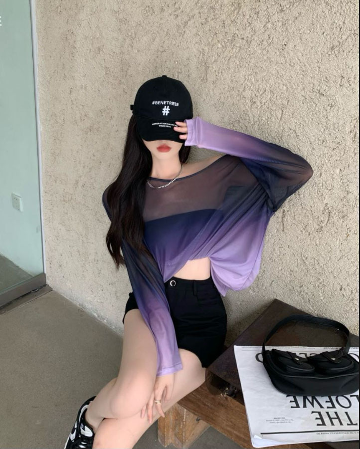 디자인-센스 백 크로스 그라디언트 긴팔 아이스 실크 선스크린 셔츠 여성의 2025 년 여름 한국 스타일 느슨한 유행 올 매치 티셔츠스토어 가기