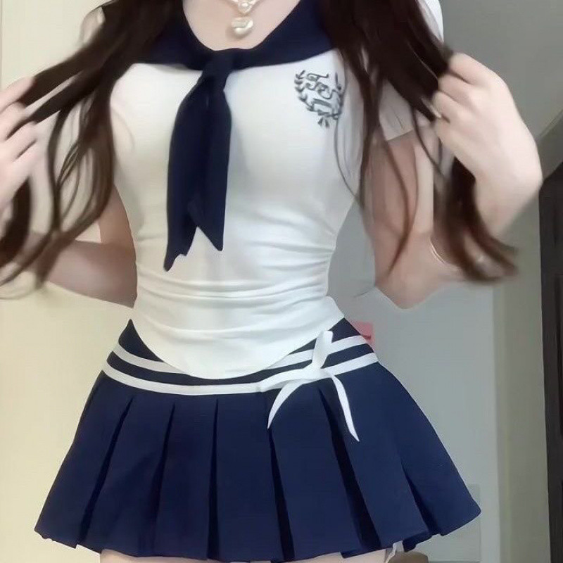 V1M 대학 스타일 해군 칼라 자수 티셔츠 세트 여성 여름 높은 허리 주름 치마 우아한 나이 감소 짧은 소매 탑스토어 가기