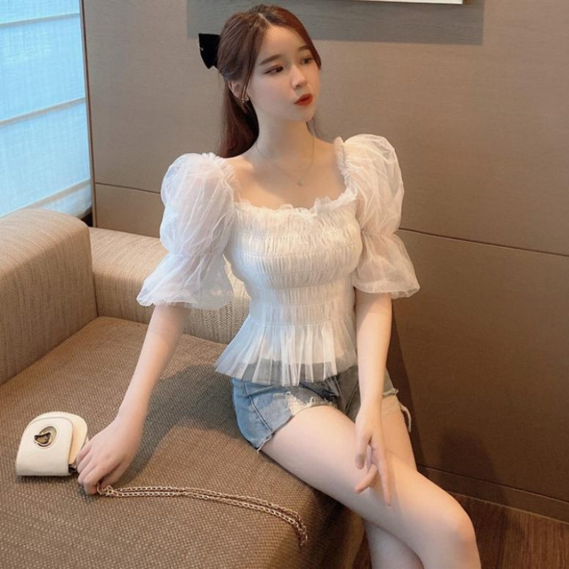 시폰 셔츠 여성의 여름 새로운 디자인 센스 스퀘어 칼라 플리츠 슬림 핏 짧은 메쉬스토어 가기