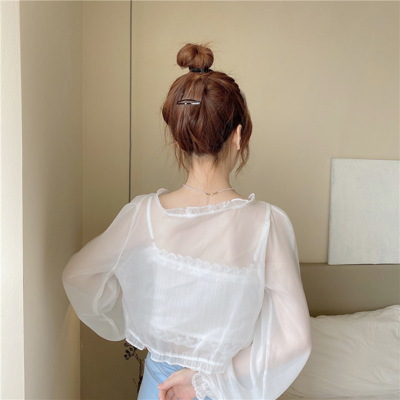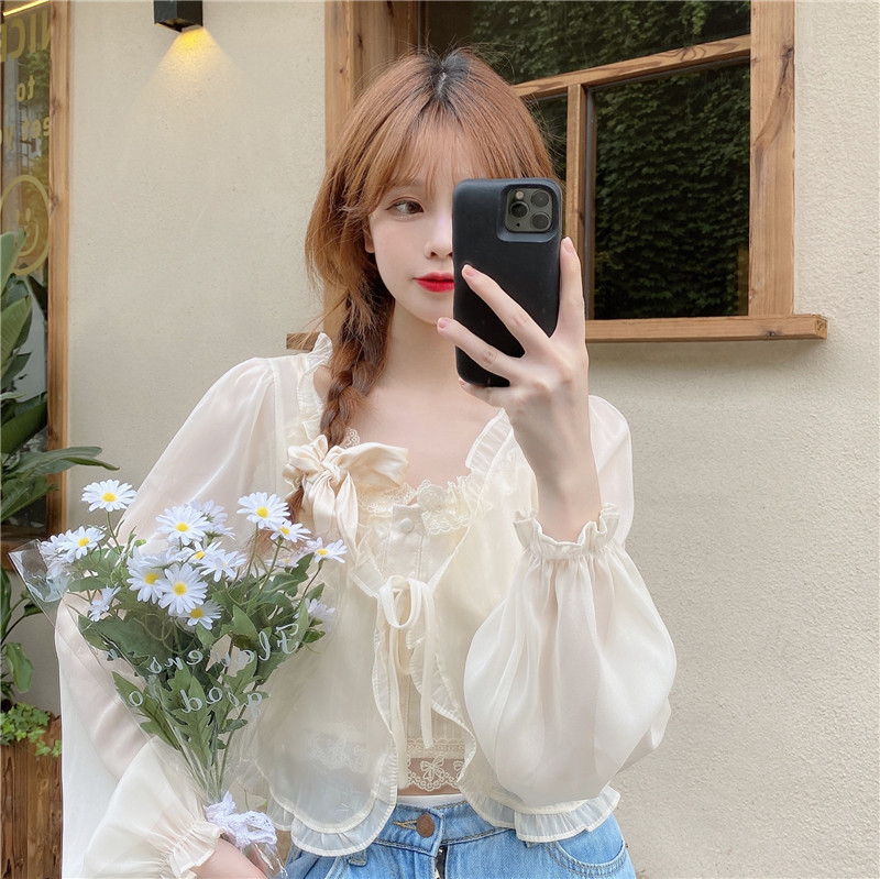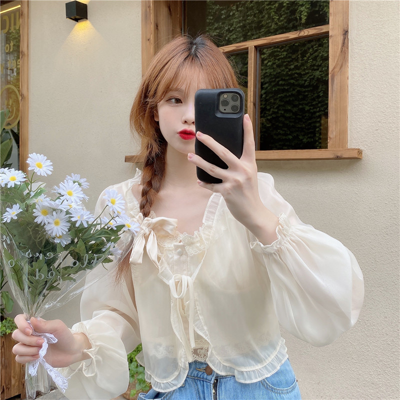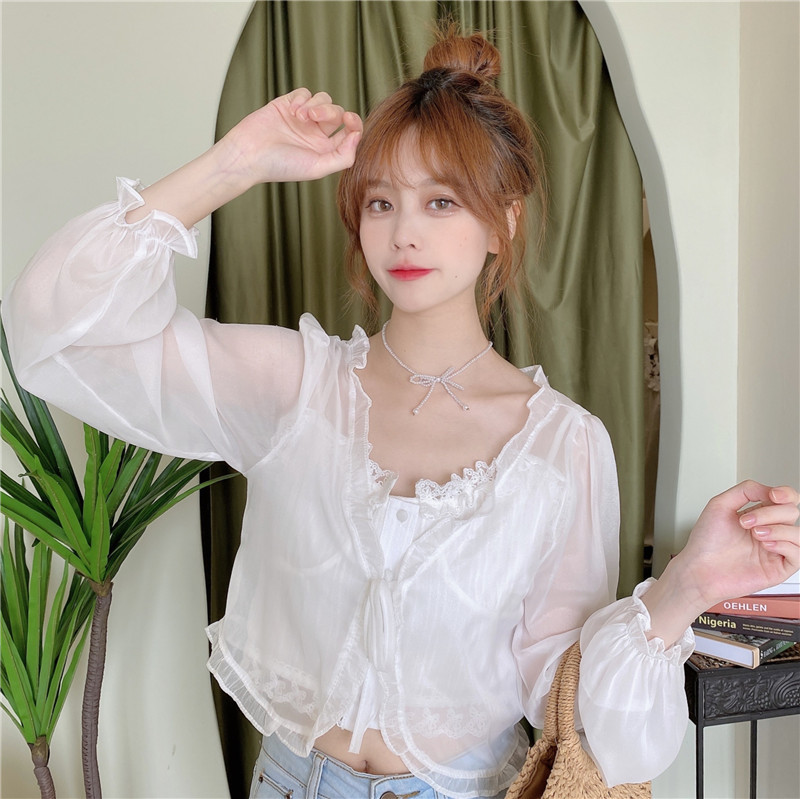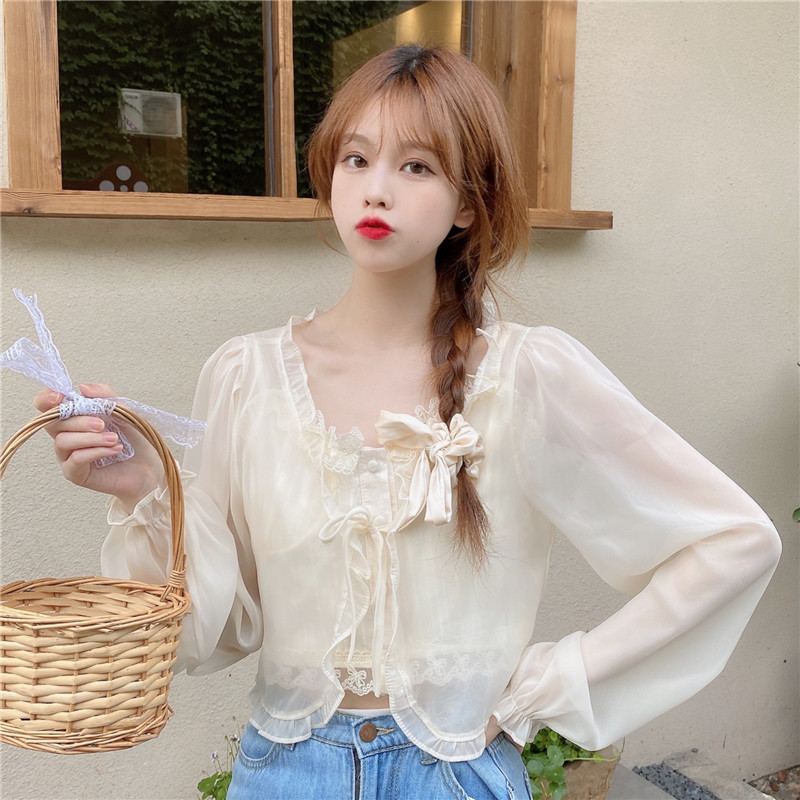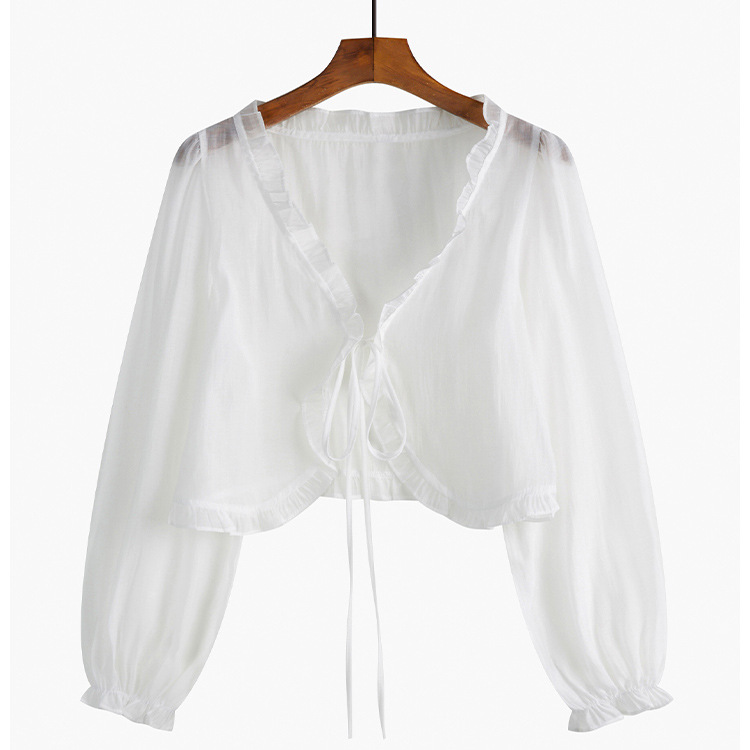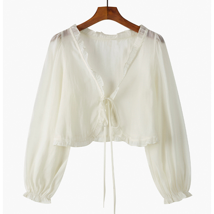 조심 기계 짧은 활 넥타이 업 작은 목도리 여자 2025 여름 느슨한 긴팔 올 매치 태양 보호 셔츠