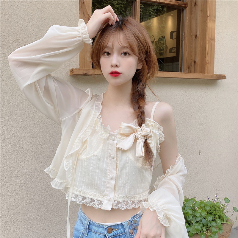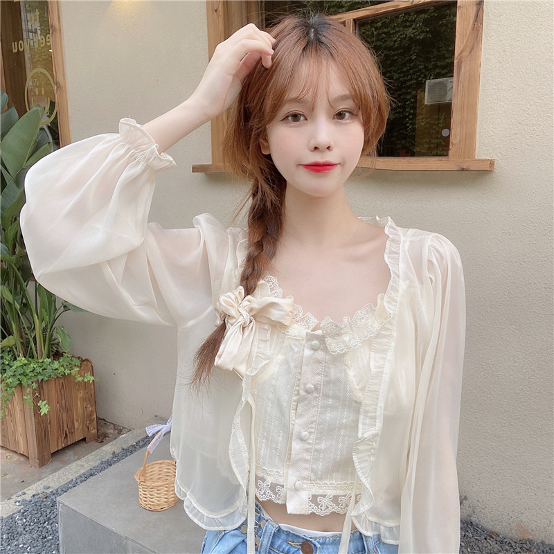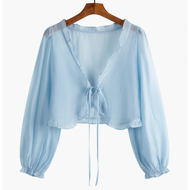 조심 기계 짧은 활 넥타이 업 작은 목도리 여자 2025 여름 느슨한 긴팔 올 매치 태양 보호 셔츠스토어 가기
