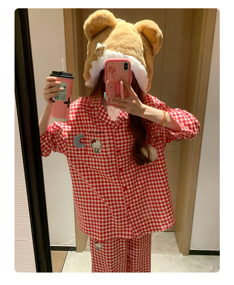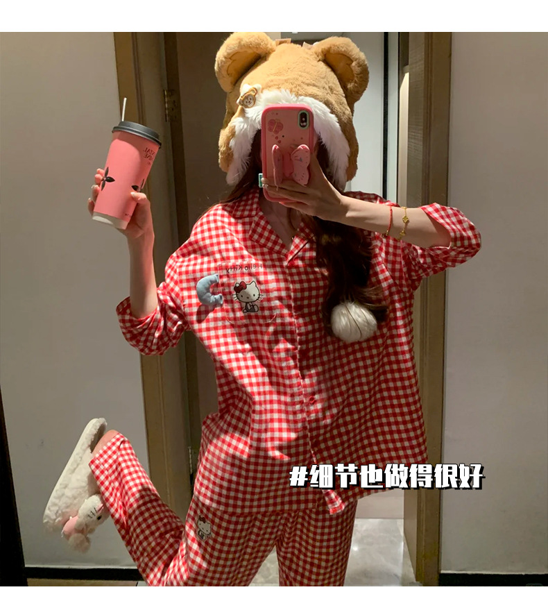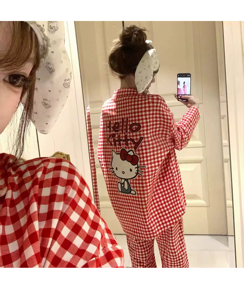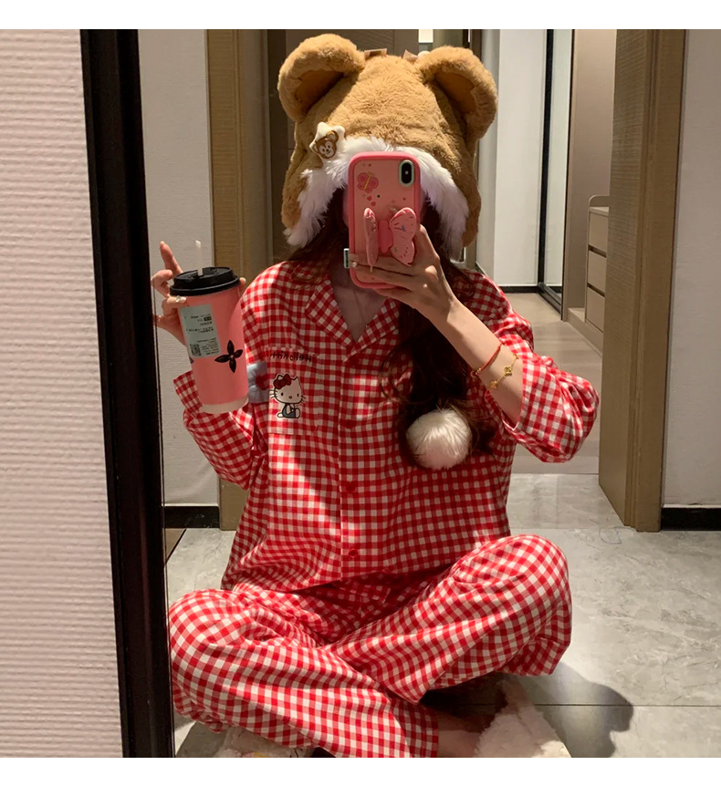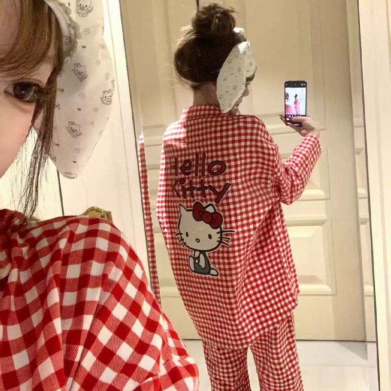 KT 고양이 잠옷 여성 긴팔 바지 구름 면화 봄과 가을 만화 귀여운 학생 카디건 스위트 홈 의류 세트스토어 가기