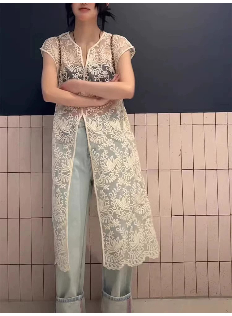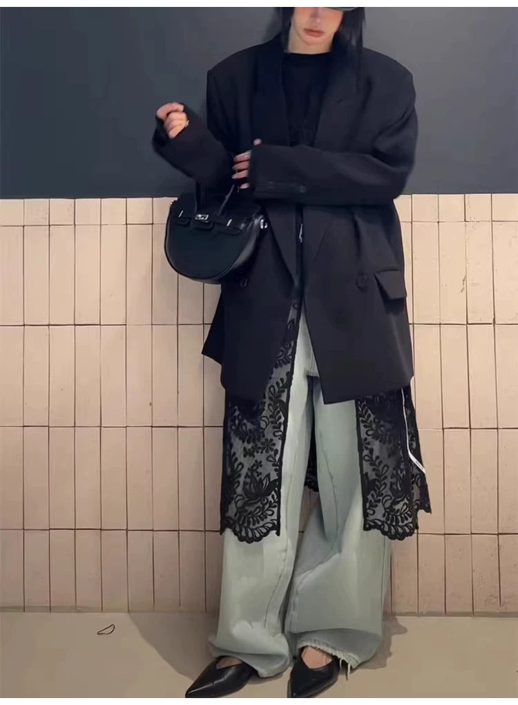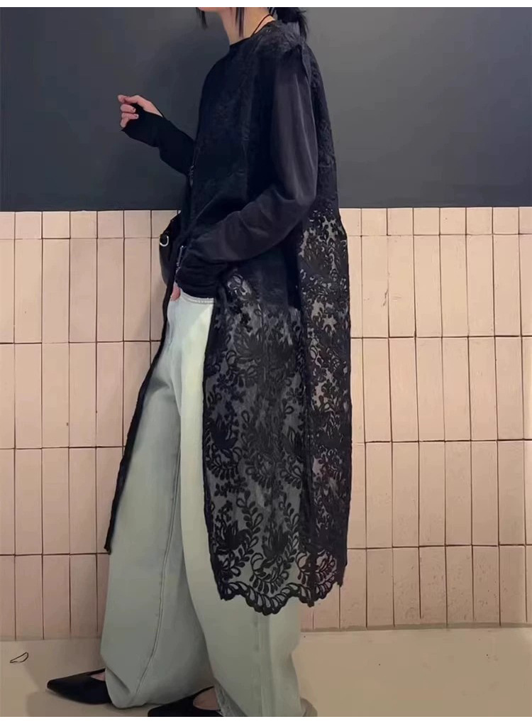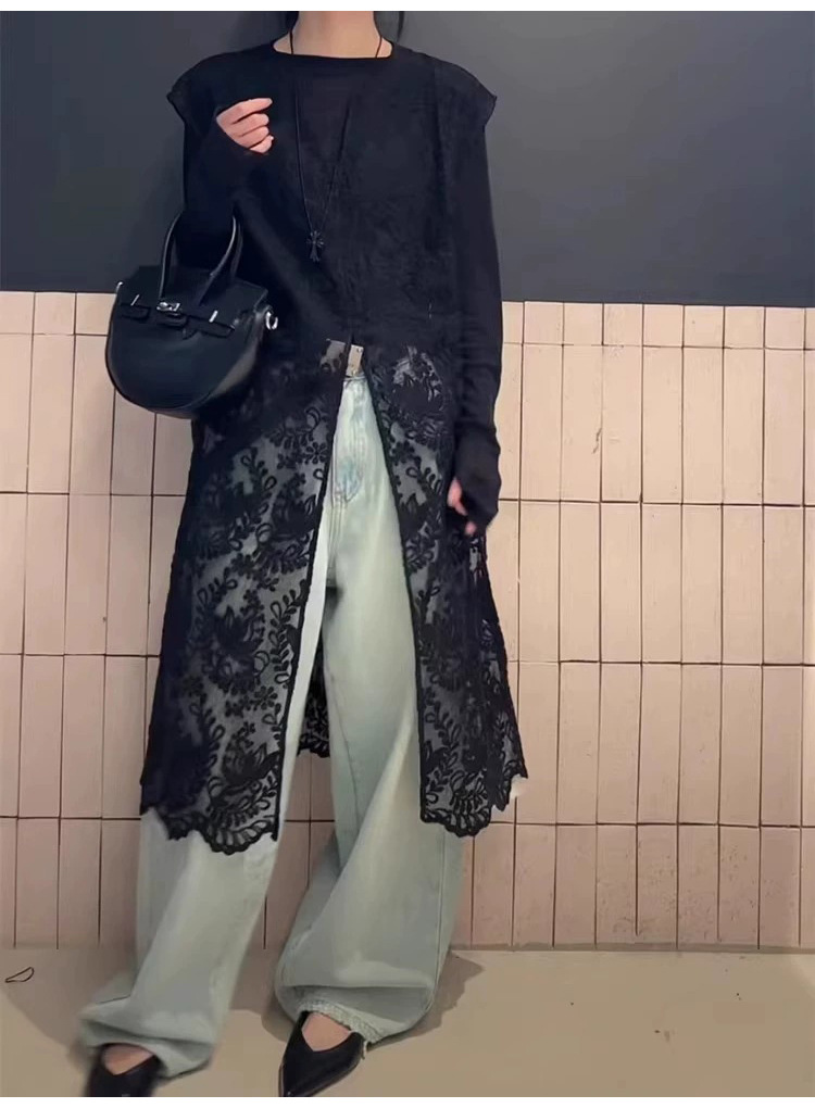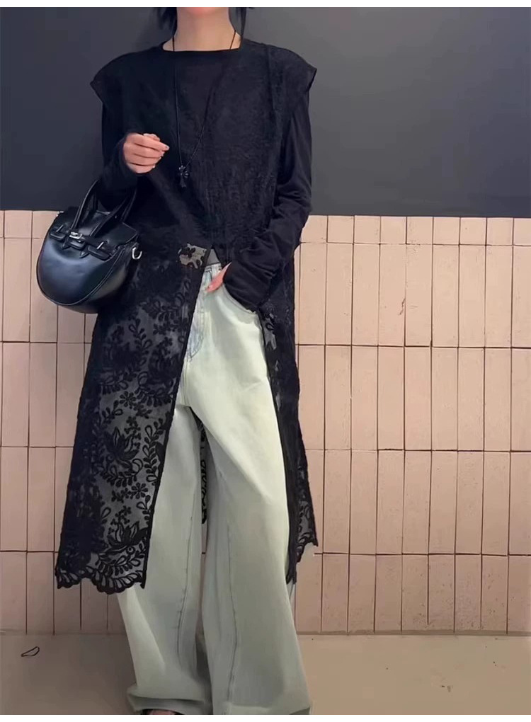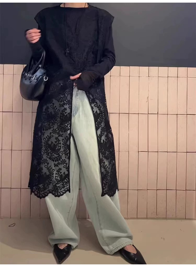한국 스타일 중공 레이스 원피스 여자 2025 년 봄과 여름 뉴 아우터 롱 블랙 블라우스 탑