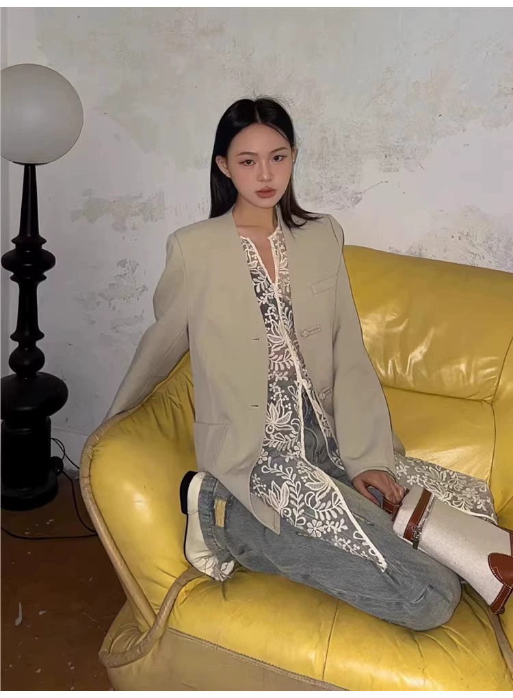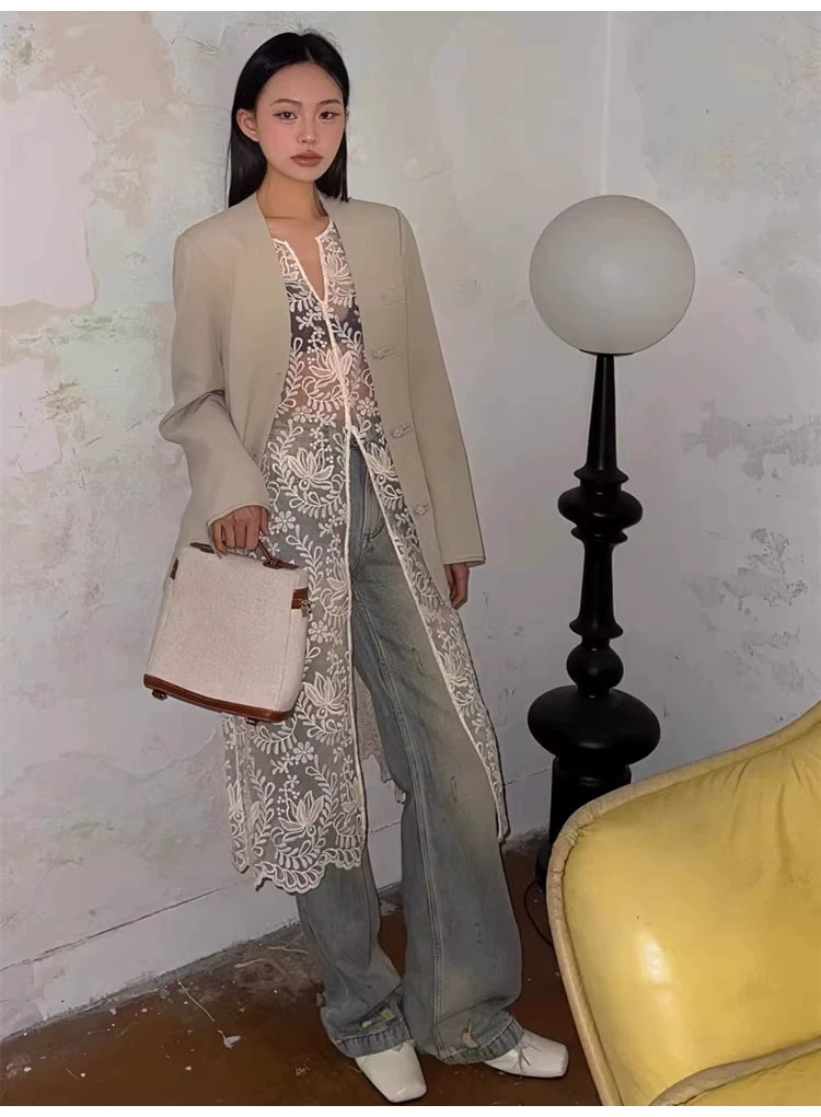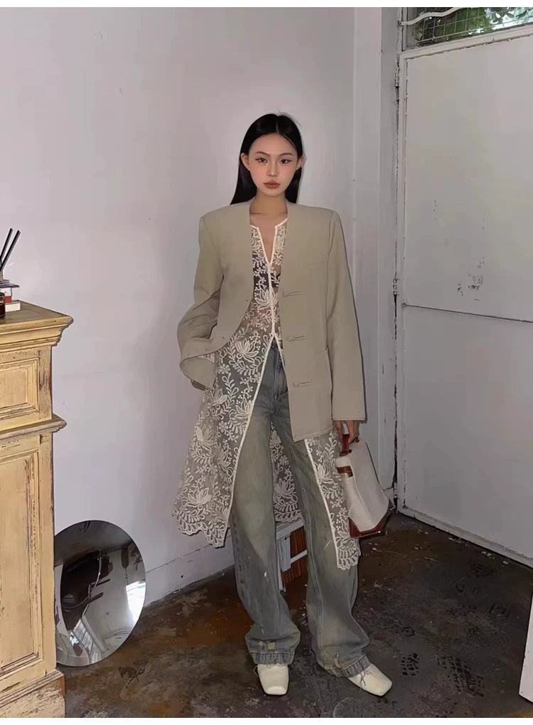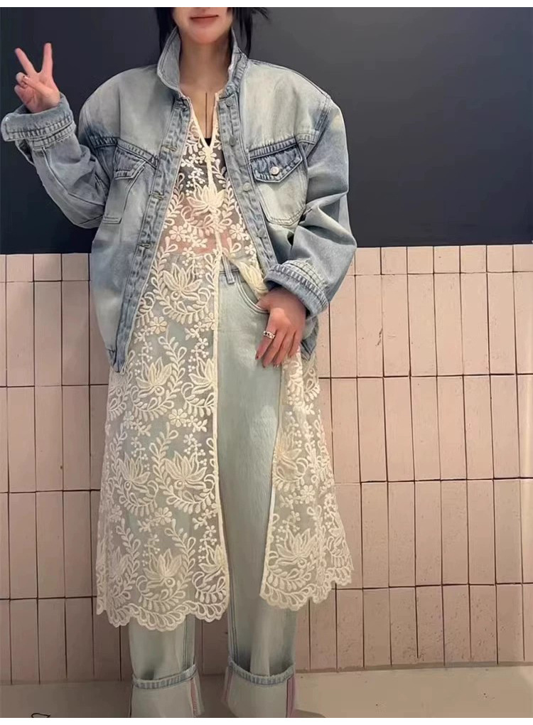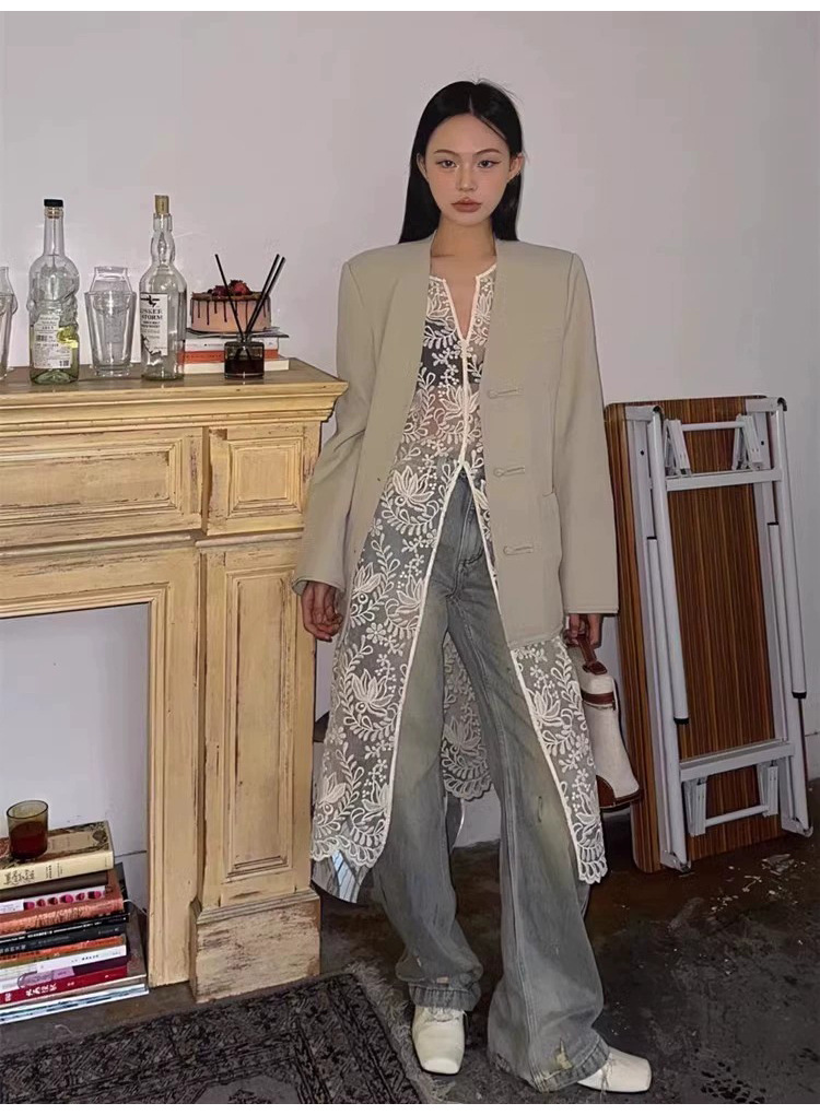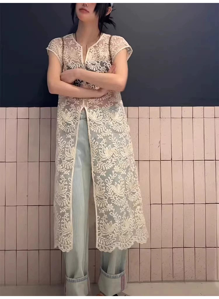 한국 스타일 중공 레이스 원피스 여자 2025 년 봄과 여름 뉴 아우터 롱 블랙 블라우스 탑