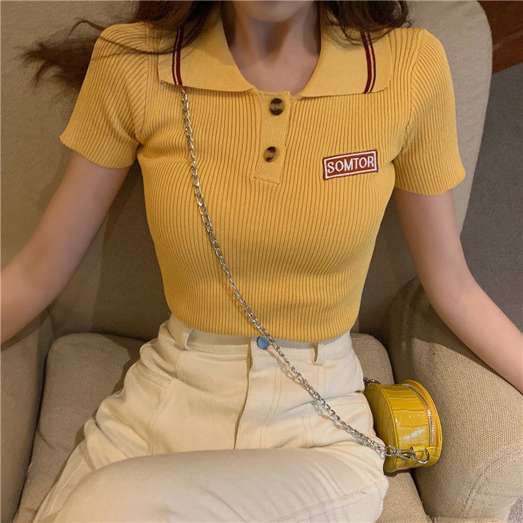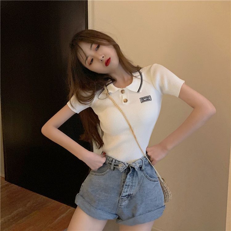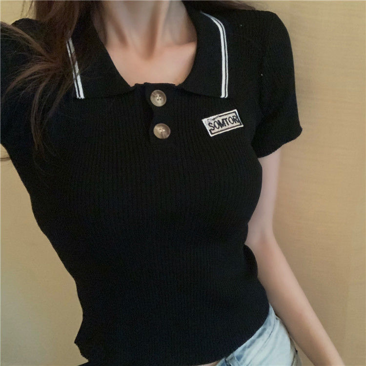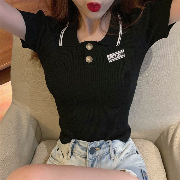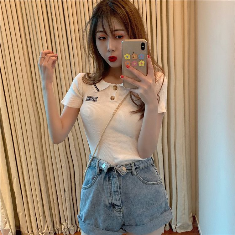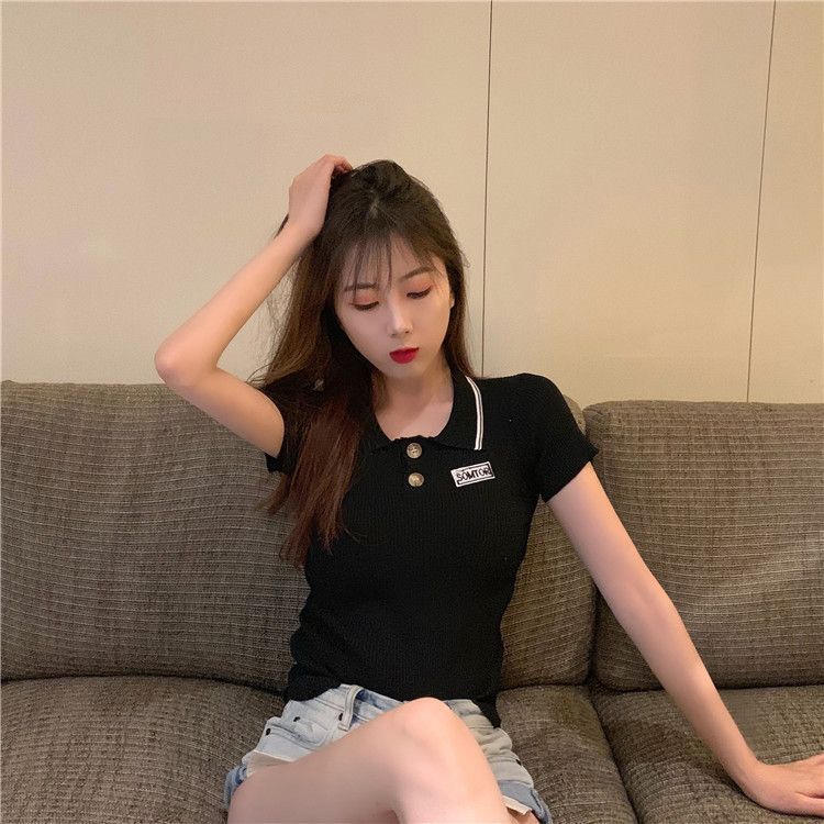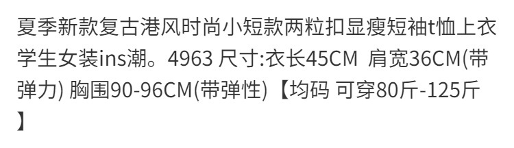 여름 새로운 빈티지 홍콩 스타일 유행 작은 짧은 두 버튼 슬리밍 반팔 티셔츠 최고 학생 여성의 Instagram 패션스토어 가기