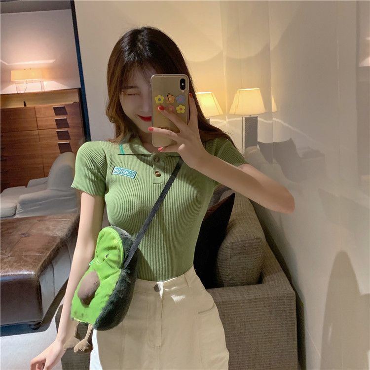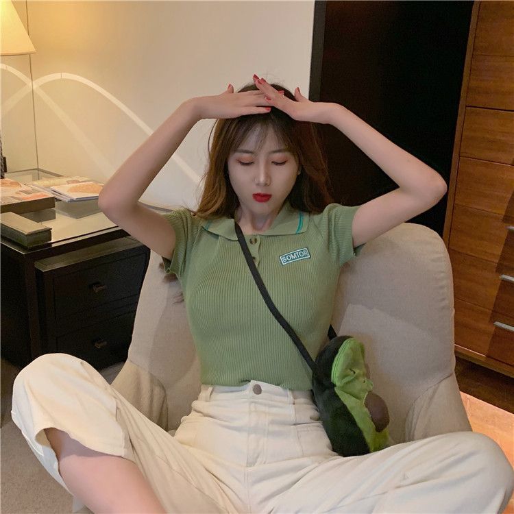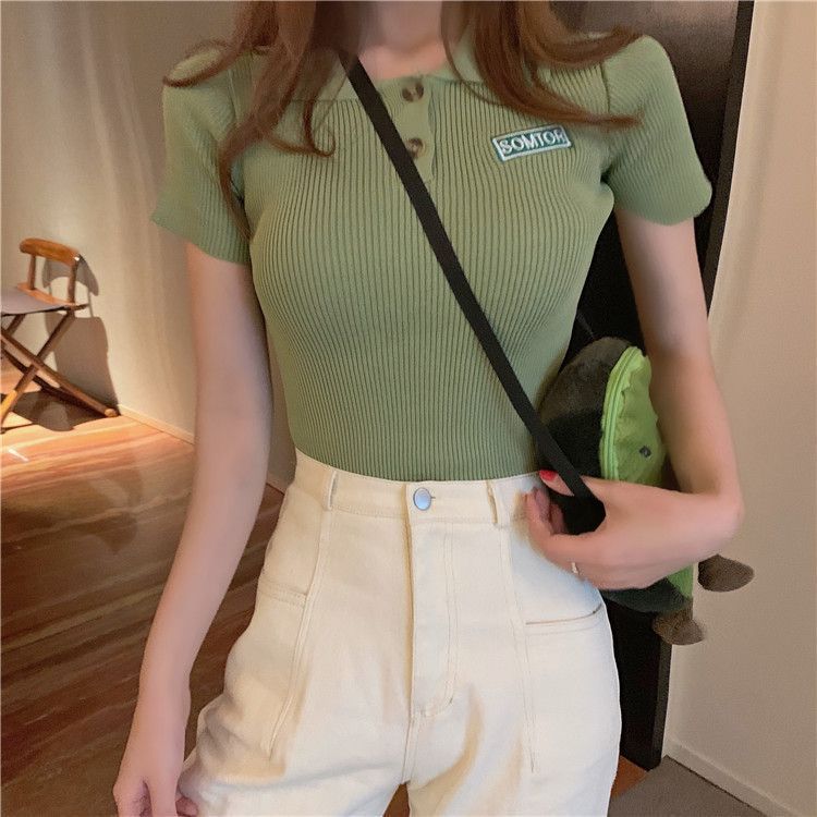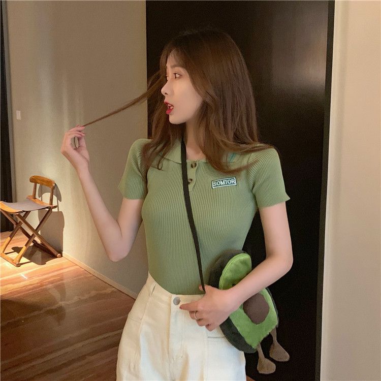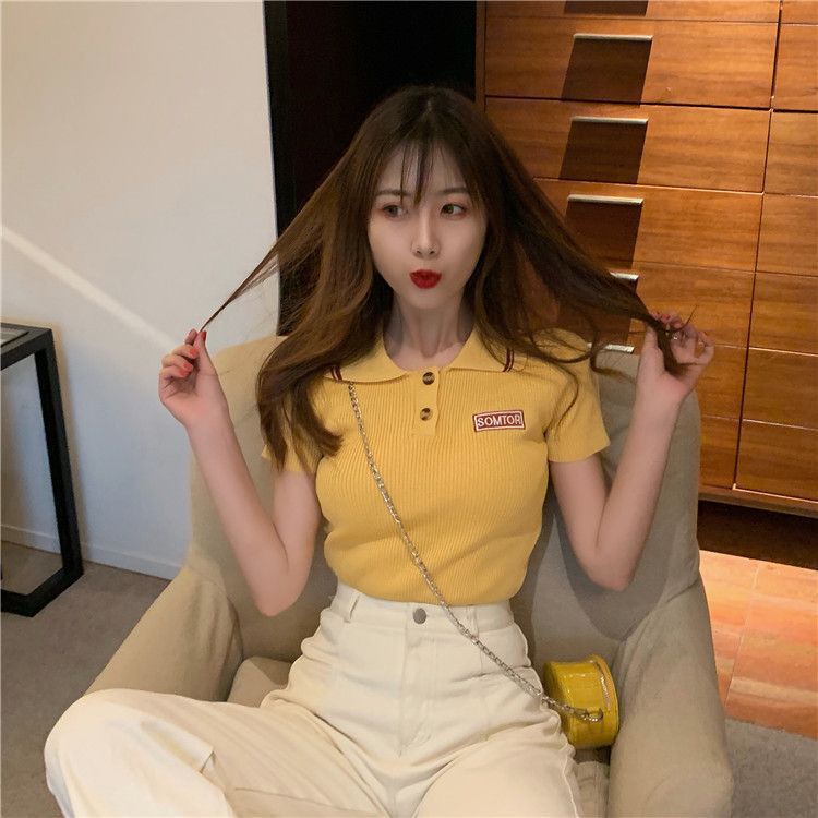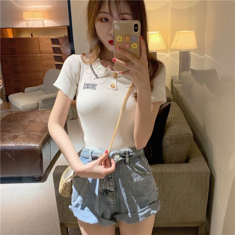 여름 새로운 빈티지 홍콩 스타일 유행 작은 짧은 두 버튼 슬리밍 반팔 티셔츠 최고 학생 여성의 Instagram 패션스토어 가기