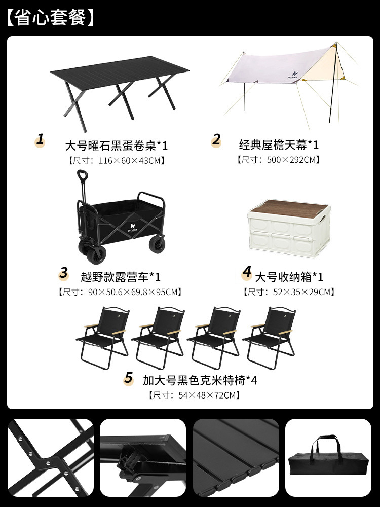 • [원활한 캠핑] 대형 흑요석 블랙 + 대형 블랙 의자*4+3x4m 캐노피+수납바구니