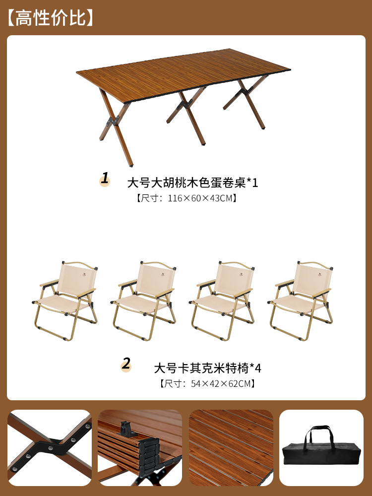 • [원활한 캠핑] 대형 월넛 컬러 테이블 + 대형 카키색 의자*4+3x4m 캐노피+수납바구니
