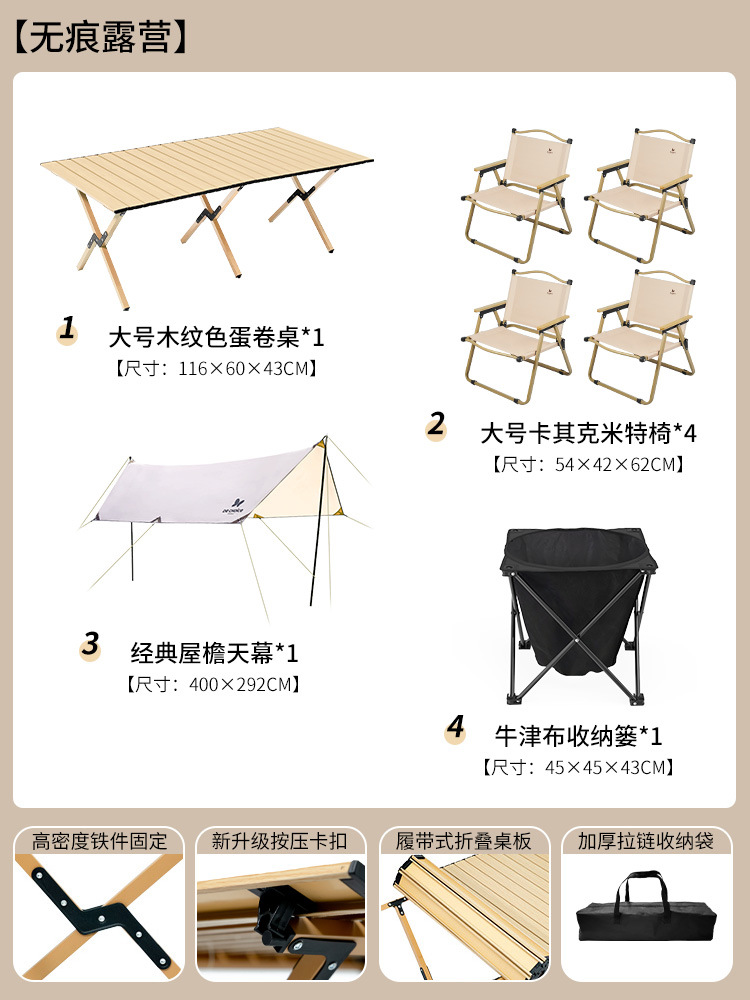 • [걱정없는 세트] 대형 나뭇결 컬러 + 특대 카키 의자*4+3x5m 캐노피+카트+수납함