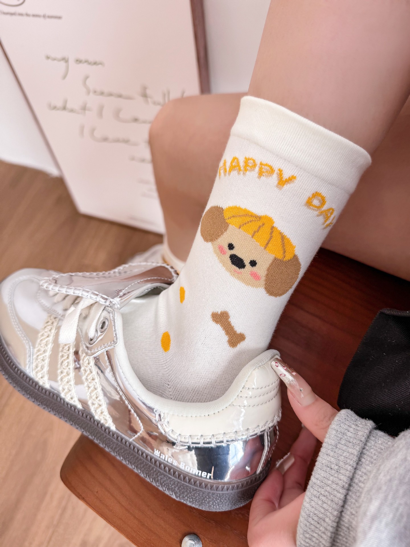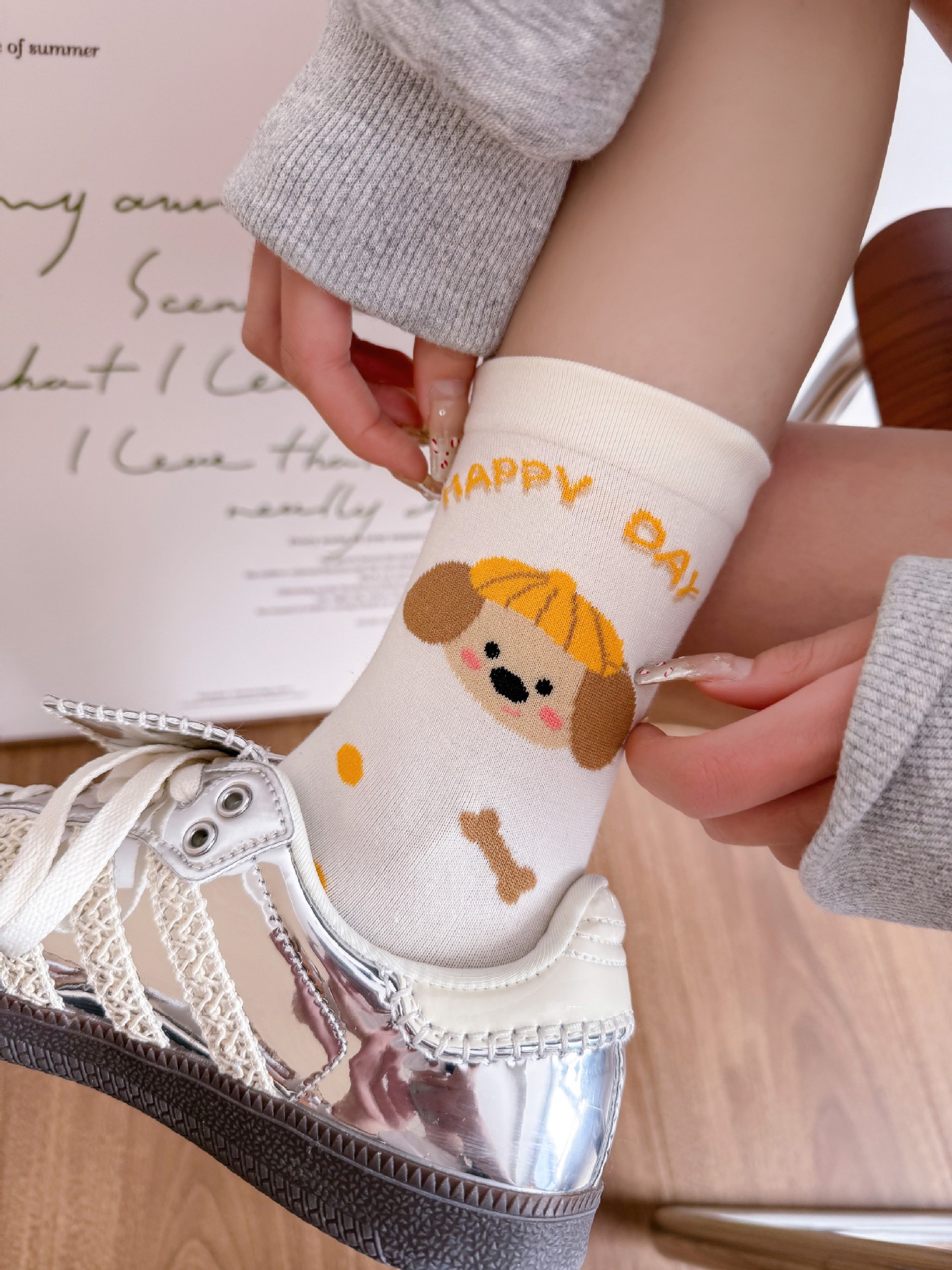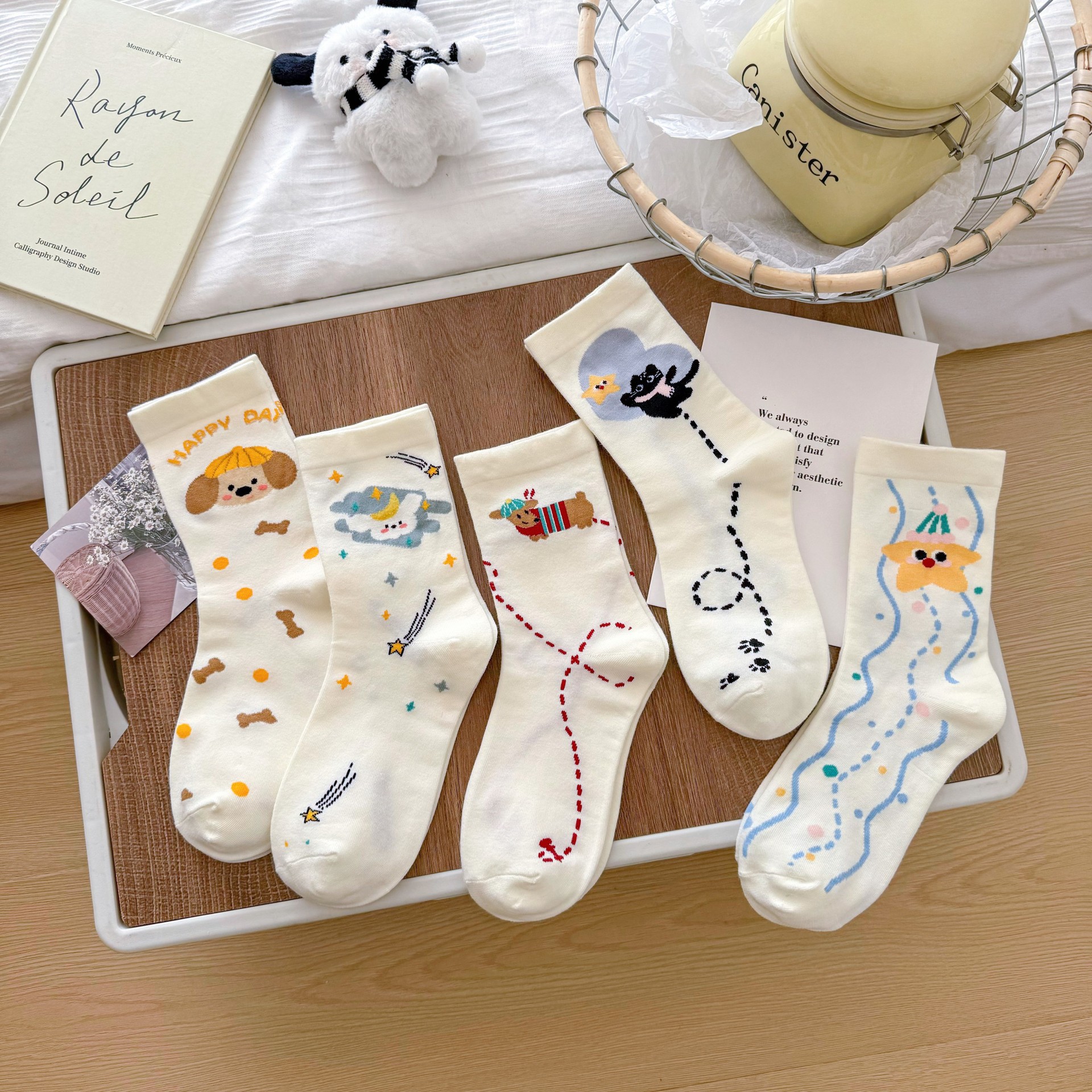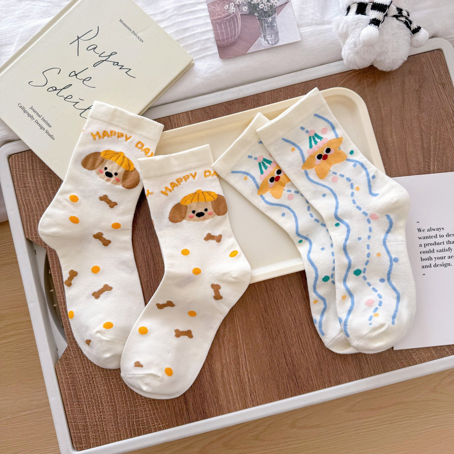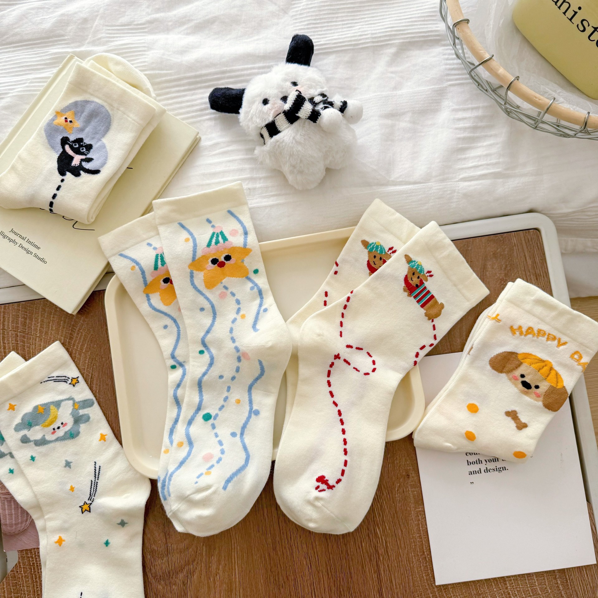 귀여운 강아지 양말 여성용 봄 가을 대학 스타일 일본풍 일러스트 만화 별 중목 양말 한국 스타일 학생용 면 양말