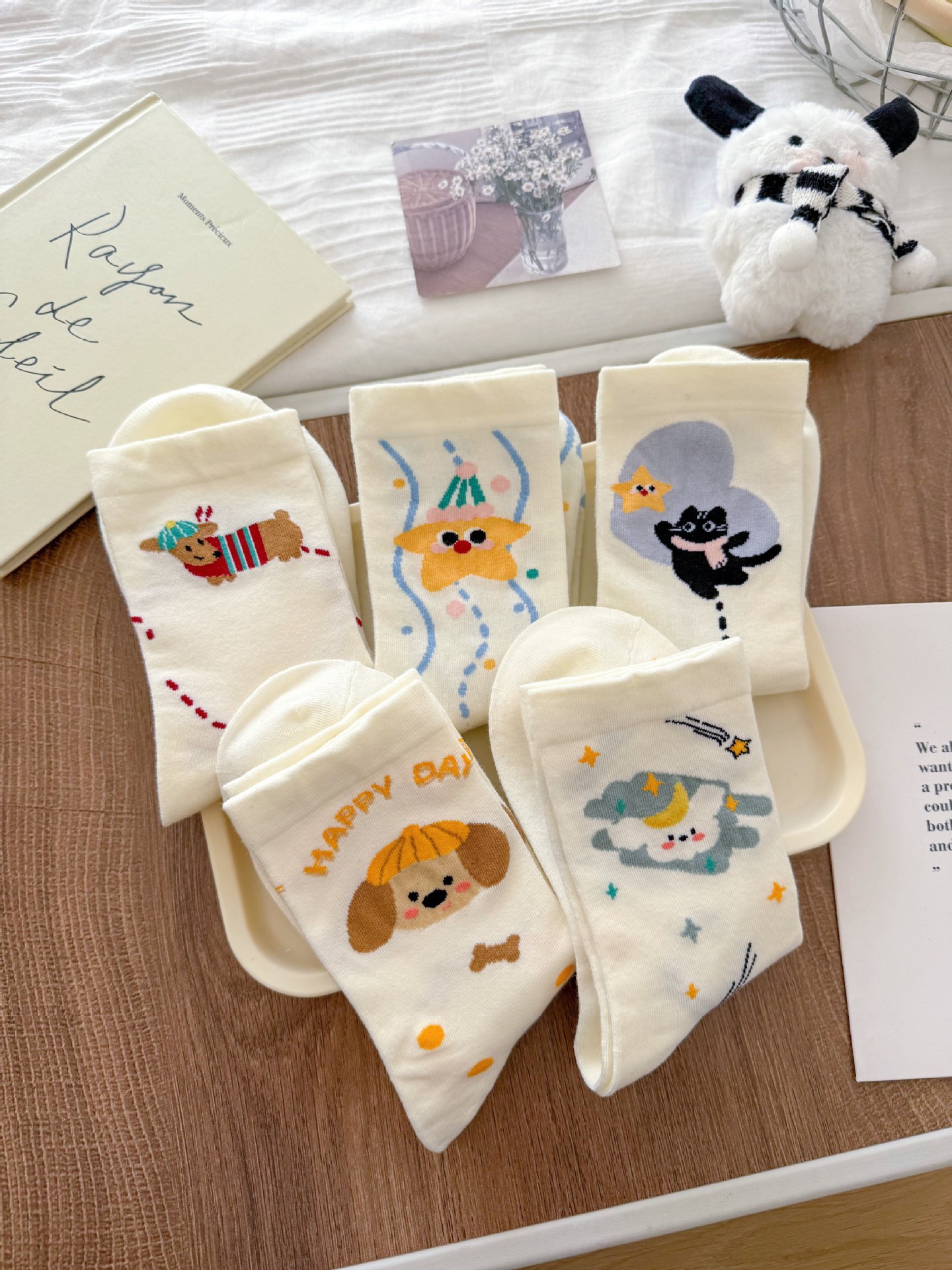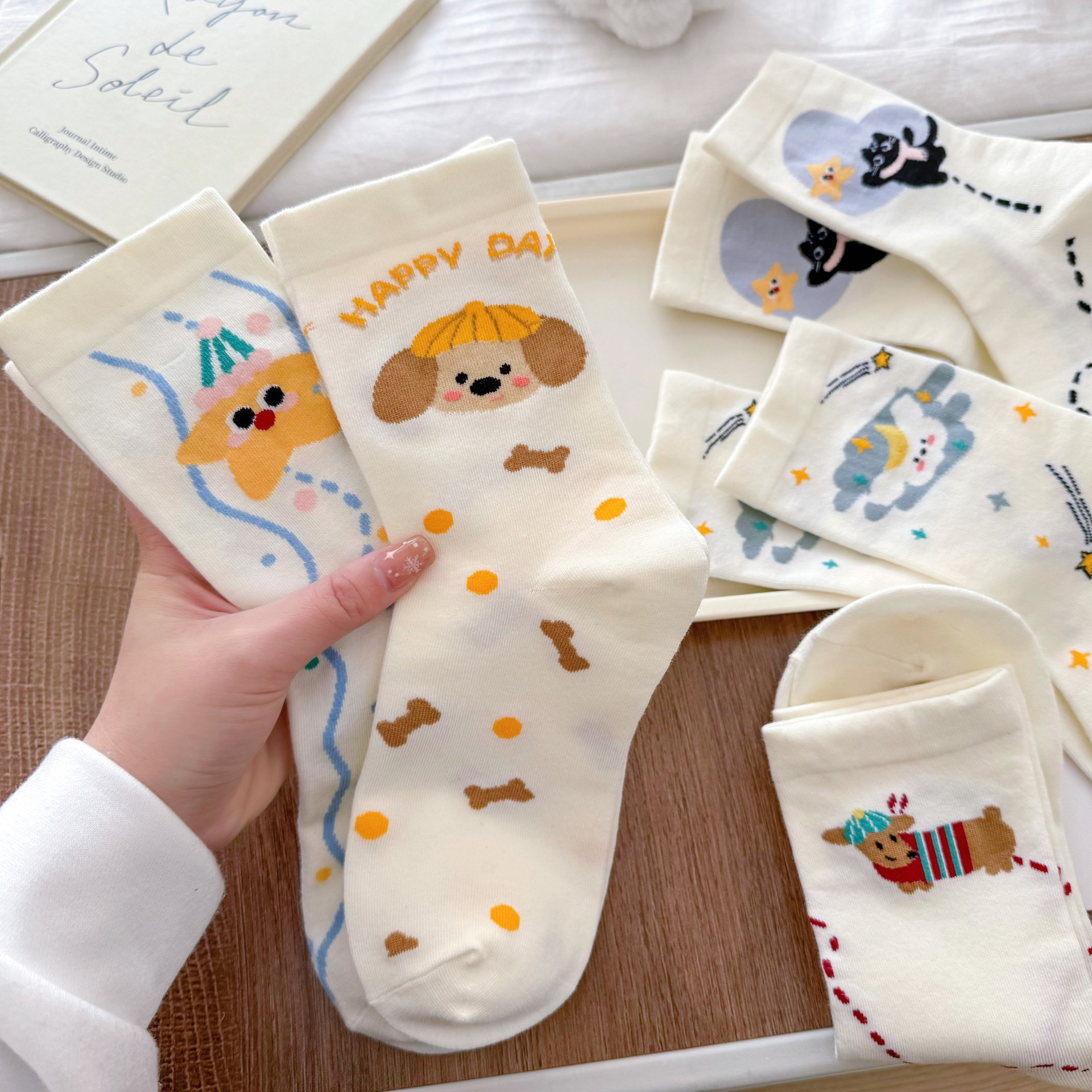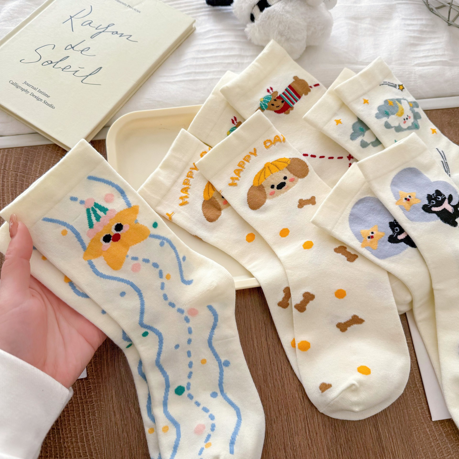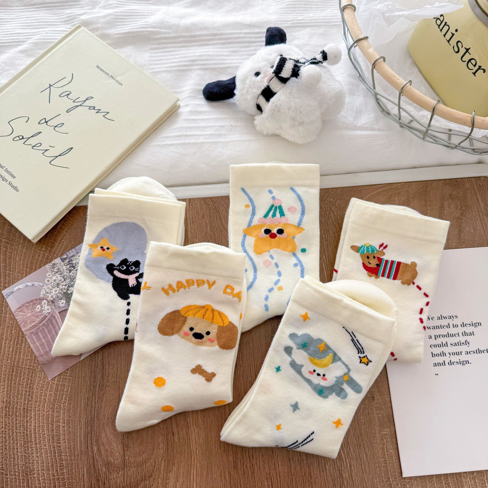 귀여운 강아지 양말 여성용 봄 가을 대학 스타일 일본풍 일러스트 만화 별 중목 양말 한국 스타일 학생용 면 양말