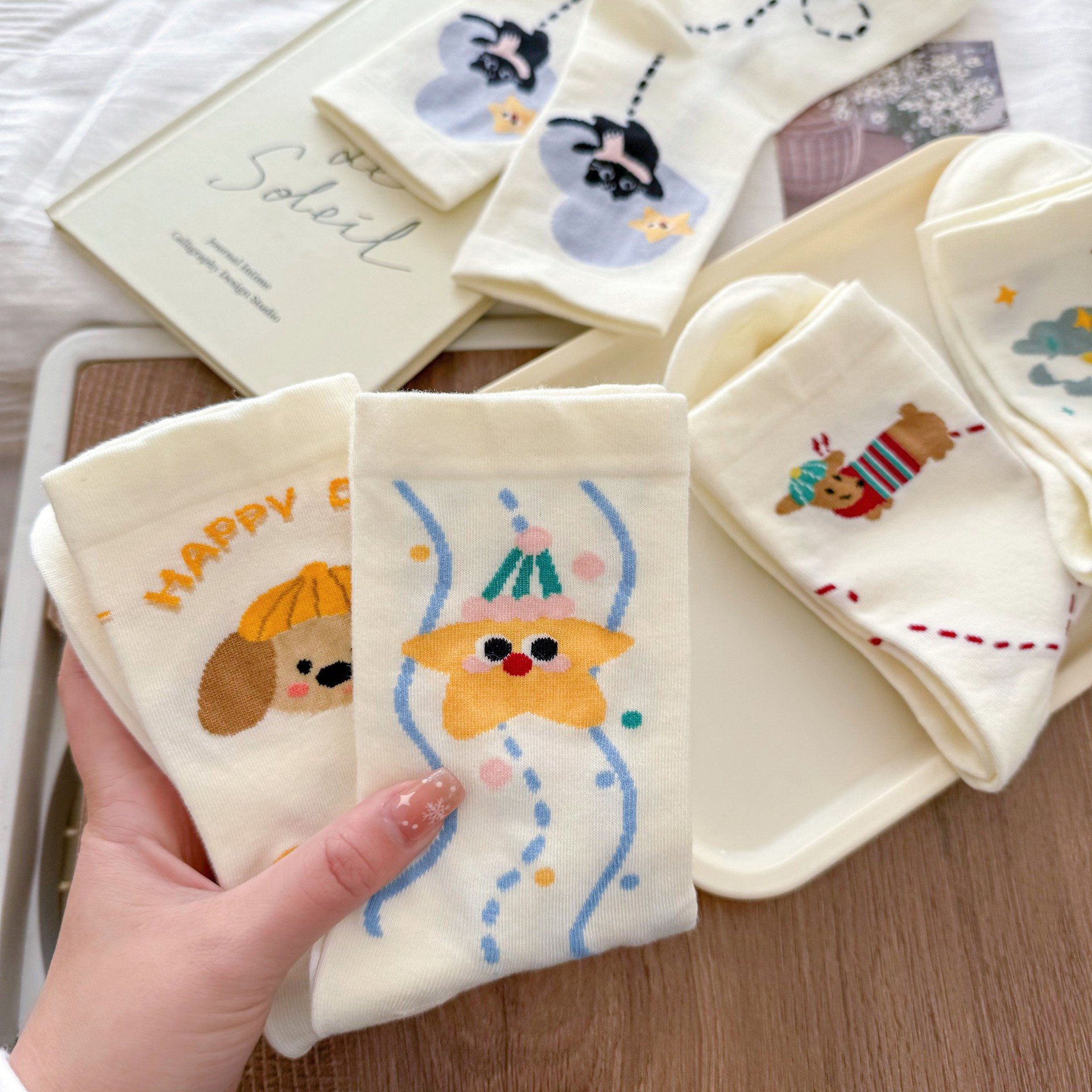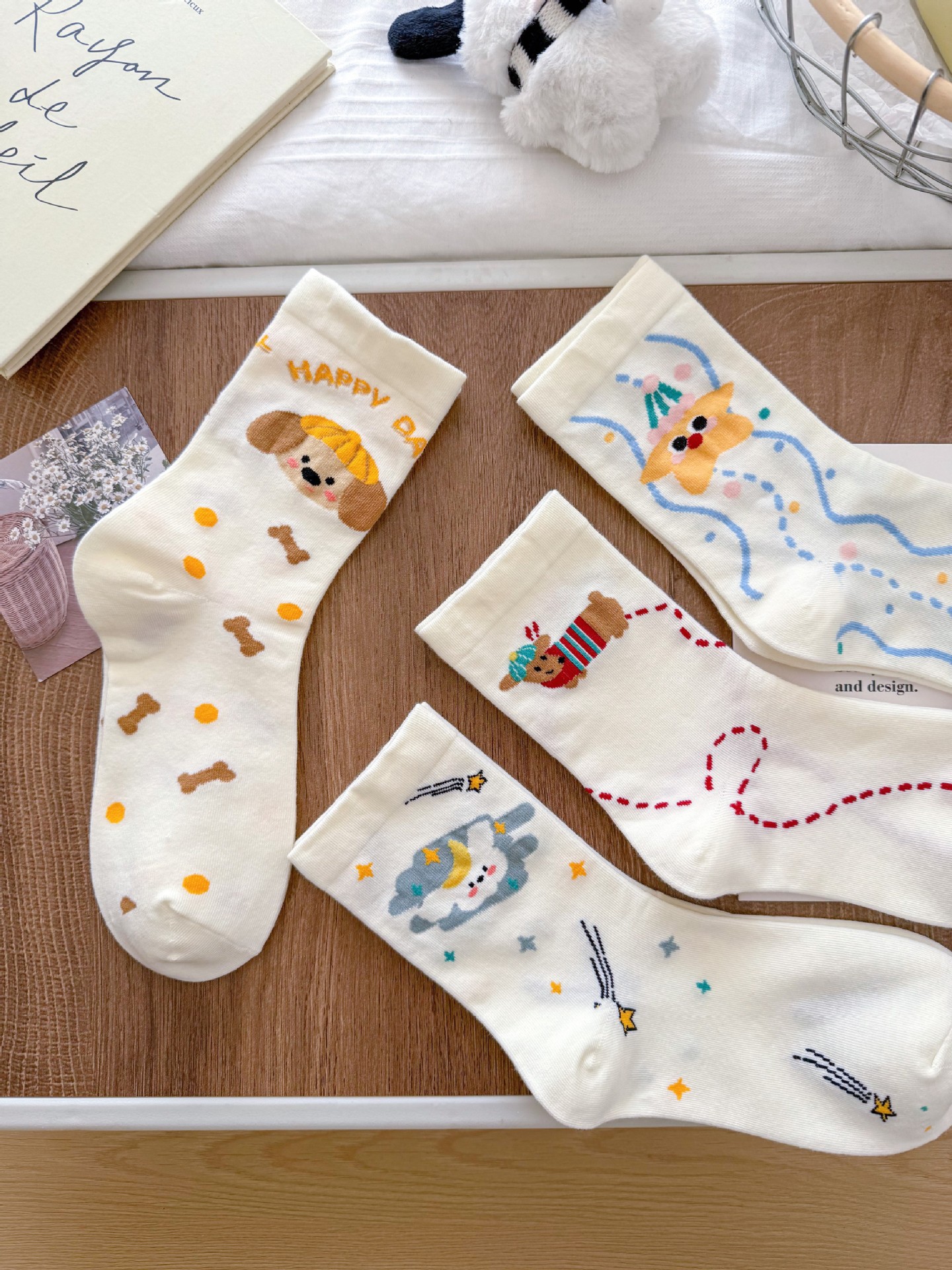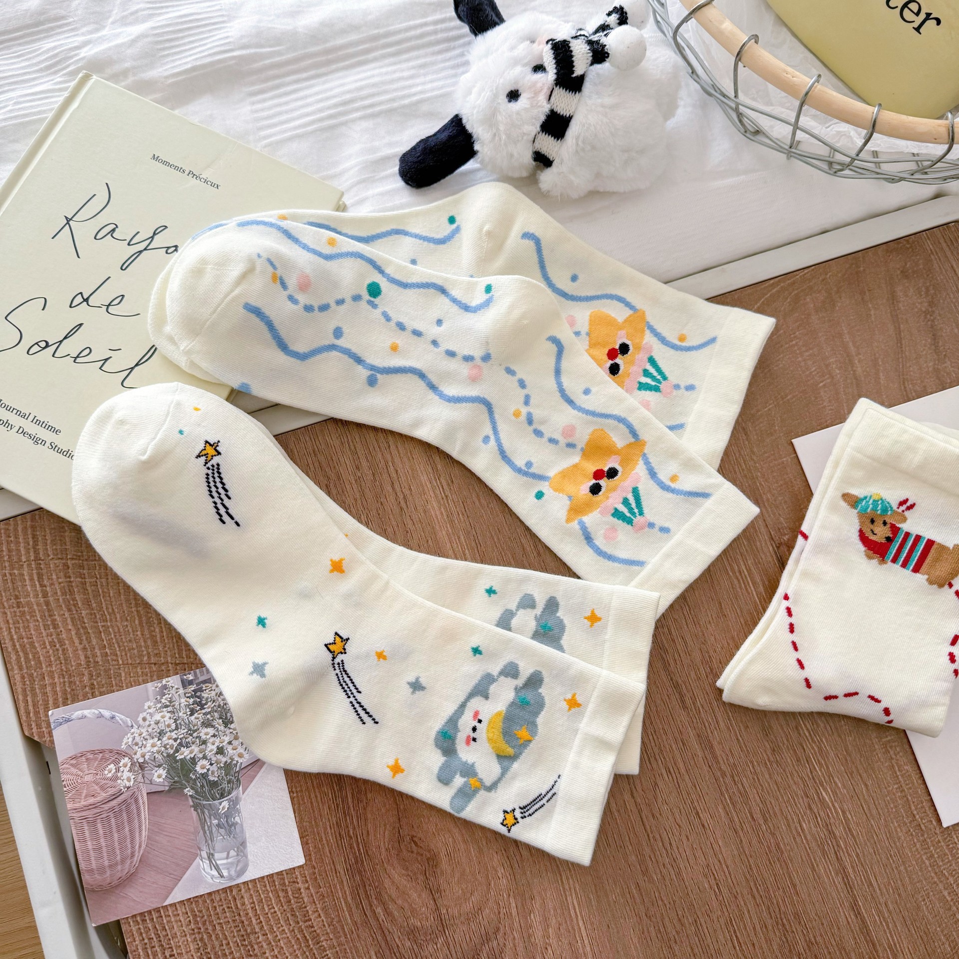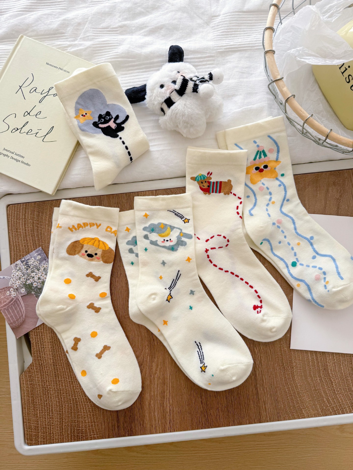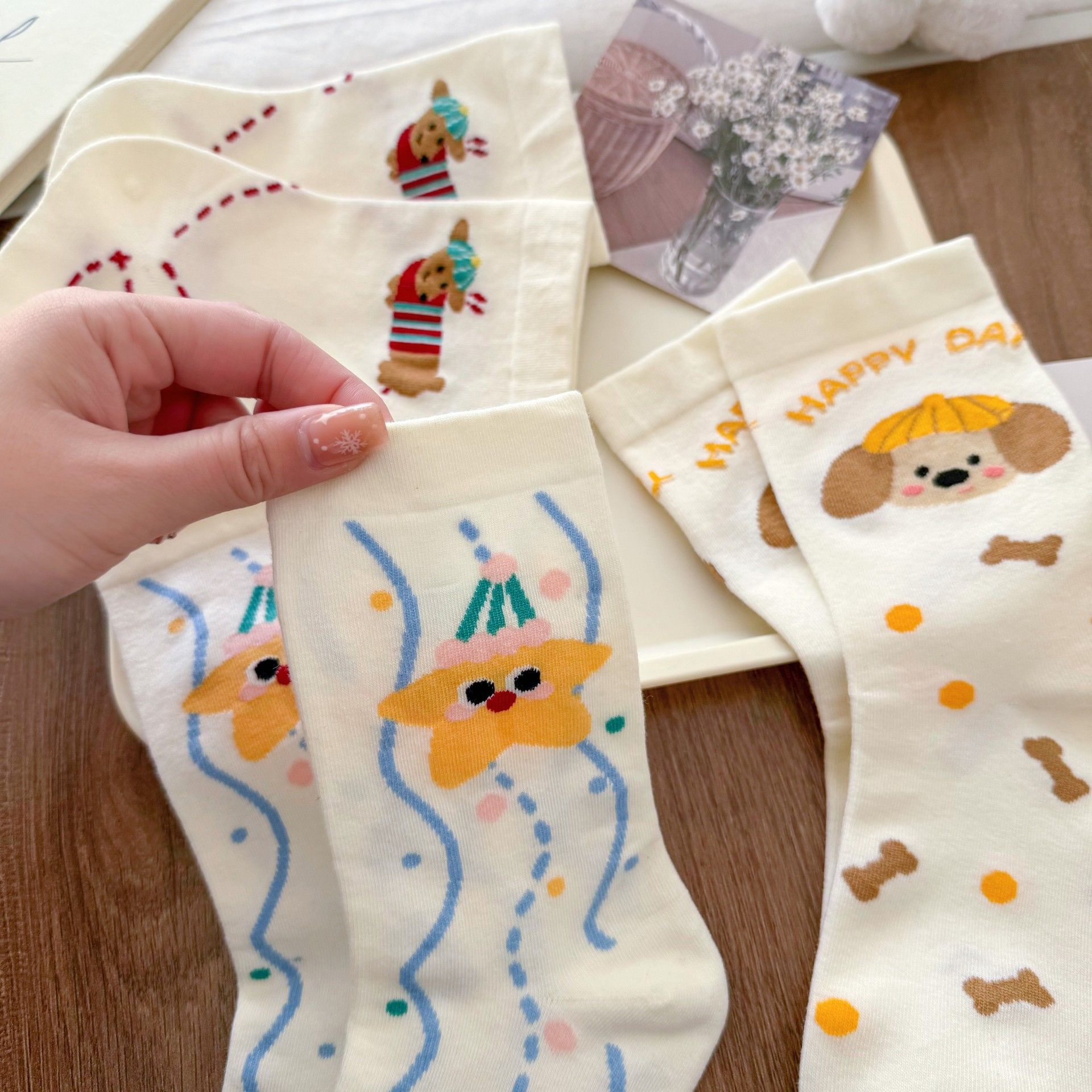 귀여운 강아지 양말 여성용 봄 가을 대학 스타일 일본풍 일러스트 만화 별 중목 양말 한국 스타일 학생용 면 양말