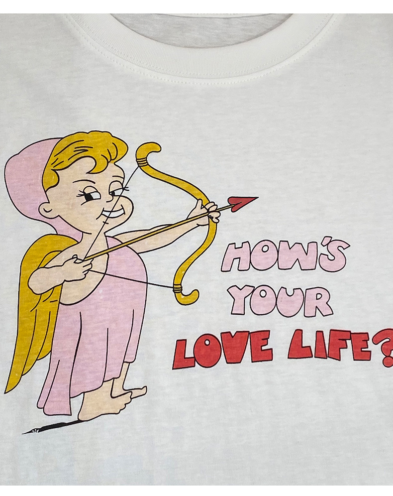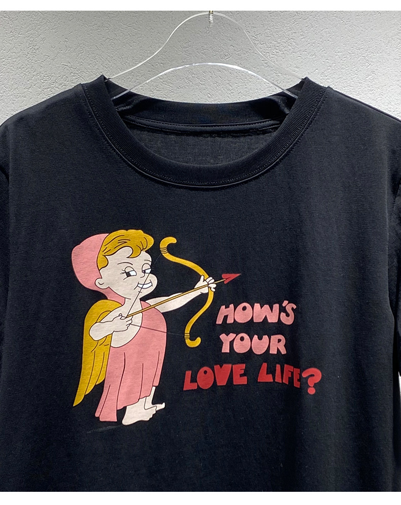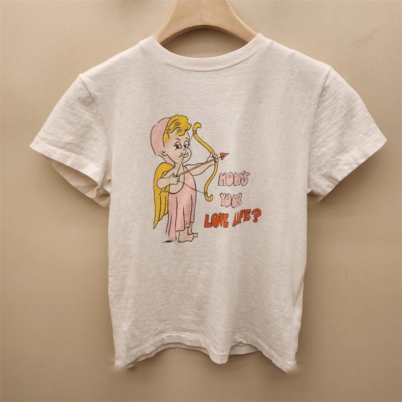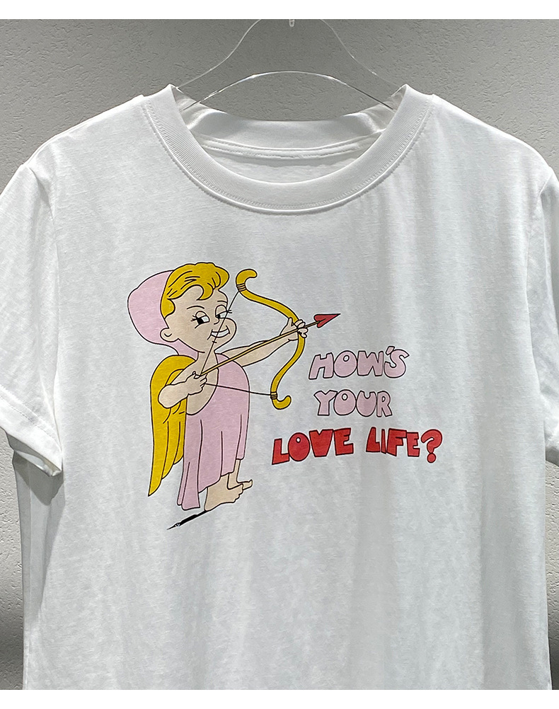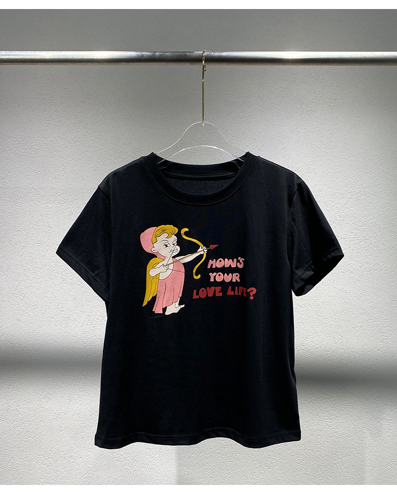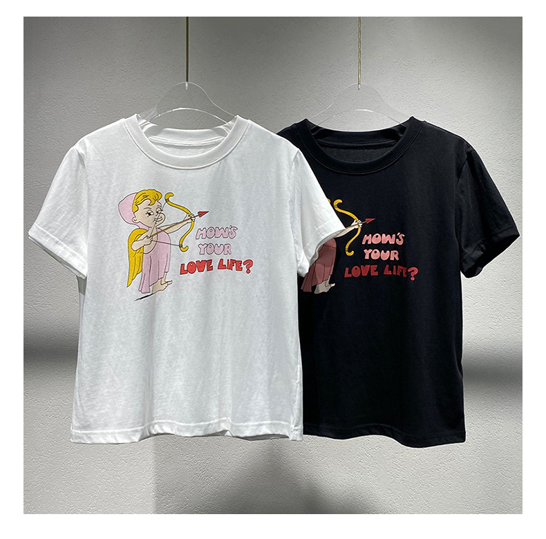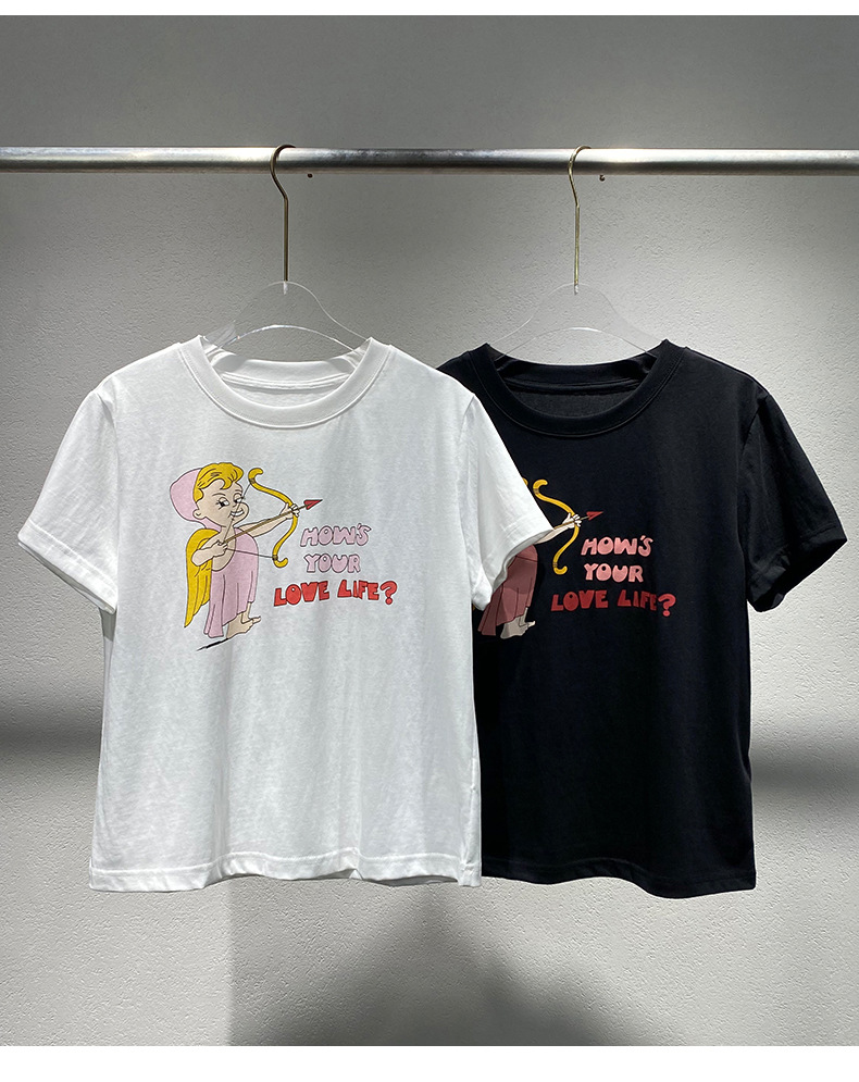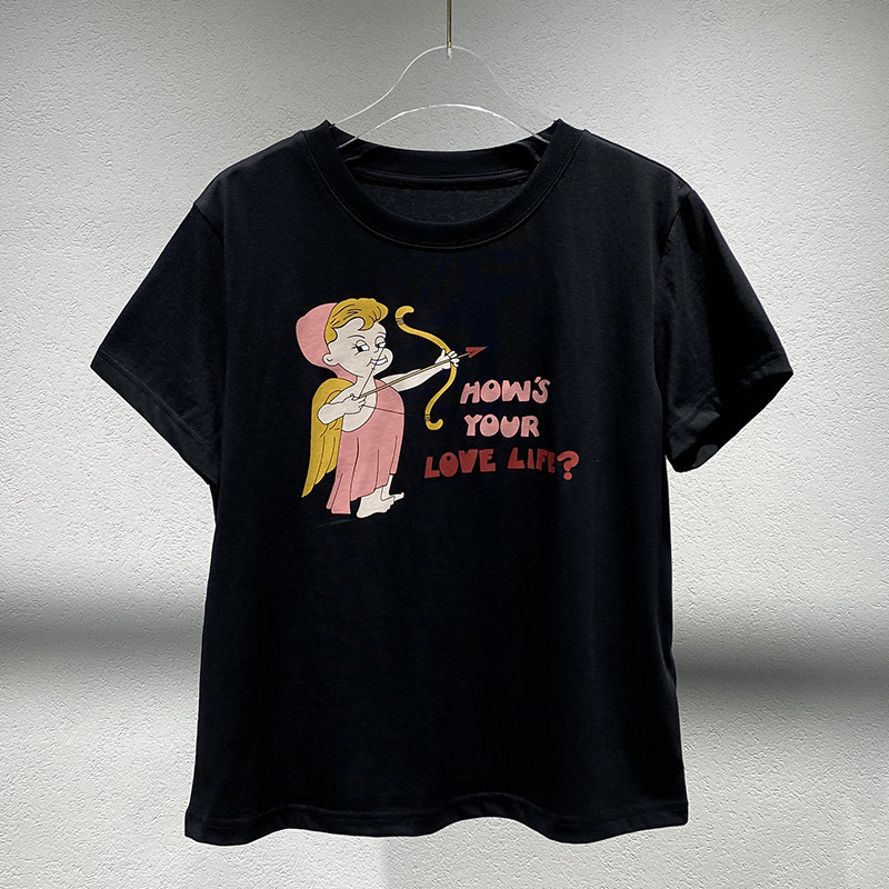 Now Niche 2025 봄 여름 새로운 솔리드 컬러 라운드 넥 만화 큐피드 프린트 여성용 다목적 반팔 티셔츠스토어 가기