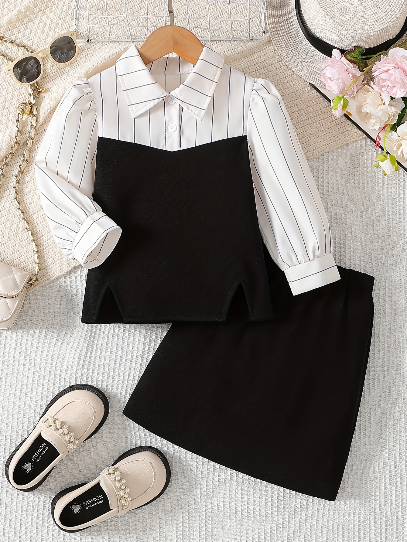 소녀의 봄 원피스 가짜 2 조각 줄무늬 셔츠 바느질 흑백 대비 컬러 아카데미 스타일 스커트 어린이 투피스스토어 가기