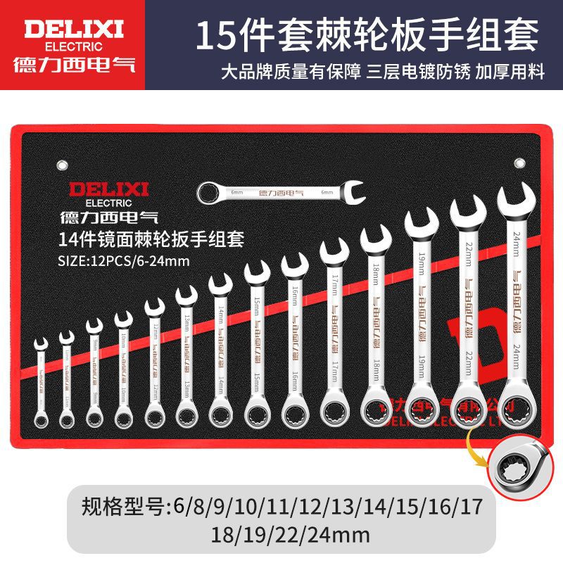 • Delixi 전기 래칫 콤비네이션 렌치 15개 세트[6-24mm]