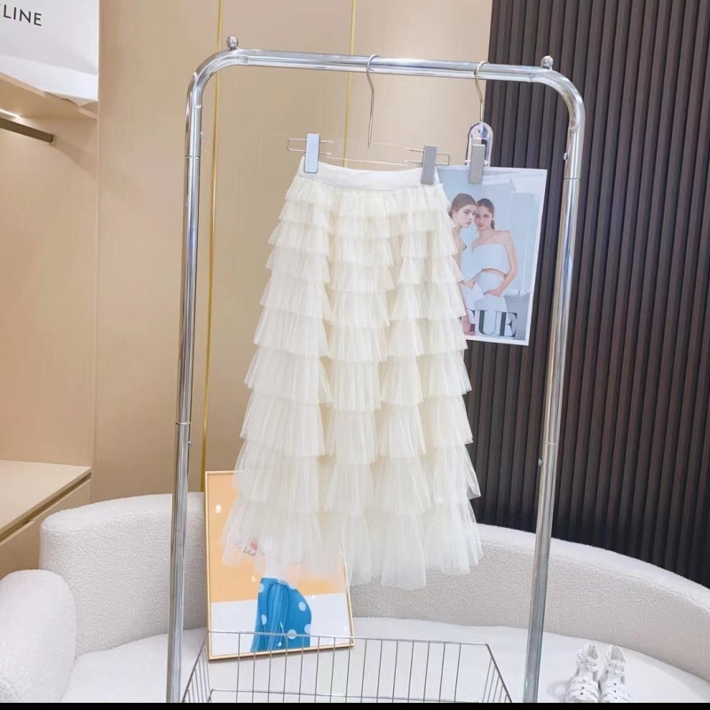 • 흰색 티셔츠 + 베이지색 케이크 스커트