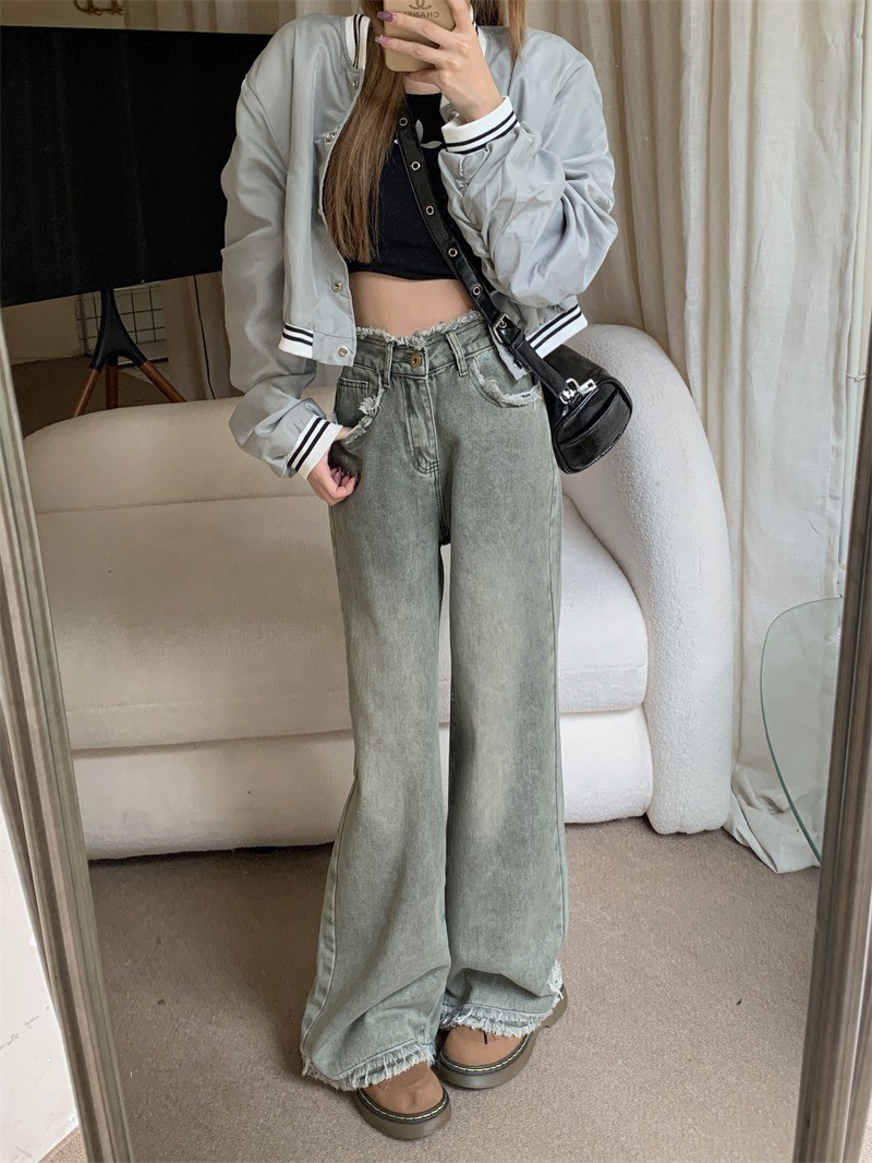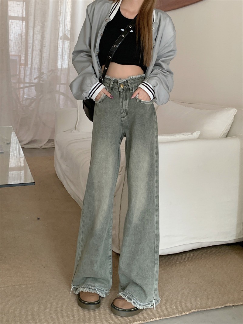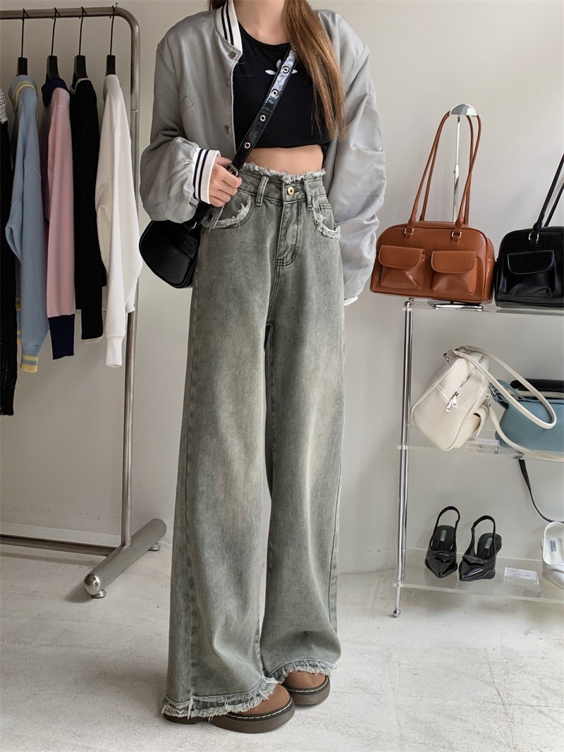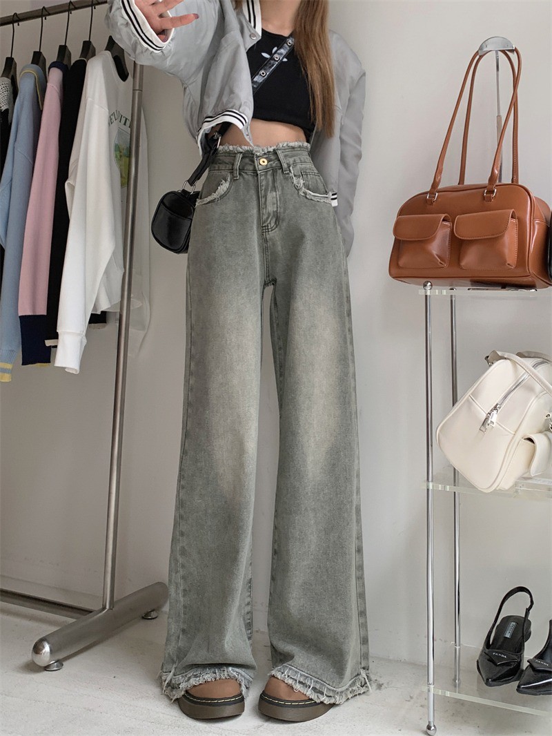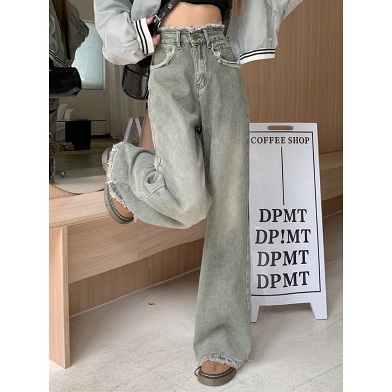 스트레이트 레그 걸레 바지 높은 허리 올매치 올드 레트로 여성의 봄과 가을 홍콩 스타일 청바지 센스 새로운 디자인 와이드 다리 틈새스토어 가기