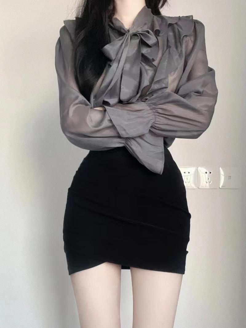 셔츠 우아한 두 조각 품질 새로운 여성의 최고 봄과 가을 엉덩이 스커트 로얄 자매 라이트 성숙한 바람 회색