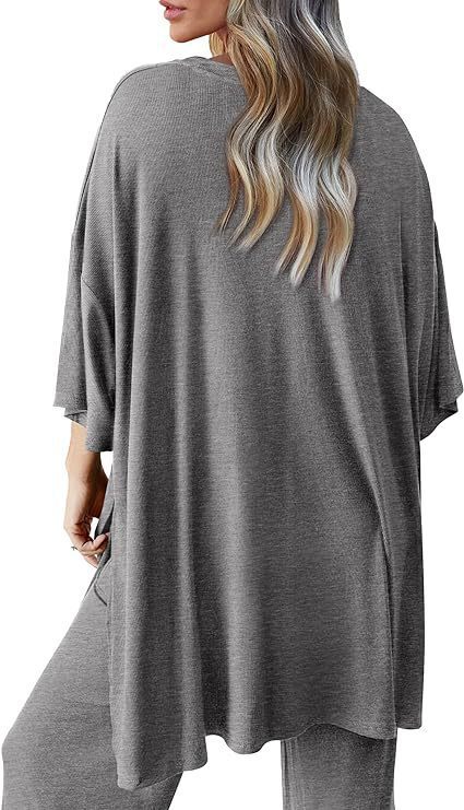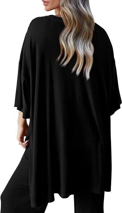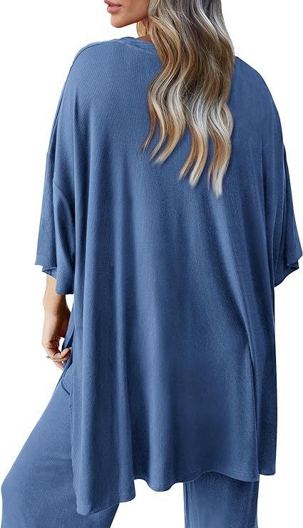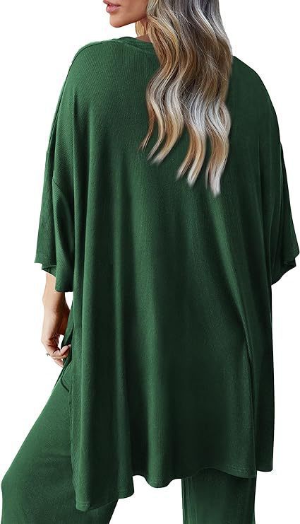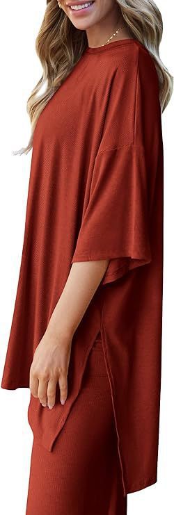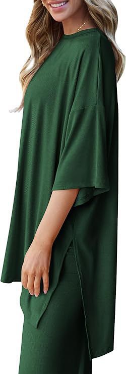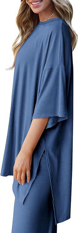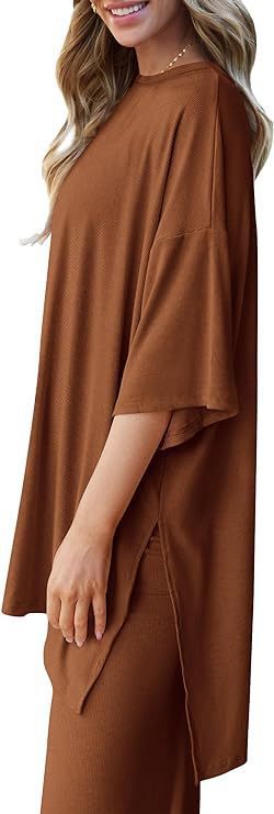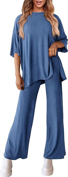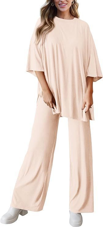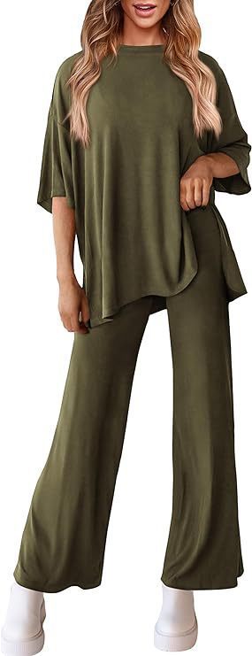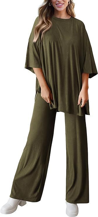 2025 아마존 여성 2 피스 캐주얼 반팔 풀오버 탑 와이드 레그 팬츠 캐주얼 세트 여성용 트랙웨어스토어 가기