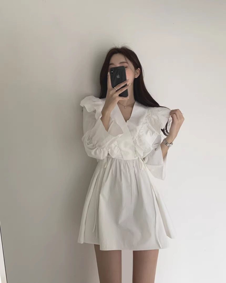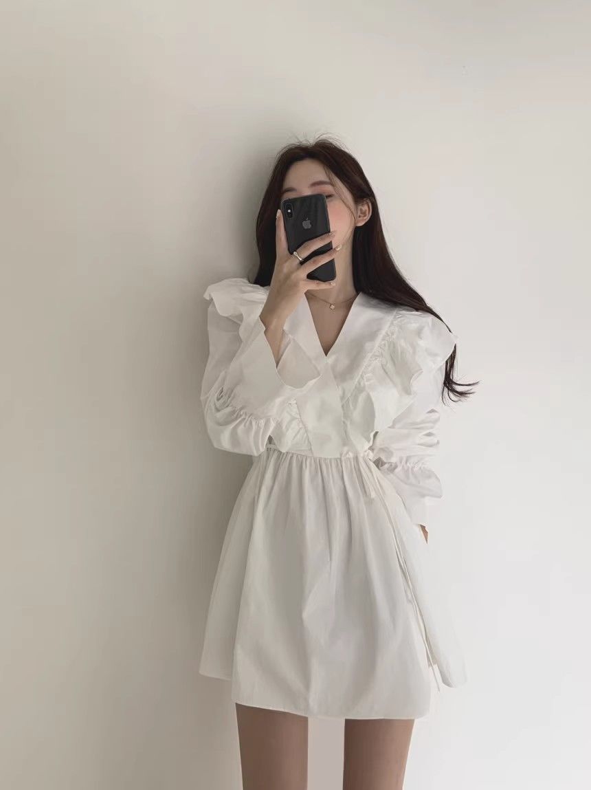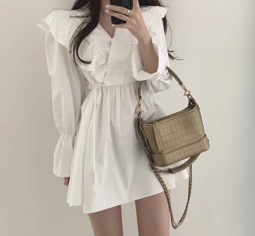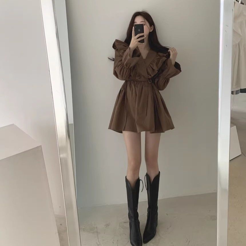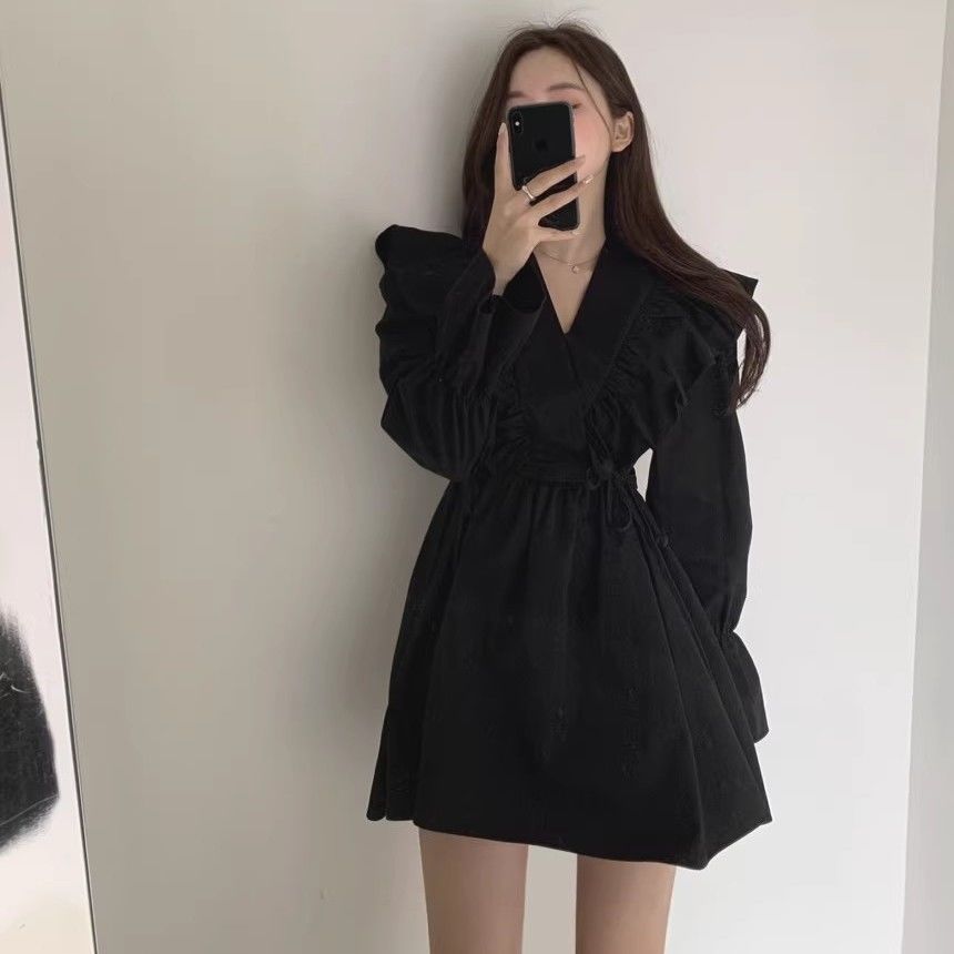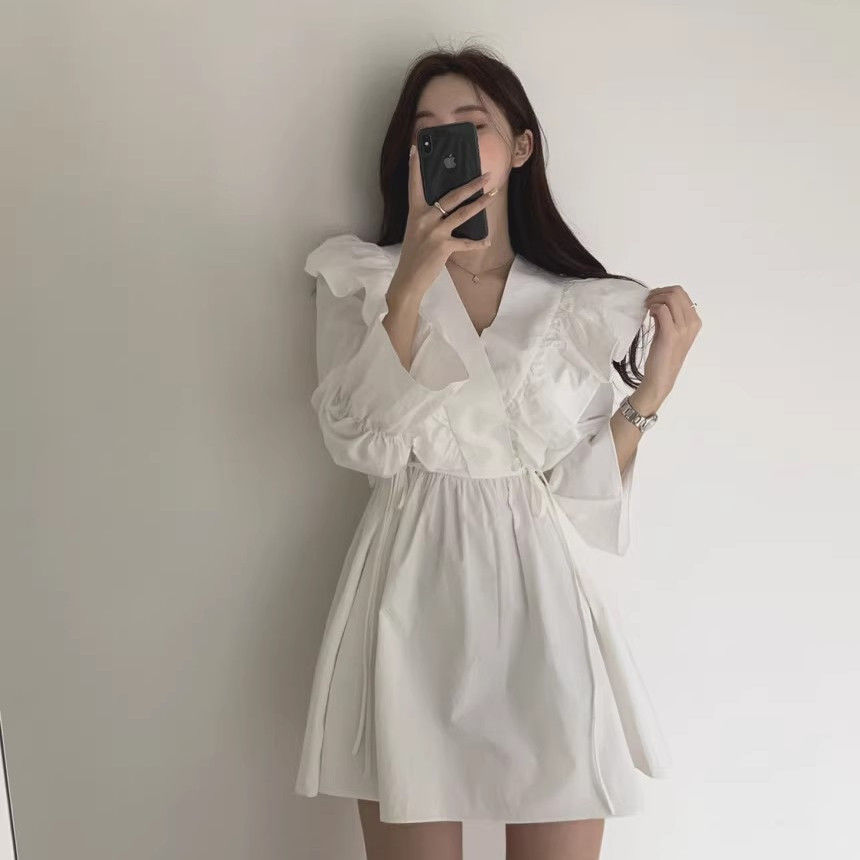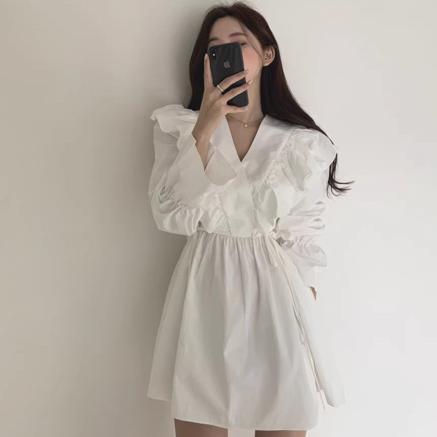 레이스 원피스 여자 2925 새로운 봄 스커트 레이스 허리 트럼펫 소매 짧은 작은 I 빈티지 V-Neck스토어 가기