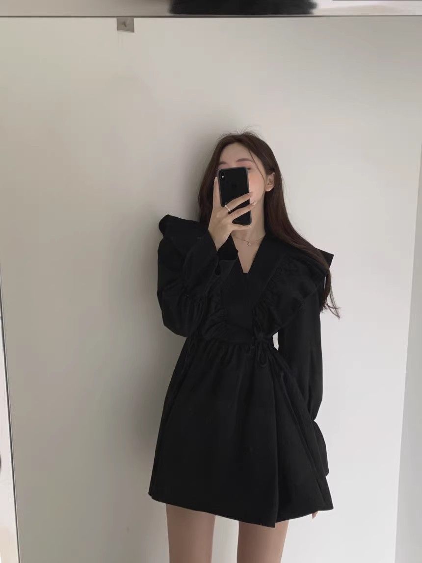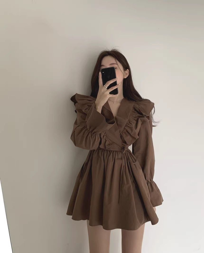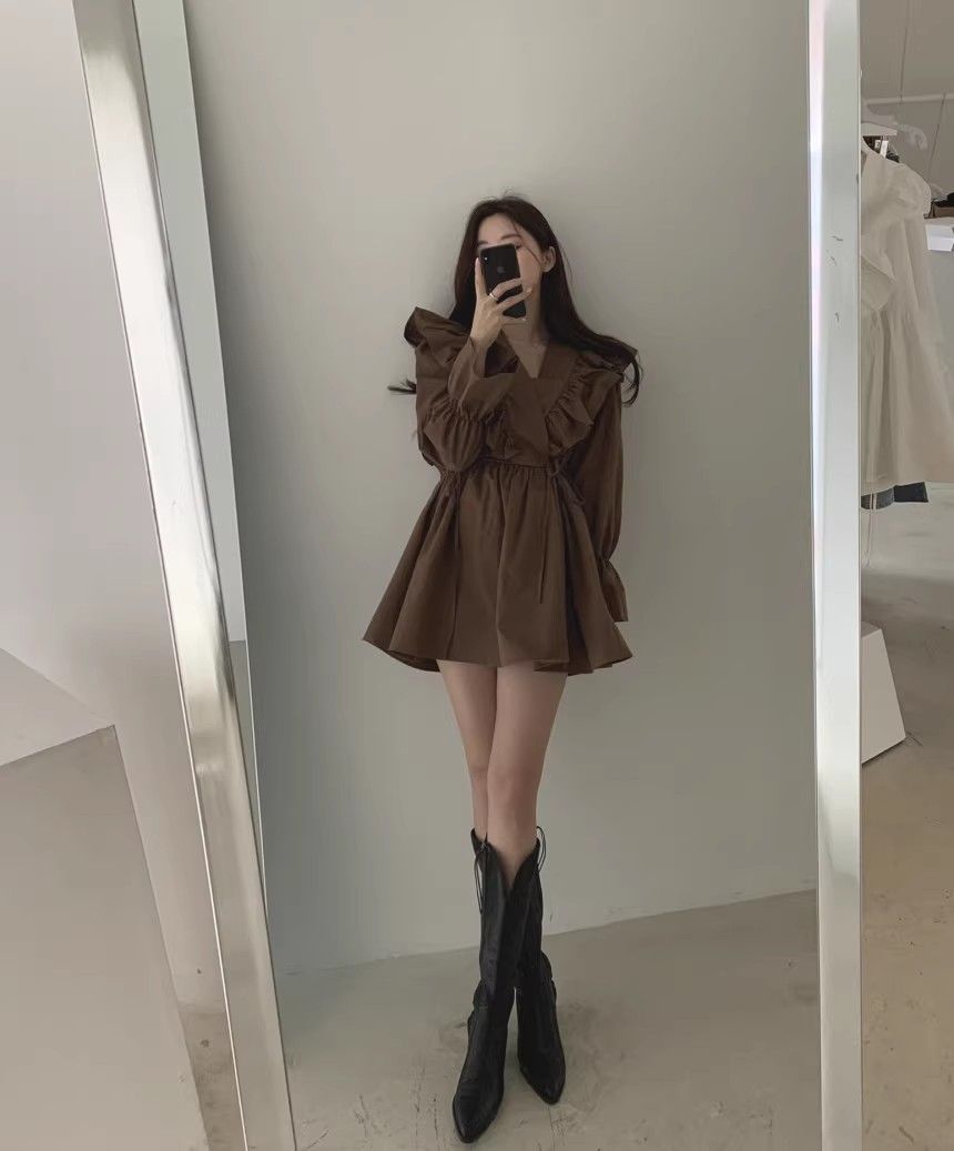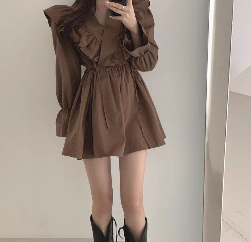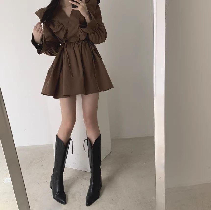 레이스 원피스 여자 2925 새로운 봄 스커트 레이스 허리 트럼펫 소매 짧은 작은 I 빈티지 V-Neck스토어 가기
