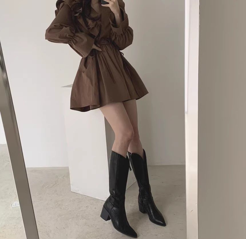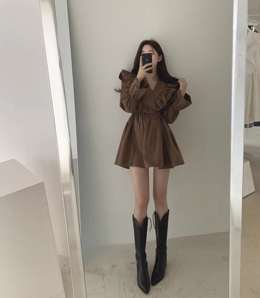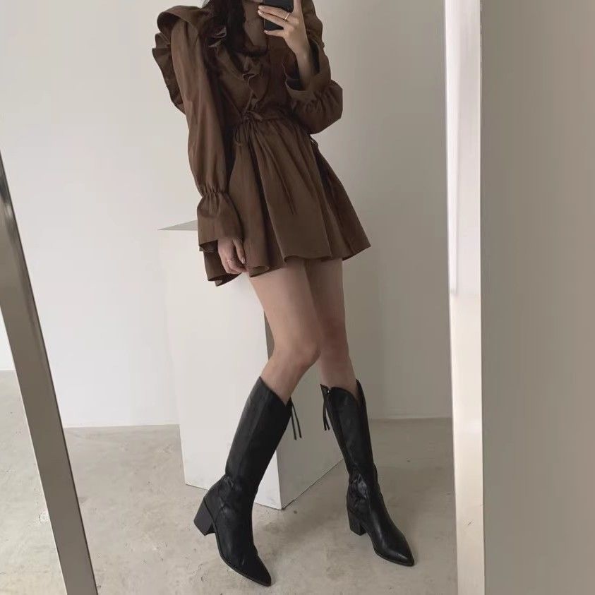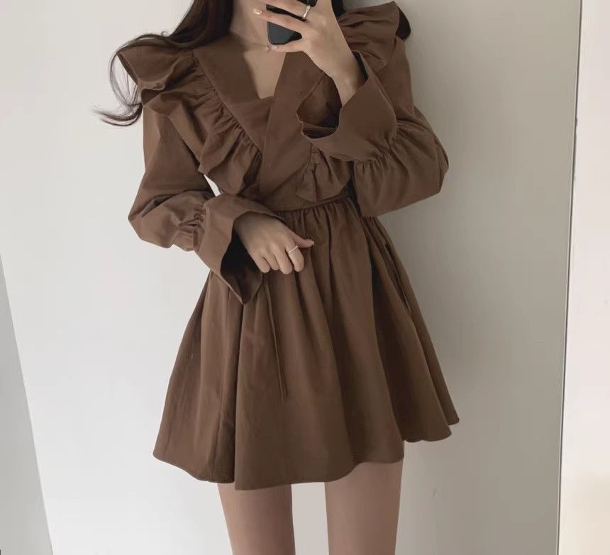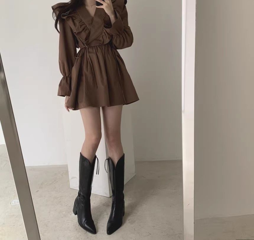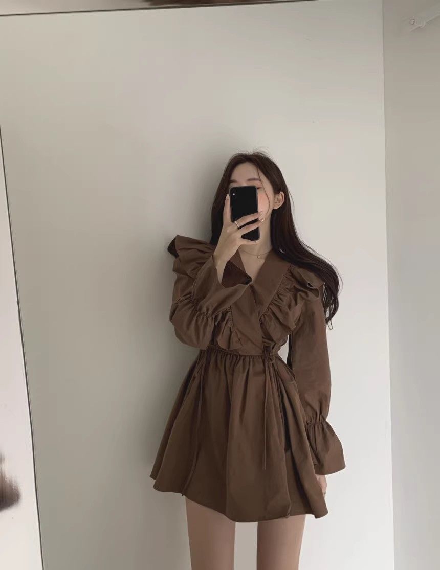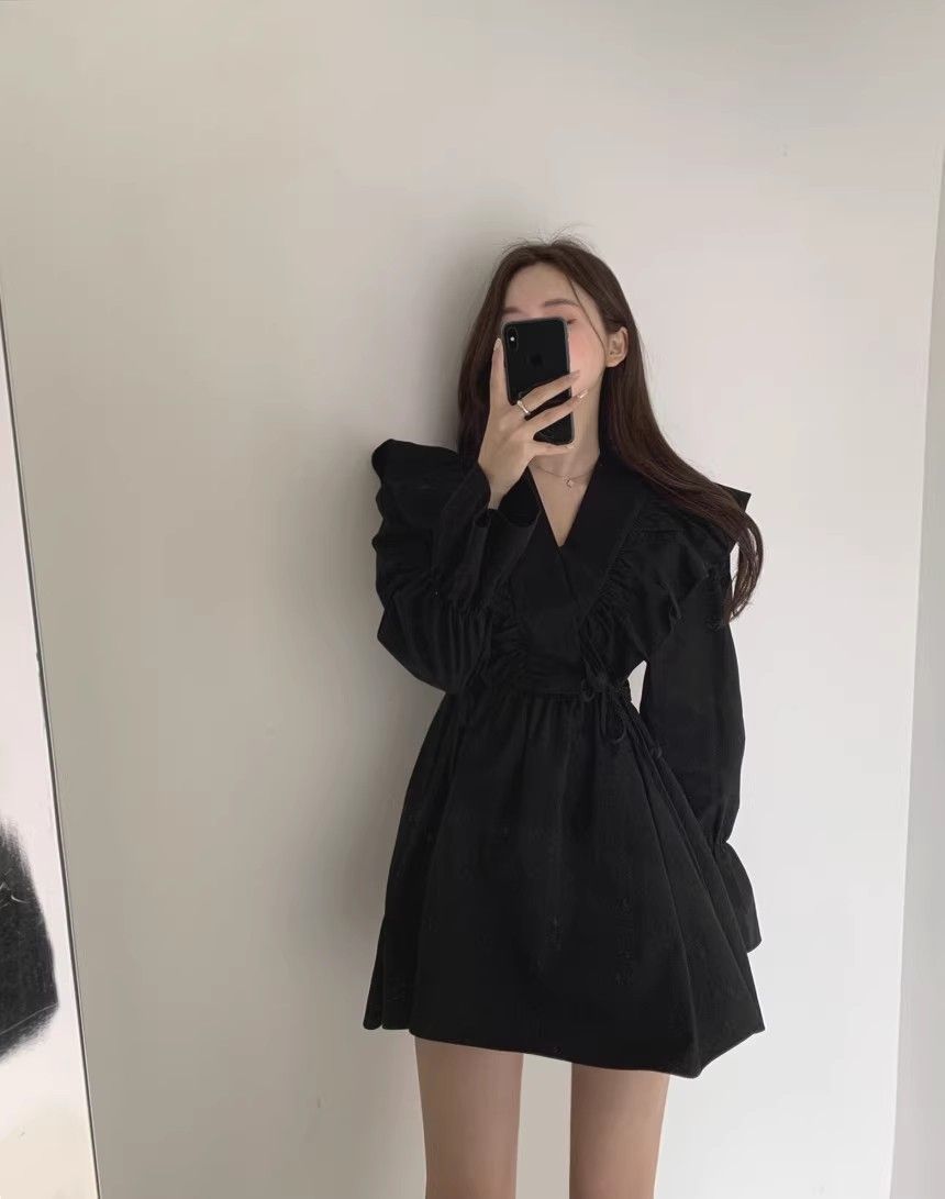 레이스 원피스 여자 2925 새로운 봄 스커트 레이스 허리 트럼펫 소매 짧은 작은 I 빈티지 V-Neck스토어 가기