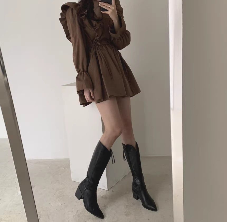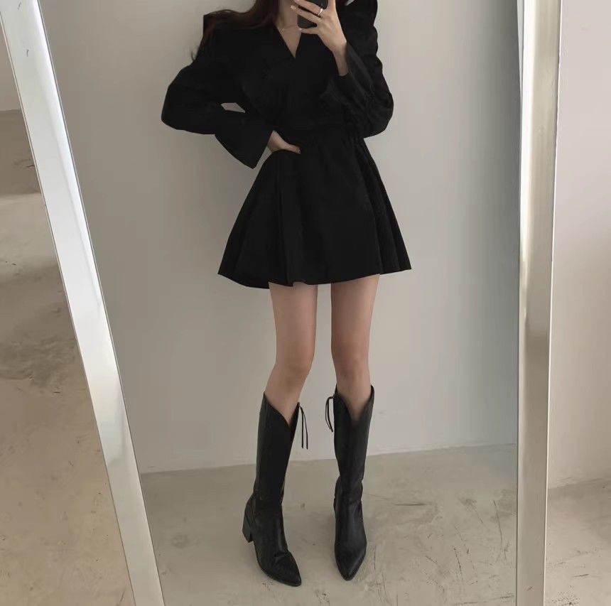 레이스 원피스 여자 2925 새로운 봄 스커트 레이스 허리 트럼펫 소매 짧은 작은 I 빈티지 V-Neck