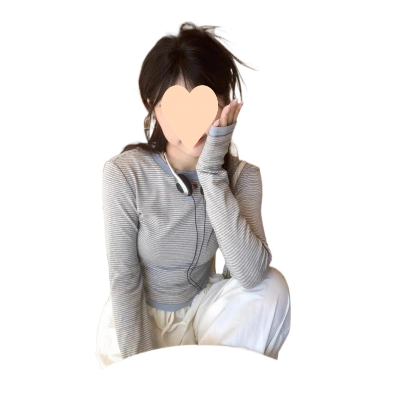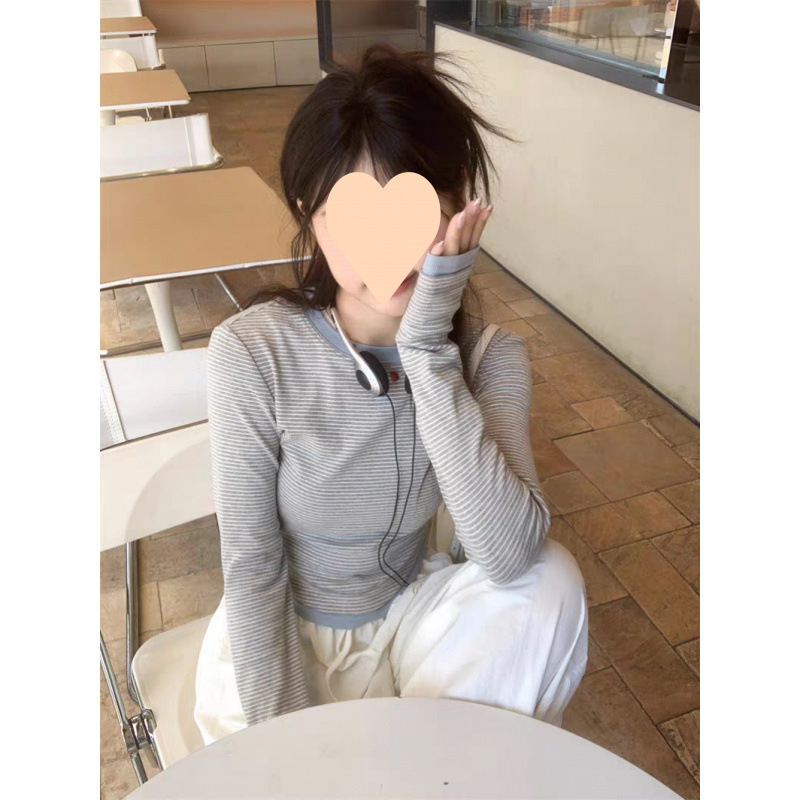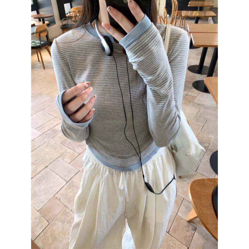 면 어깨 줄무늬 긴팔 셔츠 여성의 봄과 가을 2024 새로운 슬림베이스 셔츠 짧은 가짜 투피스 탑 트렌디스토어 가기