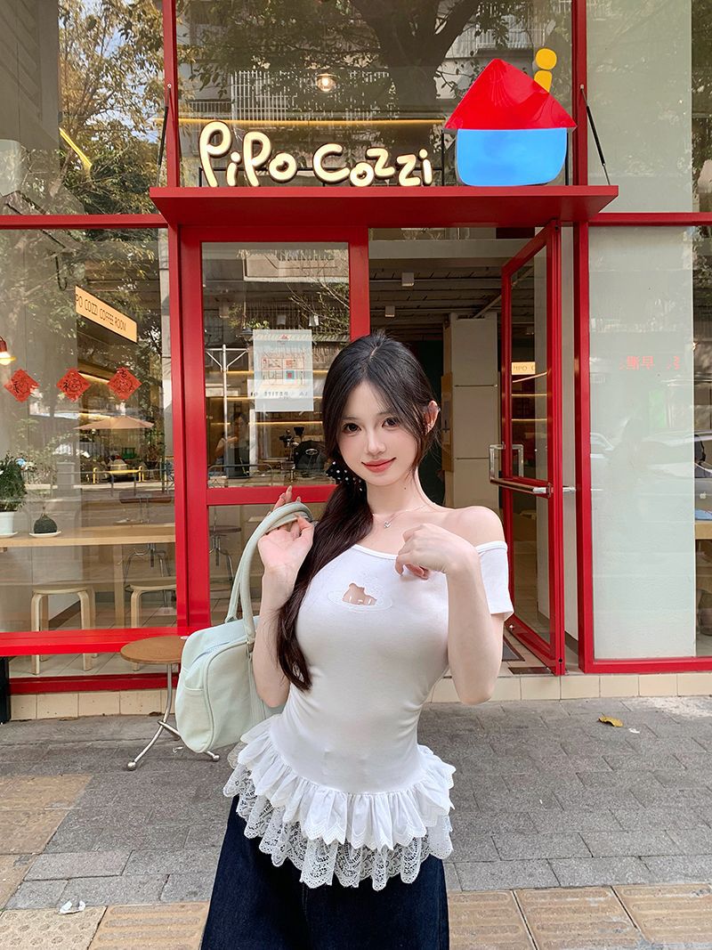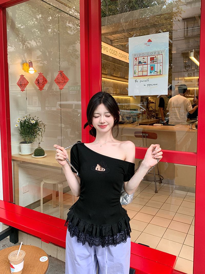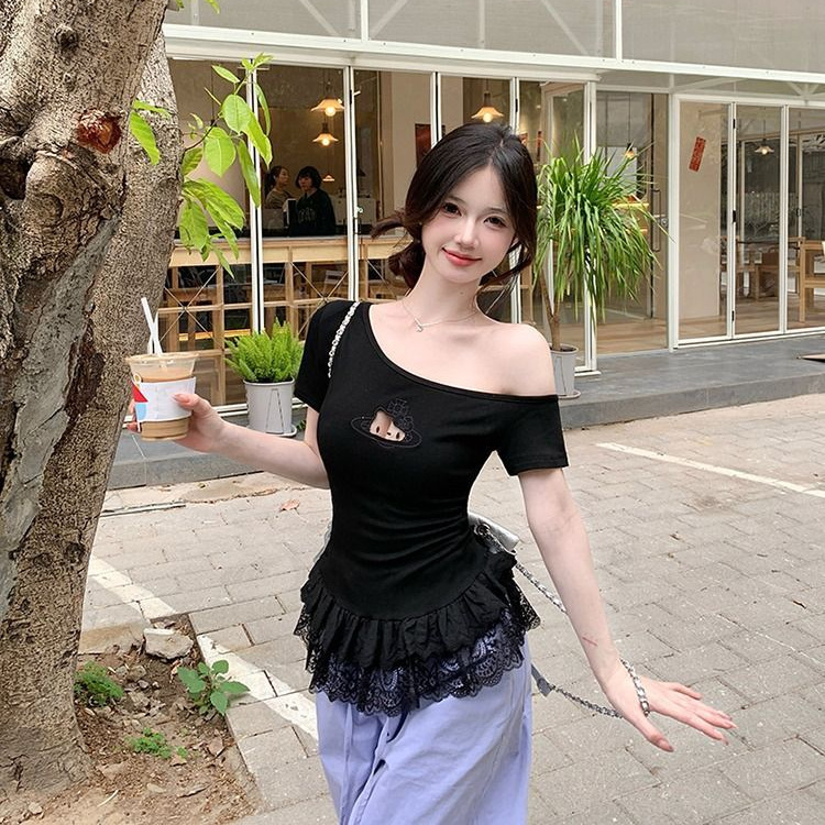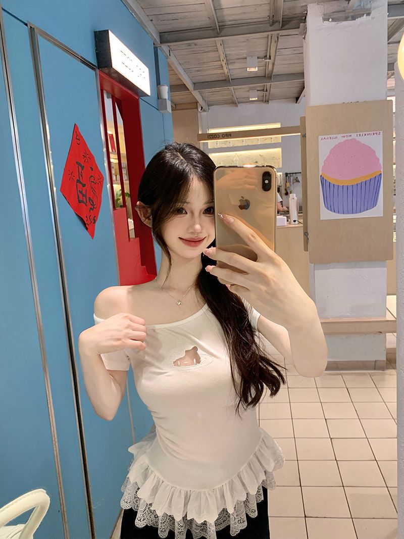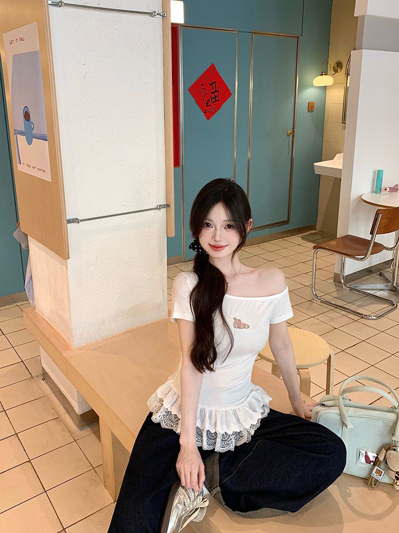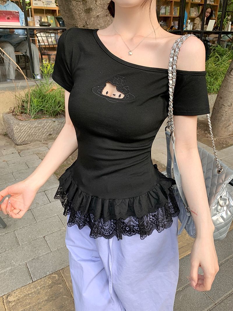 화이트 할로우 키티 슬랜트 어깨 반팔 티셔츠 여성용 여름 레이스 레이스 스위트 스파이스 소녀 짧은 어깨 퓨어 숄더 탑