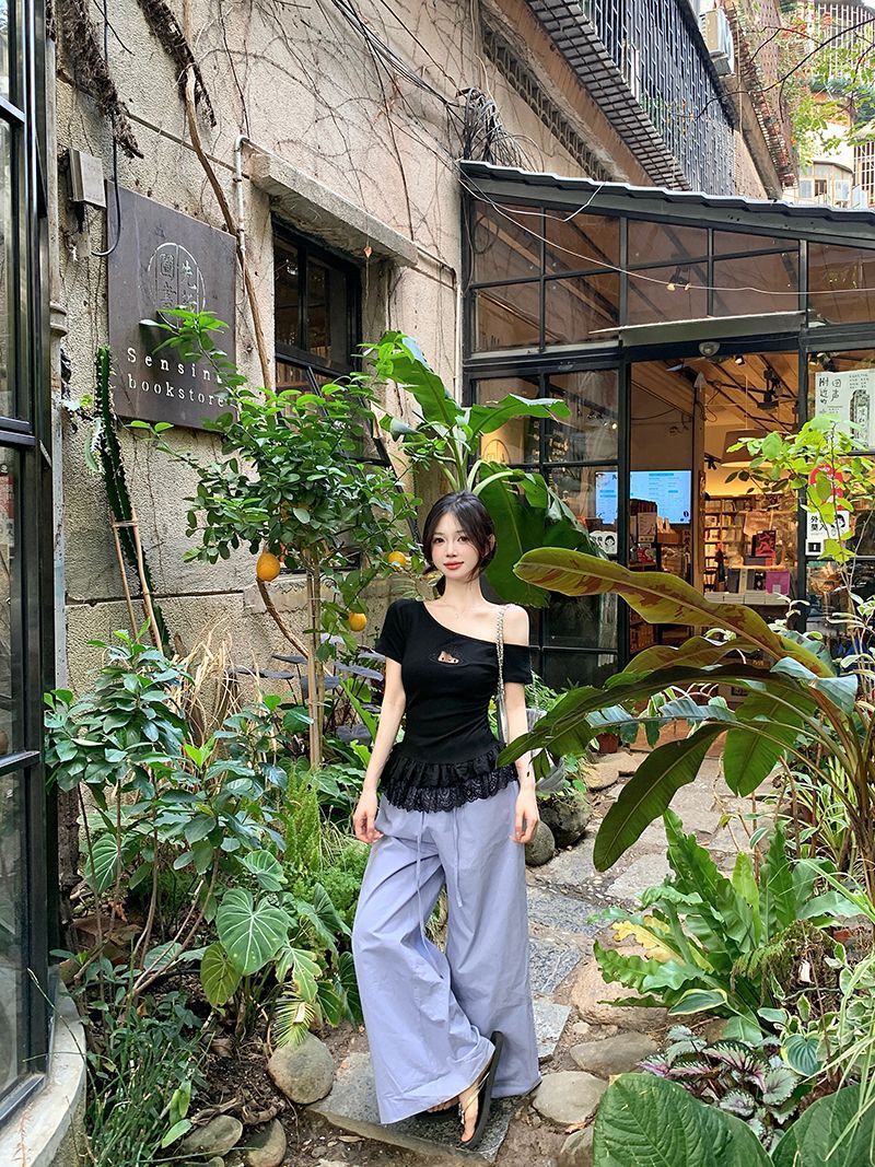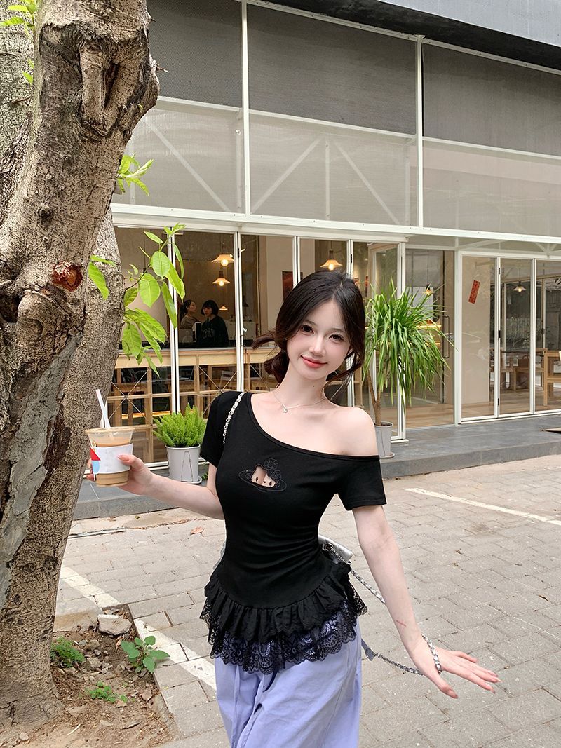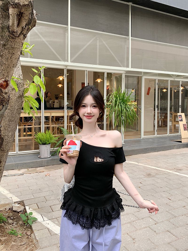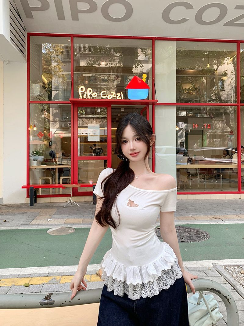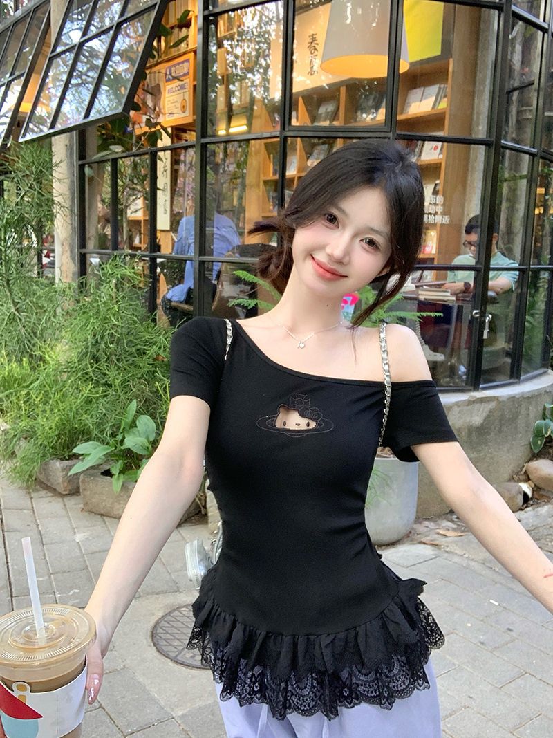 화이트 할로우 키티 슬랜트 어깨 반팔 티셔츠 여성용 여름 레이스 레이스 스위트 스파이스 소녀 짧은 어깨 퓨어 숄더 탑