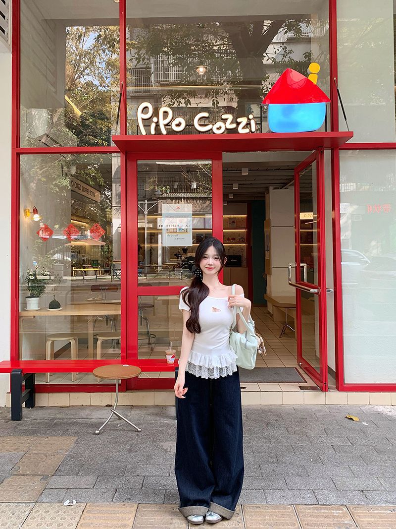 화이트 할로우 키티 슬랜트 어깨 반팔 티셔츠 여성용 여름 레이스 레이스 스위트 스파이스 소녀 짧은 어깨 퓨어 숄더 탑스토어 가기
