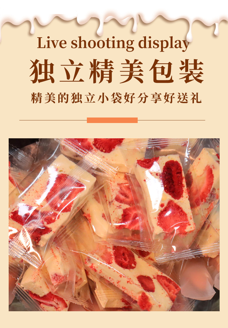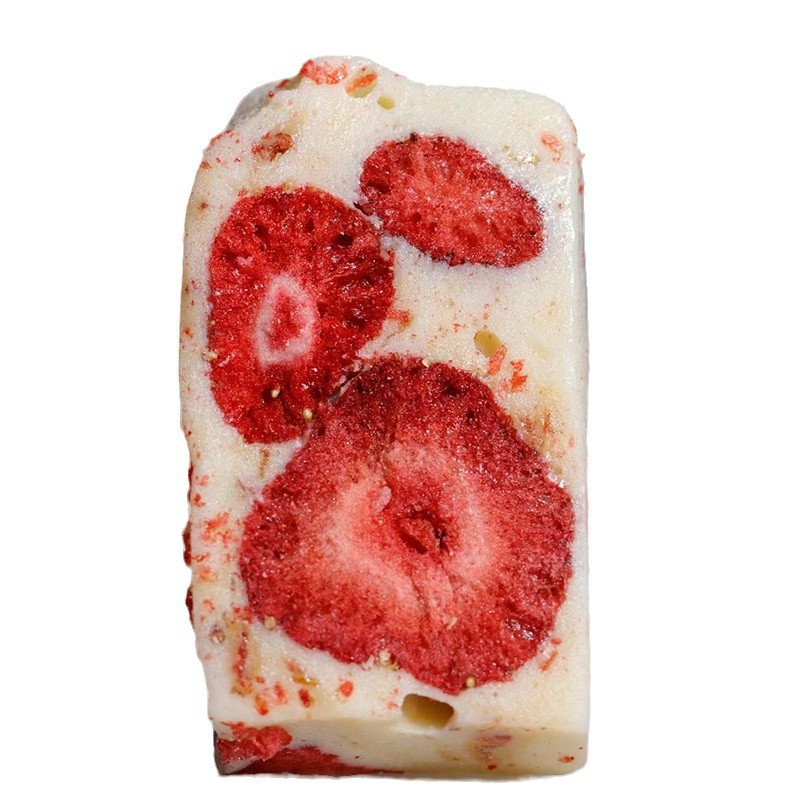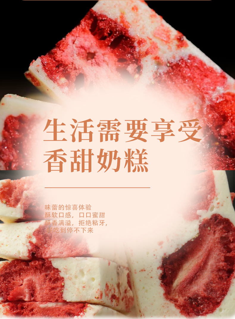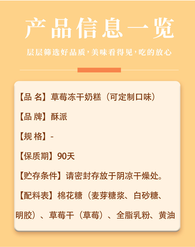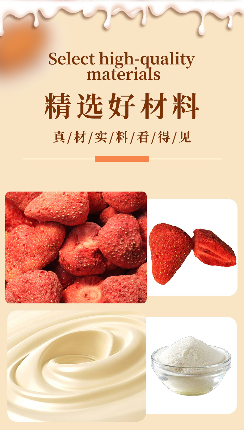 配料表:棉花糖(麦芽糖浆、白砂糖、明胶)、草莓干(草莓)、全脂乳粉、黄油